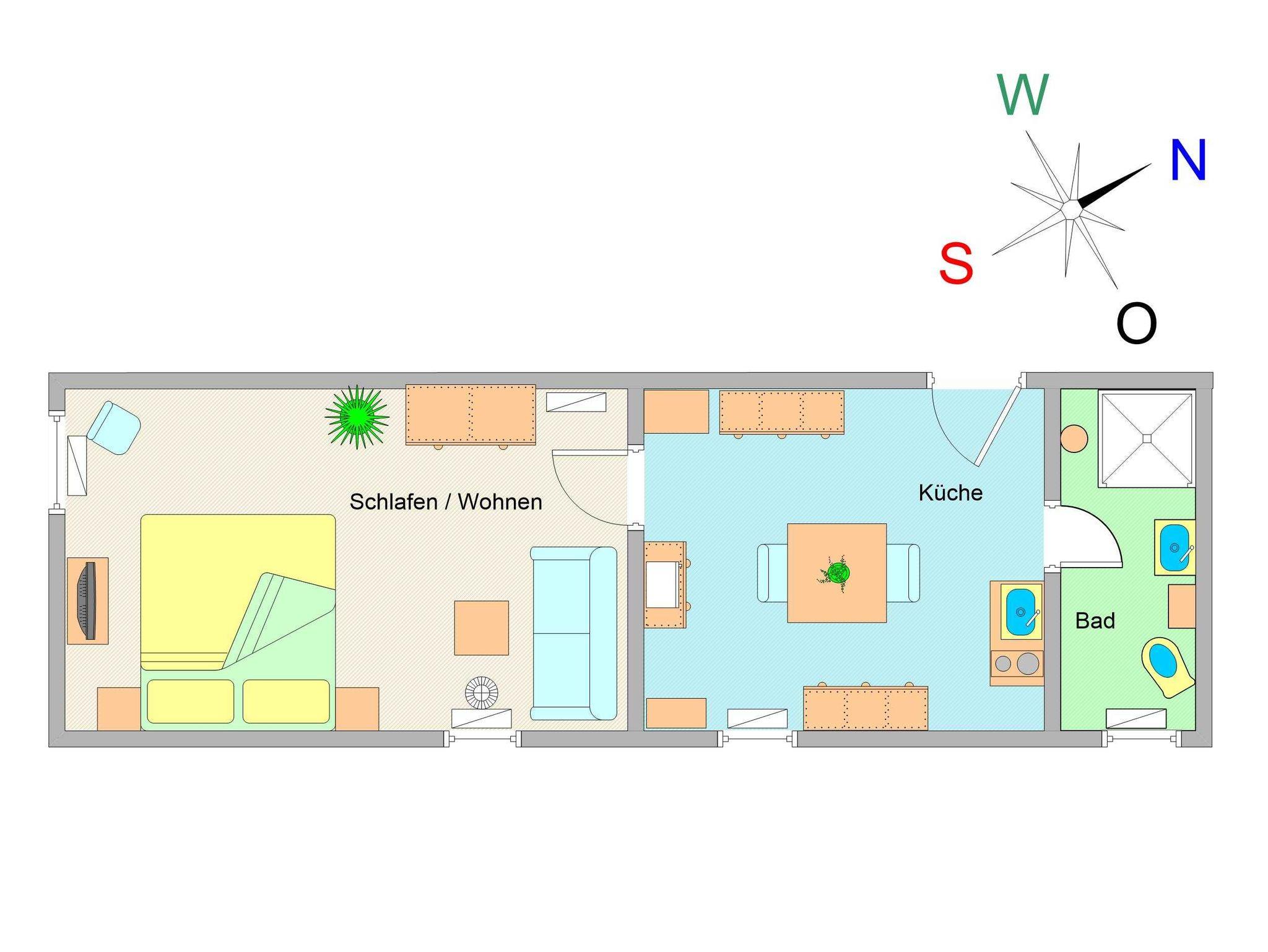 Sie wohnen in einer 2-Raum-Wohnung von ca. 40 qm Größe, die im dritten Obergeschoss (DG) liegt. Das Wohn-/Schlafzimmer ist ausgestattet mit einer Couch und Couchtisch, Kleiderschrank, Doppelbett und TV-Gerät. In der separaten Küchen finden Sie eine Pantry mit 2-Platten-Kochfeld und Kühlschrank, Kaffeemaschine, Wasserkocher, Toaster und Mikrowelle usw. vor. Das Bad mit Dusche und WC vervollständigt das Gesamtbild dieser Wohnung.