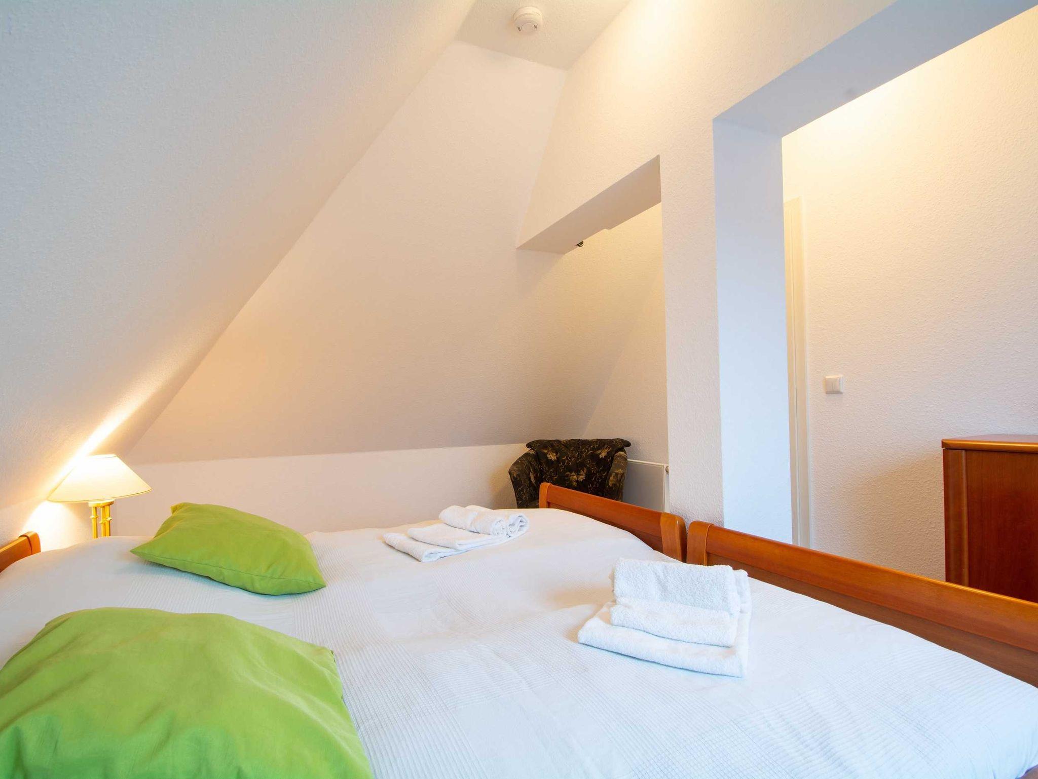 Die gemütlich eingerichtete 4-Raum-Ferienwohnung befindet sich im 3. OG in der Residenz Unter den Linden und erstreckt sich über 2 Etagen. Die lichtdurchflutete Wohnung bietet einen Blick auf den Kühlungsborner Stadtwald und Platz für 4 bis 6 Personen. Im unteren Wohnungsbereich befindet sich der kombinierte Wohn- und Essbereich. Er ist ausgestattet mit einer gemütlichen Couchgarnitur mit Flachbild-TV, einem Esstisch sowie einer voll ausgestatteten Küchenzeile mit allen wichtigen Küchengeräten wie Backofen, 4-Platten-Cerankochfeld und Dunstabzugshaube, Mikrowelle, Geschirrspüler, Kühlschrank mit Gefrierfach, Kaffeemaschine, Wasserkocher, Toaster u.v.m. Auf dieser Etage befinden sich ebenfalls ein Schlafzimmer mit Doppelbett und Kleiderschrank sowie ein modernes gefliestes Badezimmer (renoviert im Frühjahr 2022!) mit großer Dusche und WC. Über eine sich in der Wohnung befindliche Treppe erreichen Sie das zweite Schlafzimmer, welches mit zwei Einzelbetten mit TV ausgestattet ist. Die Einzelbetten können zu einem Doppelbett zusammengestellt werden. Zudem finden Sie hier ein weiteres modernes Badezimmer mit Badewanne (ebenfalls im Frühjahr 2022 renoviert) vor sowie einen weiteren kleinen Wohnbereich, Der Wohnbereich ist mit einer Schlafcouch ausgestattet sowie einem kleinen Essbereich und einer Küchenzeile.