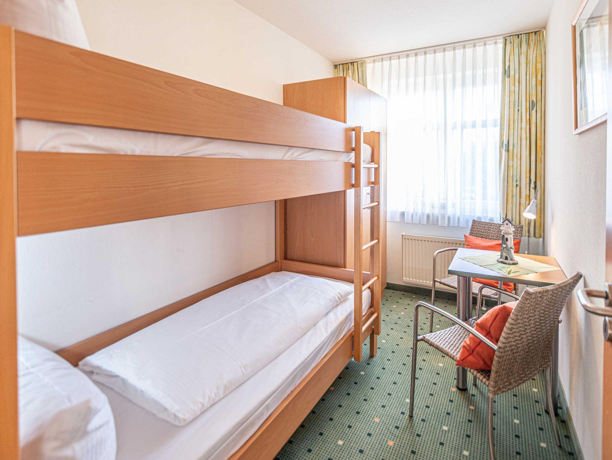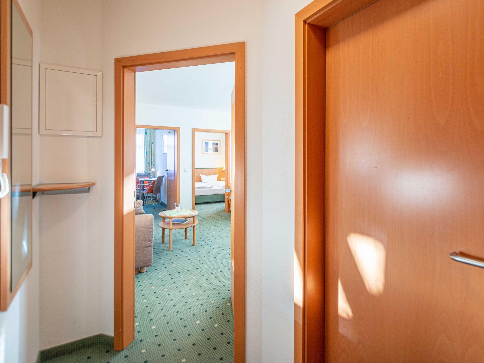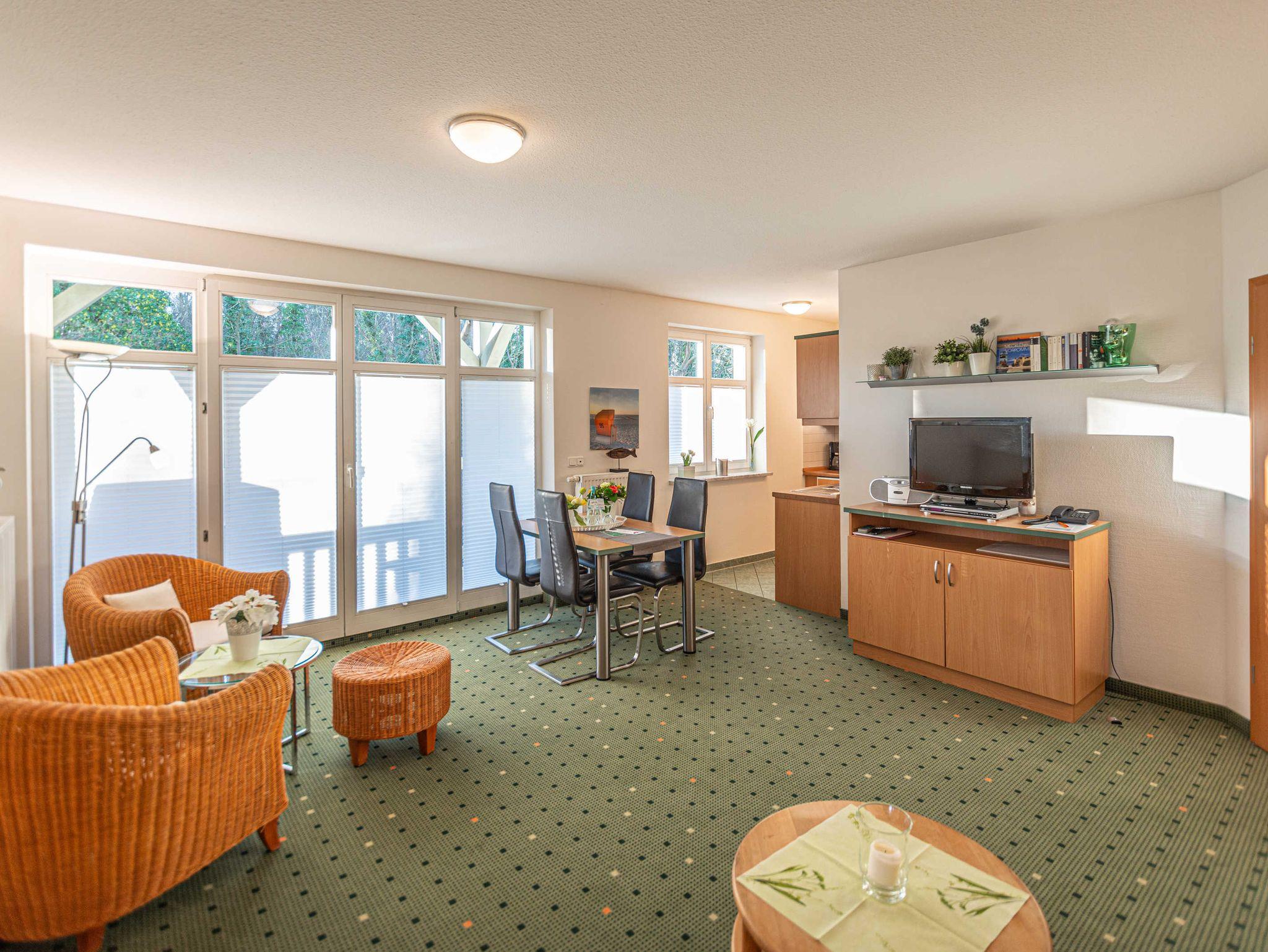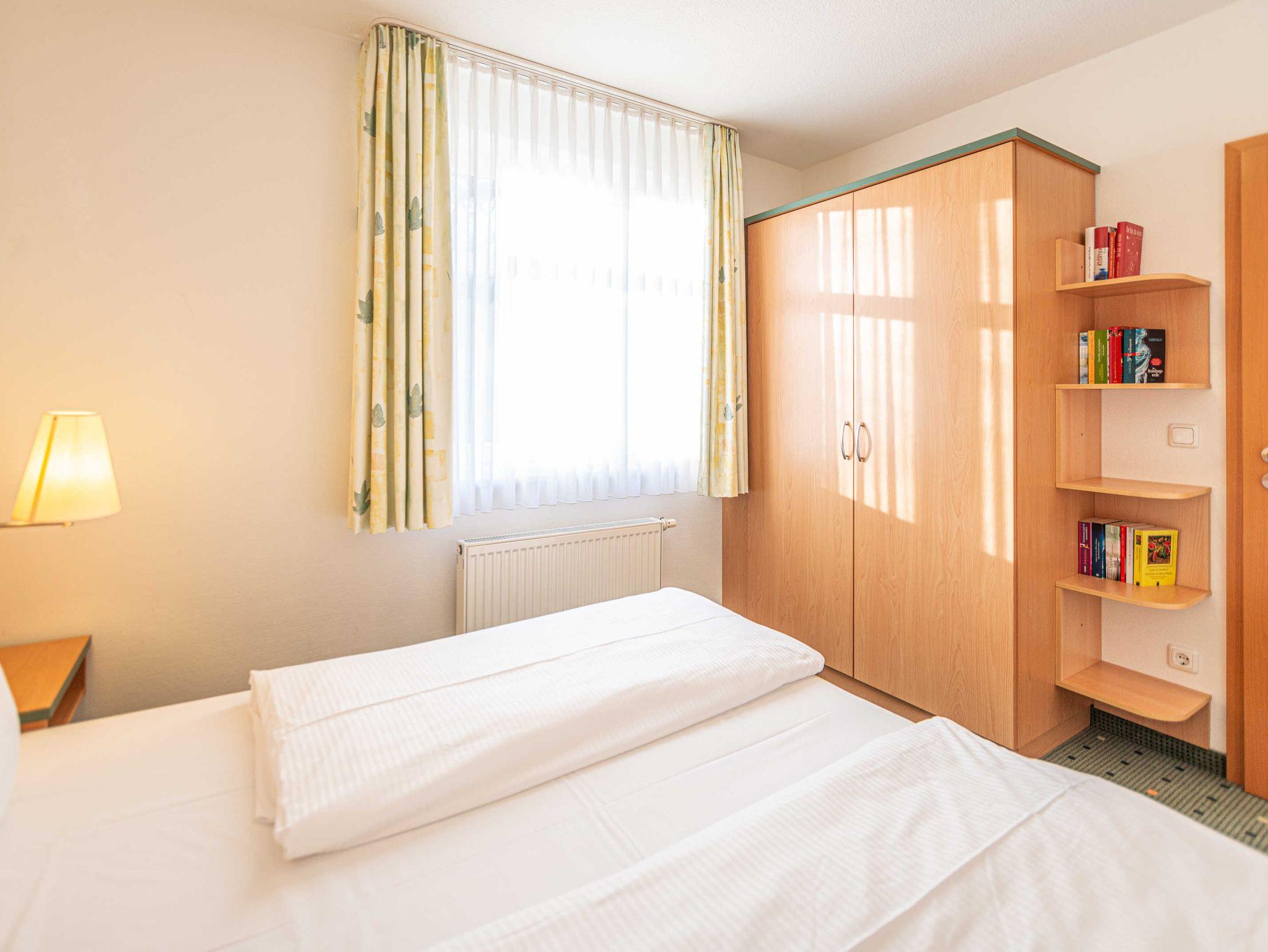 Das 3-Zimmer-Apartment mit Teppichboden befindet sich in der 1.Etage des Apartmenthauses Waldeck. Mit rund 55 m² Wohnfläche und einem Balkon zur Südseite mit Blick zum Stadtwald (sehr ruhige Lage), besteht das geräumige Apartment aus einem Wohnzimmer mit Schlafcouch und einer voll ausgestatteten Küchenzeile mit Geschirrspülmaschine, Kühlschrank, Mikrowelle, Zwei-Platten-Cerankochfeld, Kaffeemaschine, Wasserkocher und einem Toaster. Das Schlafzimmer verfügt über ein Doppelbett sowie ein weiteres Schlafzimmer mit Etagenbett. Im Badezimmer befindet sich eine Badewanne, ein Fön wird Ihnen zur Verfügung gestellt. Das Apartment ist für maximal 4 Personen geeignet.