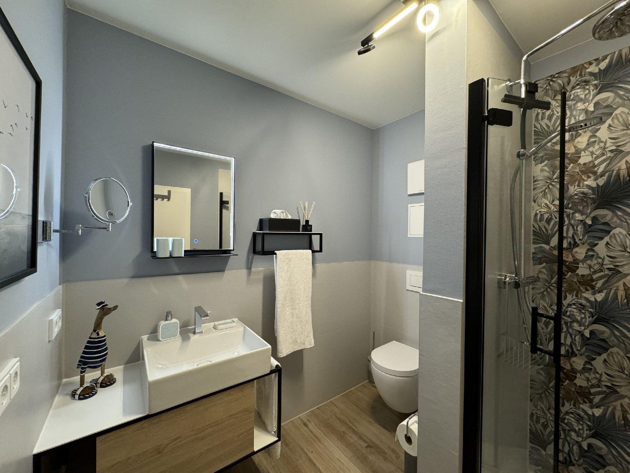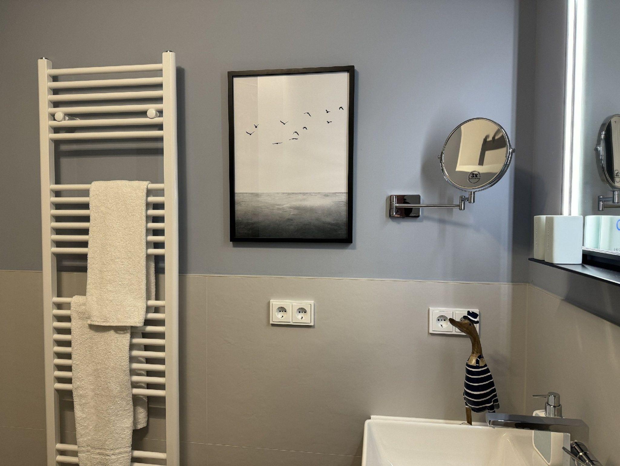 Das geräumige Badezimmer mit seinem großen Waschtisch, einer Regendusche, Fön, Kosmetikspiegel und Ablageflächen runden das Angebot dieser schönen Ferienwohnung ab.