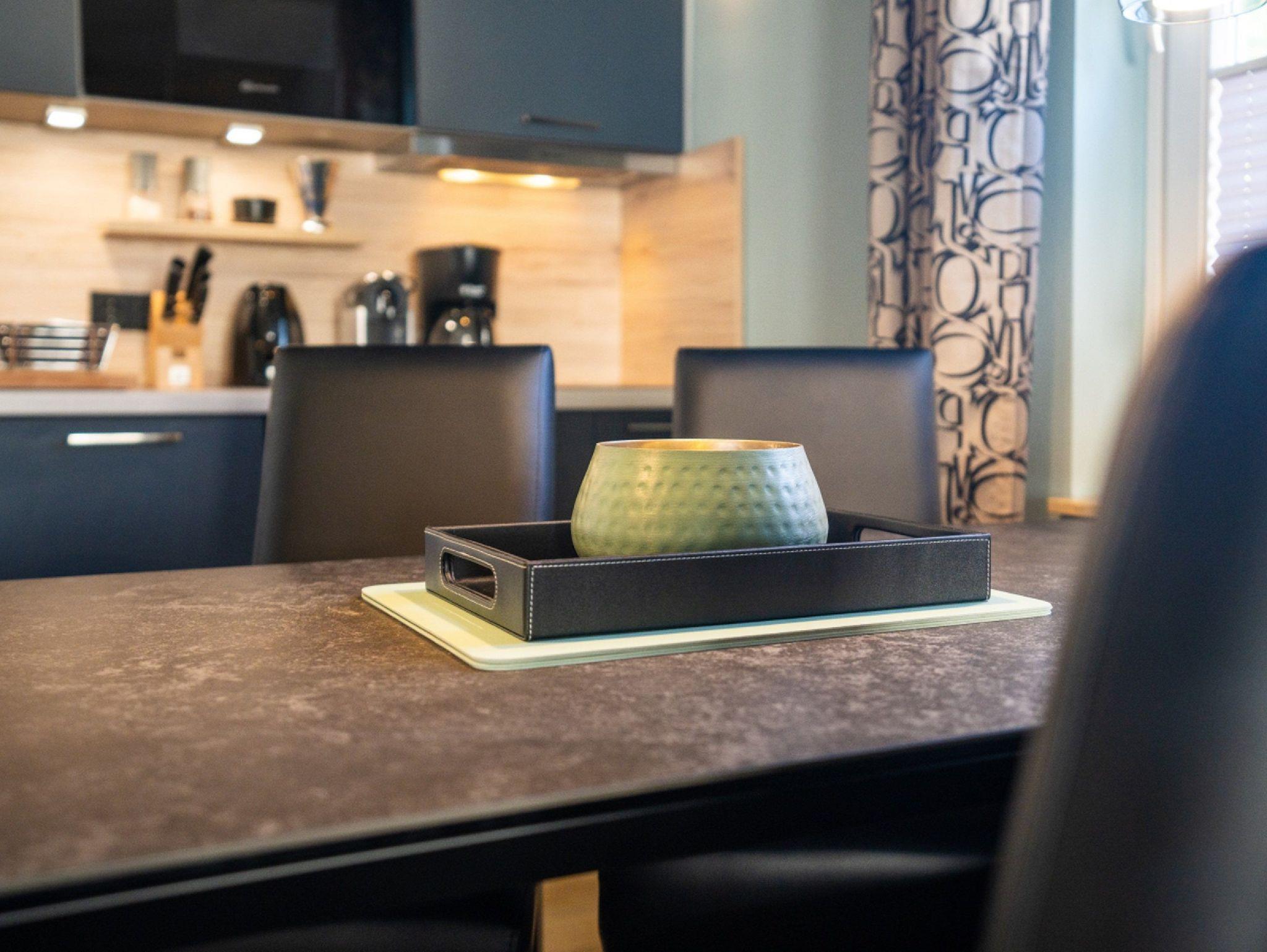 In der modernen Küchenzeile, die im Wohnbereich integriert ist, wurde auf wenig Raum alles untergebracht, was das Herz begehrt. Neben einem Induktions-Kochfeld (2 Kochzonen) sind Ihnen eine Mikrowelle mit Grillfunktion, ein Kühlschrank mit Tiefkühlfach sowie eine Geschirrspülmaschine zu Diensten. Ferner stehen ein Wasserkocher, Toaster, eine Filter-Kaffeemaschine, eine Nespresso Maschine und eine umfangreiche Ausstattung an Küchenutensilien zur Verfügung.
