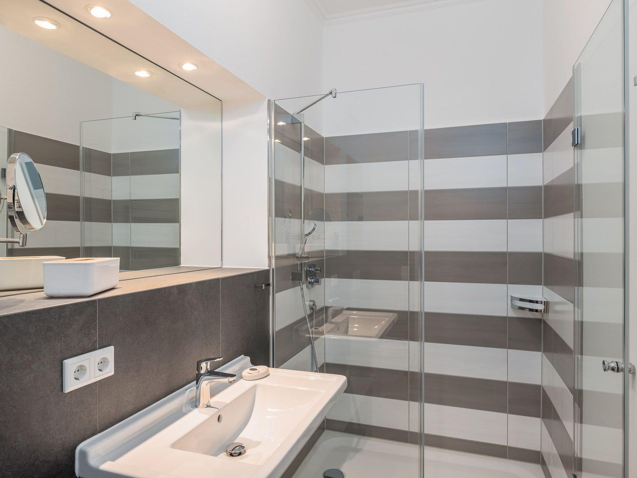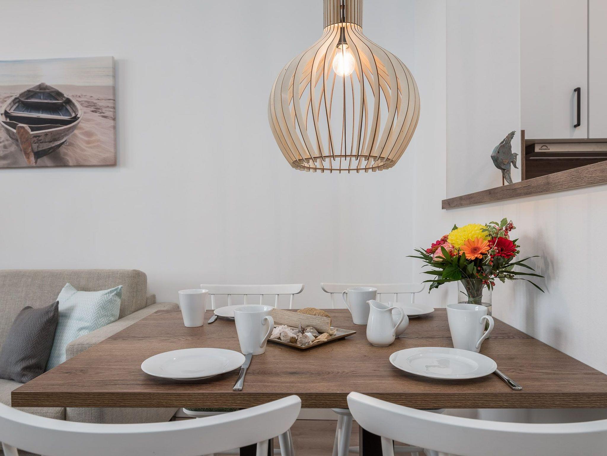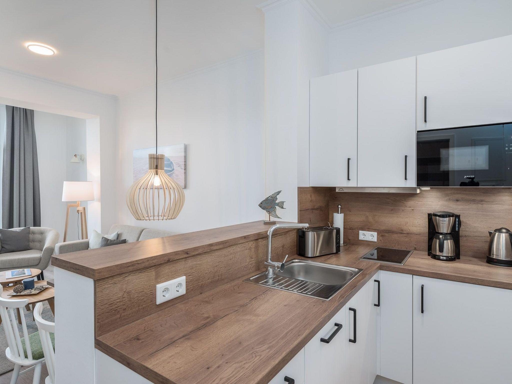 Das Bad verfügt über eine Dusche, einem Haartrockner und einem Handtuchtrockner. Zu Ihrem Apartment gehört ebenfalls ein großer und lichtdurchfluteter Wohn- und Essbereich mit offener Küche.