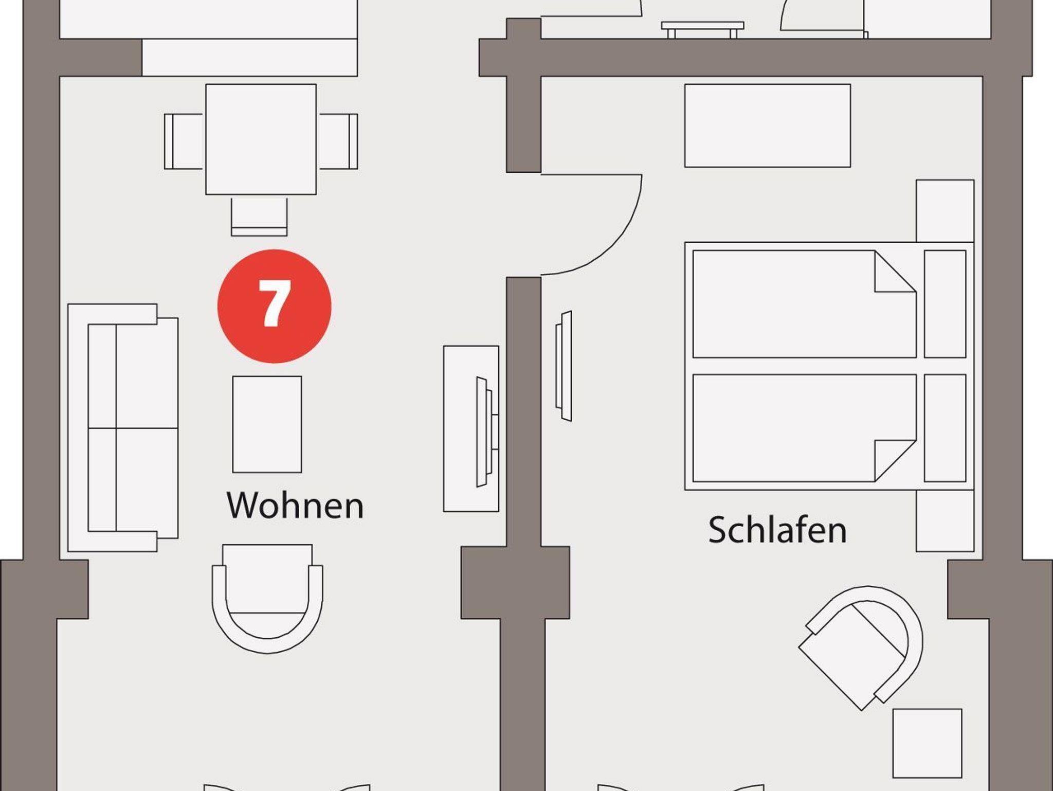 Das Schlafzimmer verfügt über ein 1,80 x 2,00 m Bett, sowie über einen Kleiderschrank und ein TV-Gerät. Die zweite Schlafmöglichkeit ist ein bequemes Schlafsofa mit einer Liegefläche von 1,50 x 1,95 m. Für unsere kleinen Gäste können ein Kinderreisebett und ein Kinderhochstuhl bereitgestellt werden (kostenpflichtig zu buchbar).