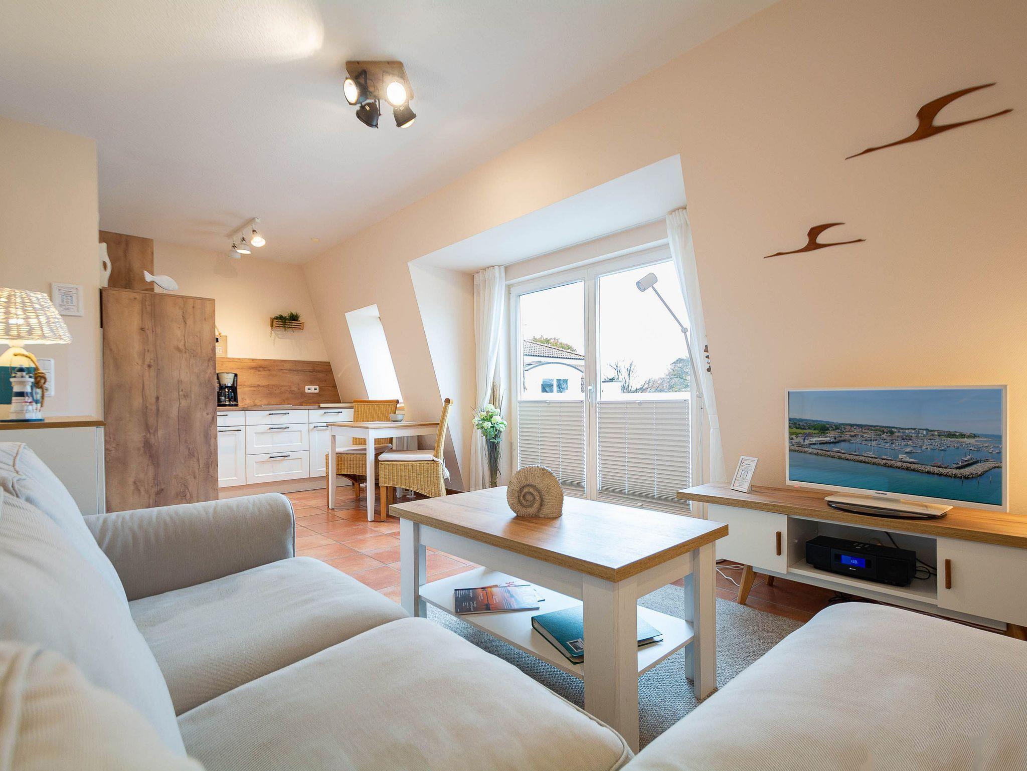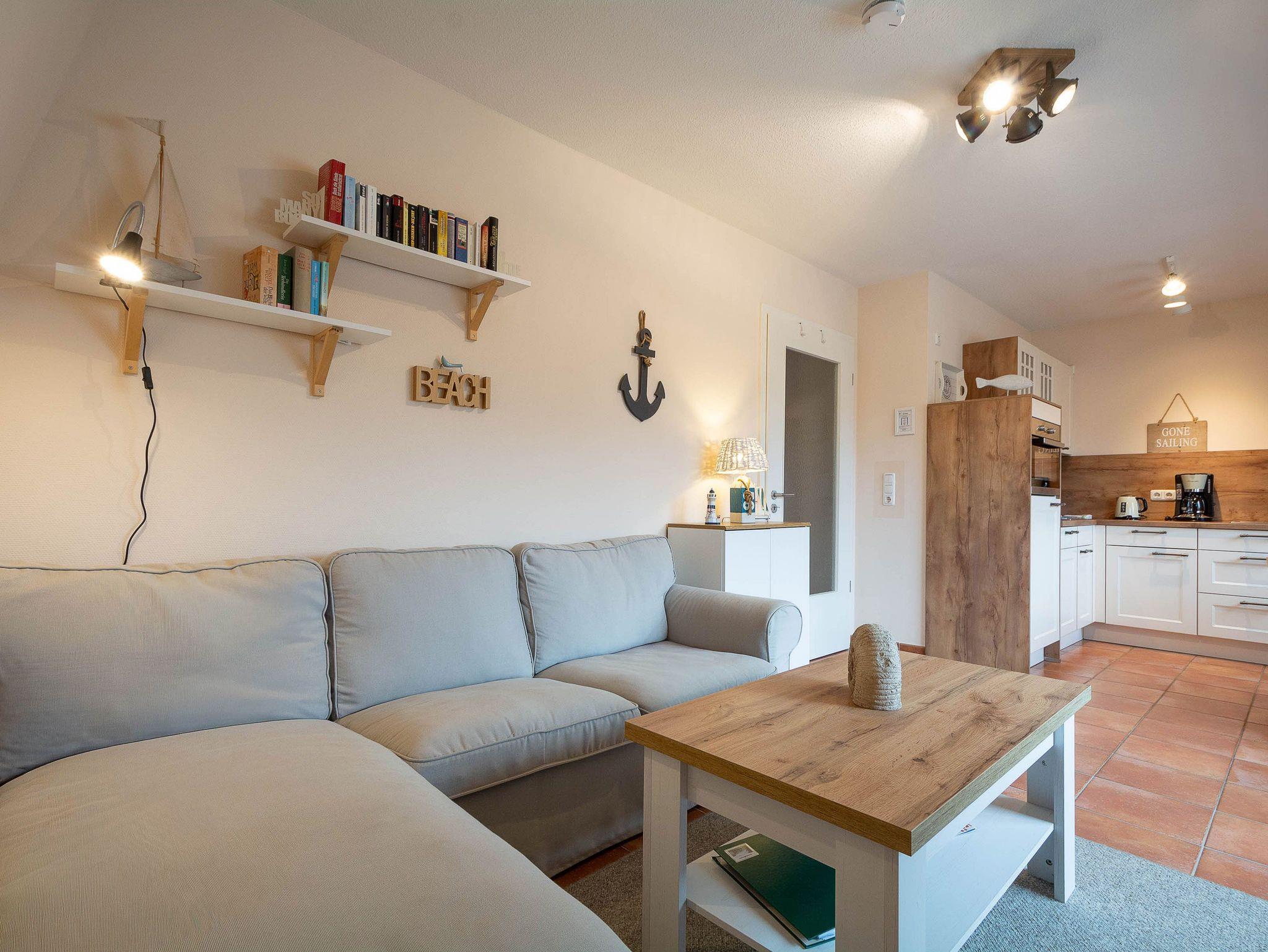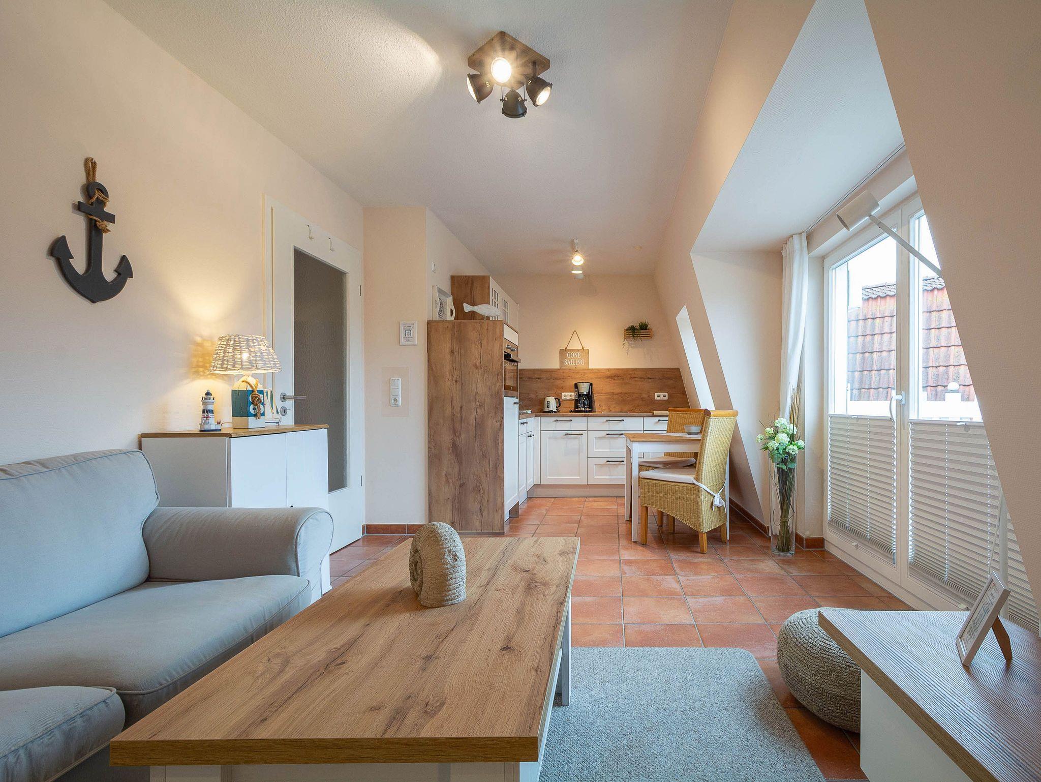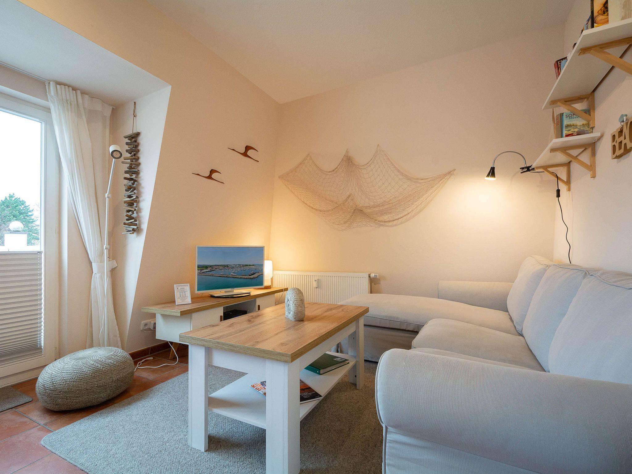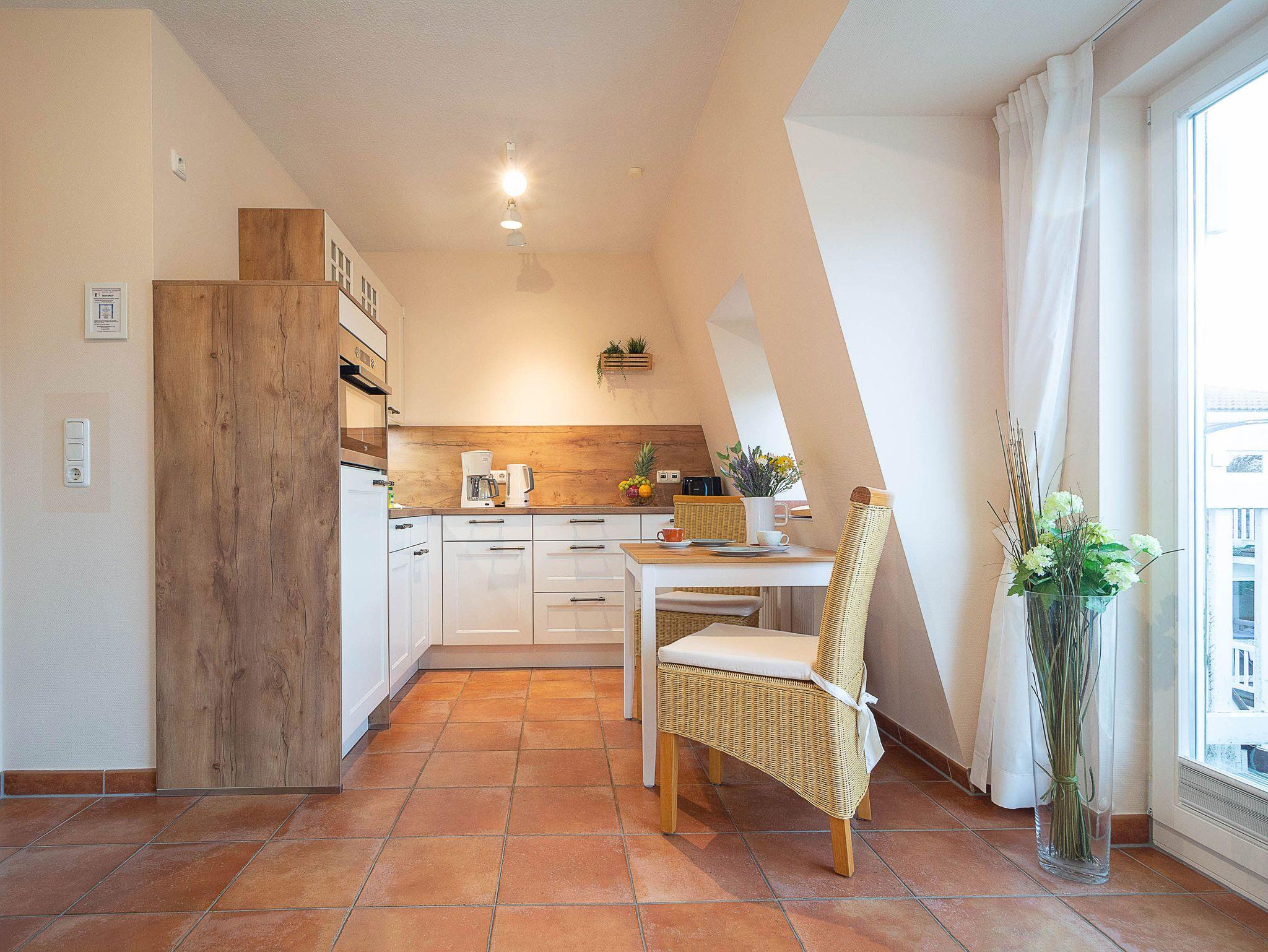 Herzlich willkommen in der Wohnung 22! Die liebevoll und modern eingerichtete Ferienwohnung befindet sich im 2. Obergeschoss der Residenz Strandkrone und ist für 2 Erwachsene geeignet. Das etwa 45qm große Appartement begrüßt Sie mit einem hellen freundlichen Wohnbereich, welcher mit einer gemütlichen Couchgarnitur, einer Stehlampe, 32-Zoll-Flat-TV sowie Radio mit CD-Player ausgestattet ist. Dem Wohnbereich schließt sich ein kleiner Esstisch sowie die offene Küchenzeile an. Die Küche ist ausgestattet mit allen wichtigen Küchengeräten und -utensilien, die Sie für Ihr perfektes Dinner benötigen: 2-Platten-Cerankochfeld, Backofen, Geschirrspüler, Wasserkocher, Kaffeemaschine, Toaster, Kühlschrank u.v.m. sind in der Küche vorhanden. Vom Wohnraum betreten Sie den nach Nord-Westen ausgerichteten Balkon, der zum Verweilen, Sonnenbaden und warmen Sommerabenden zu einem Gläschen Wein einlädt. Der Wohnraum sowie der Flur sind mit Terrakotta-Fliesen gefliest. Das freundliche Schlafzimmer verfügt über ein großes Doppelbett für 2 Personen (1.80m x 2.00m) sowie einen geräumigen Kleiderschrank für Ihre Urlaubsgarderobe. Das geflieste Bad mit Dusche und WC bietet genügend Ablagefläche für Ihre Badutensilien.