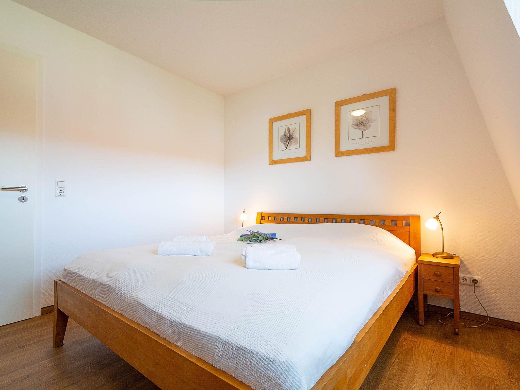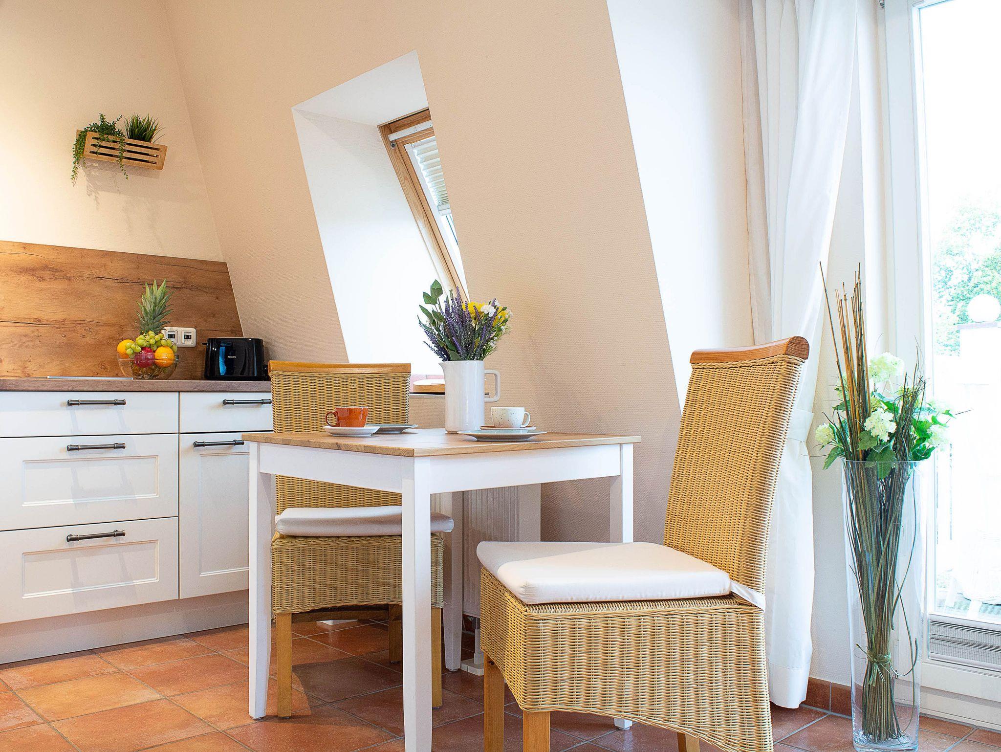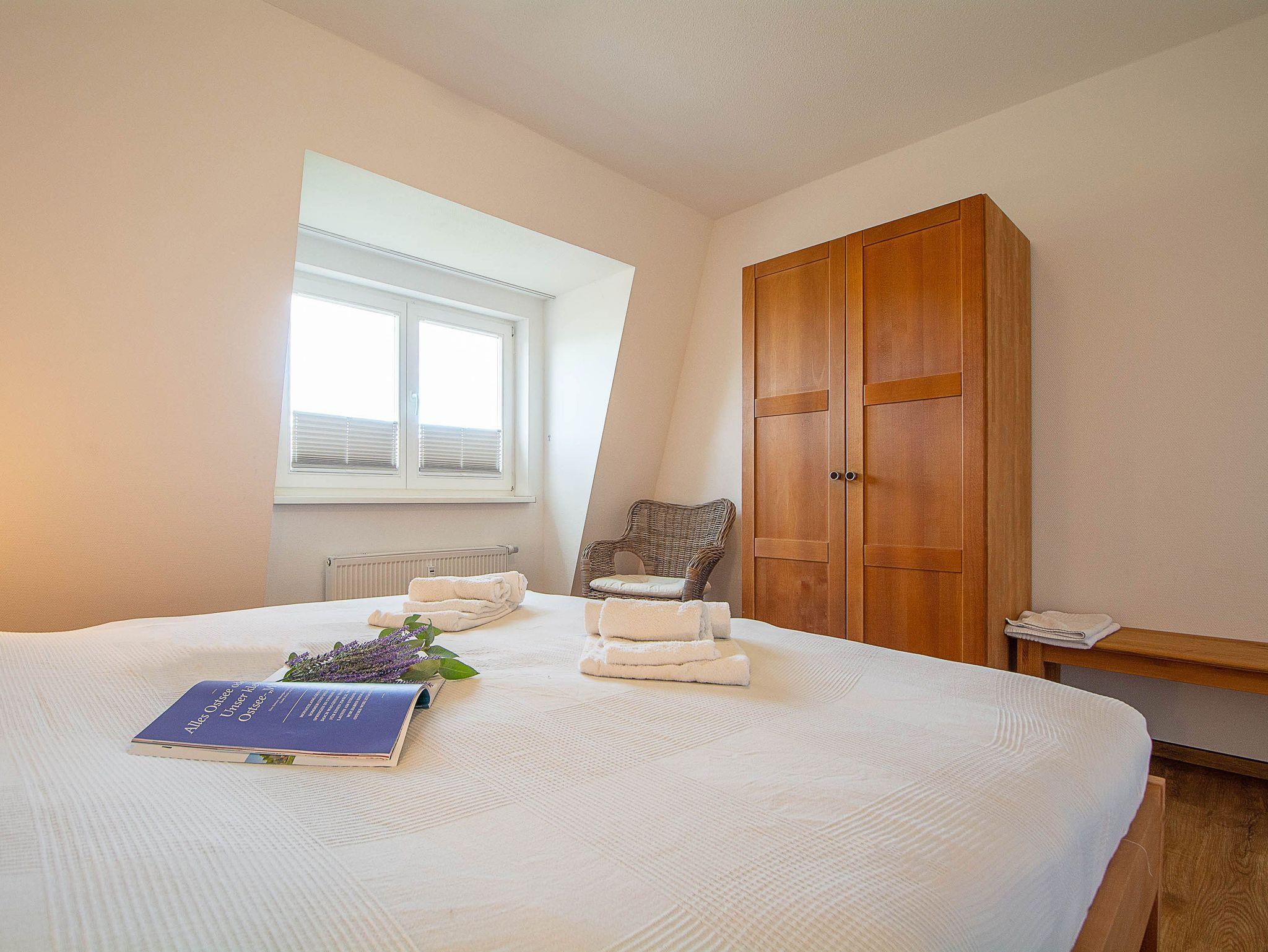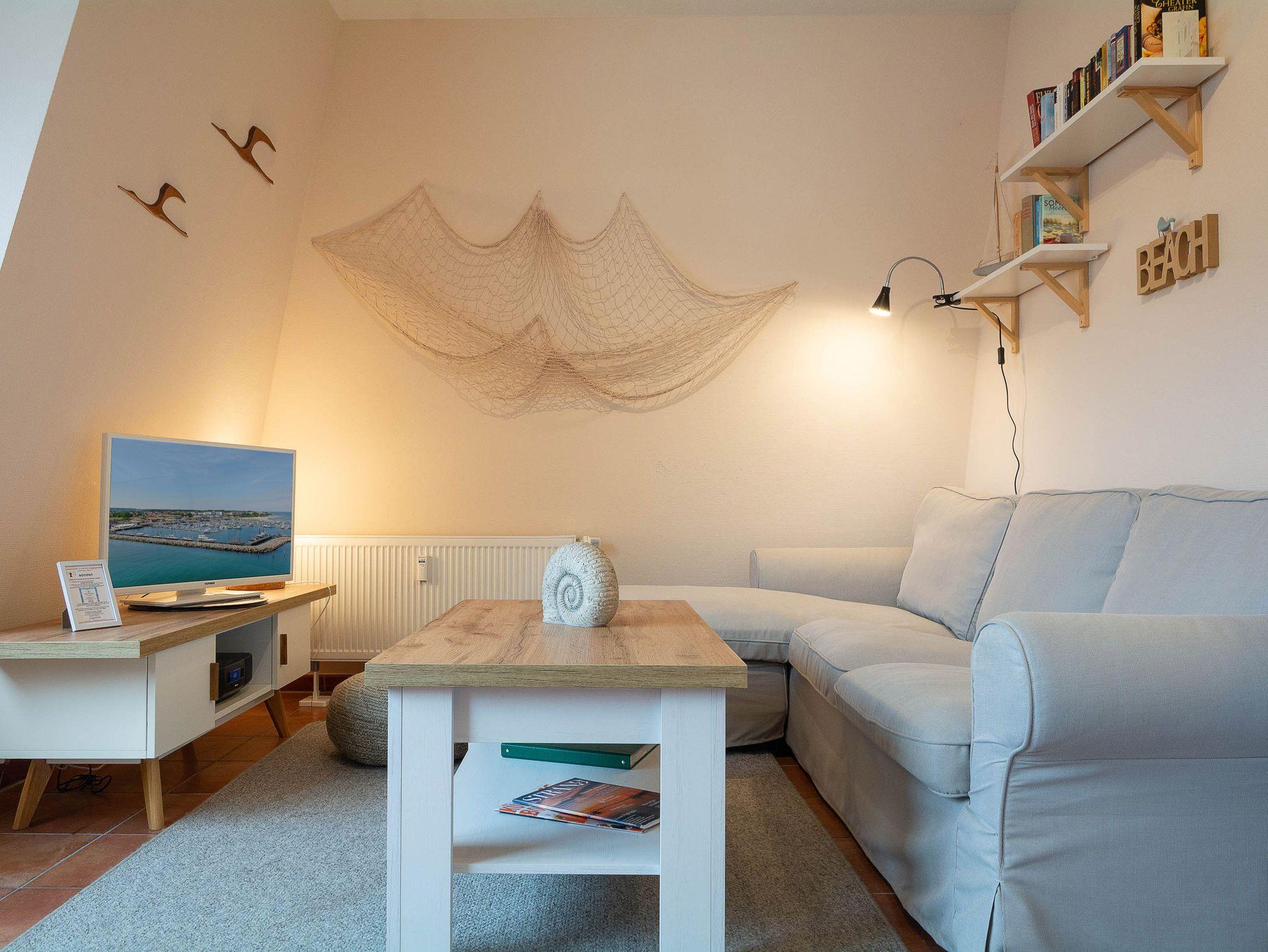 Herzlich willkommen in der Wohnung 22! Die liebevoll und modern eingerichtete Ferienwohnung befindet sich im 2. Obergeschoss der Residenz Strandkrone und ist für 2 Erwachsene geeignet. Das etwa 45qm große Appartement begrüßt Sie mit einem hellen freundlichen Wohnbereich, welcher mit einer gemütlichen Couchgarnitur, einer Stehlampe, 32-Zoll-Flat-TV sowie Radio mit CD-Player ausgestattet ist. Dem Wohnbereich schließt sich ein kleiner Esstisch sowie die offene Küchenzeile an. Die Küche ist ausgestattet mit allen wichtigen Küchengeräten und -utensilien, die Sie für Ihr perfektes Dinner benötigen: 2-Platten-Cerankochfeld, Backofen, Geschirrspüler, Wasserkocher, Kaffeemaschine, Toaster, Kühlschrank u.v.m. sind in der Küche vorhanden. Vom Wohnraum betreten Sie den nach Nord-Westen ausgerichteten Balkon, der zum Verweilen, Sonnenbaden und warmen Sommerabenden zu einem Gläschen Wein einlädt. Der Wohnraum sowie der Flur sind mit Terrakotta-Fliesen gefliest. Das freundliche Schlafzimmer verfügt über ein großes Doppelbett für 2 Personen (1.80m x 2.00m) sowie einen geräumigen Kleiderschrank für Ihre Urlaubsgarderobe. Das geflieste Bad mit Dusche und WC bietet genügend Ablagefläche für Ihre Badutensilien.