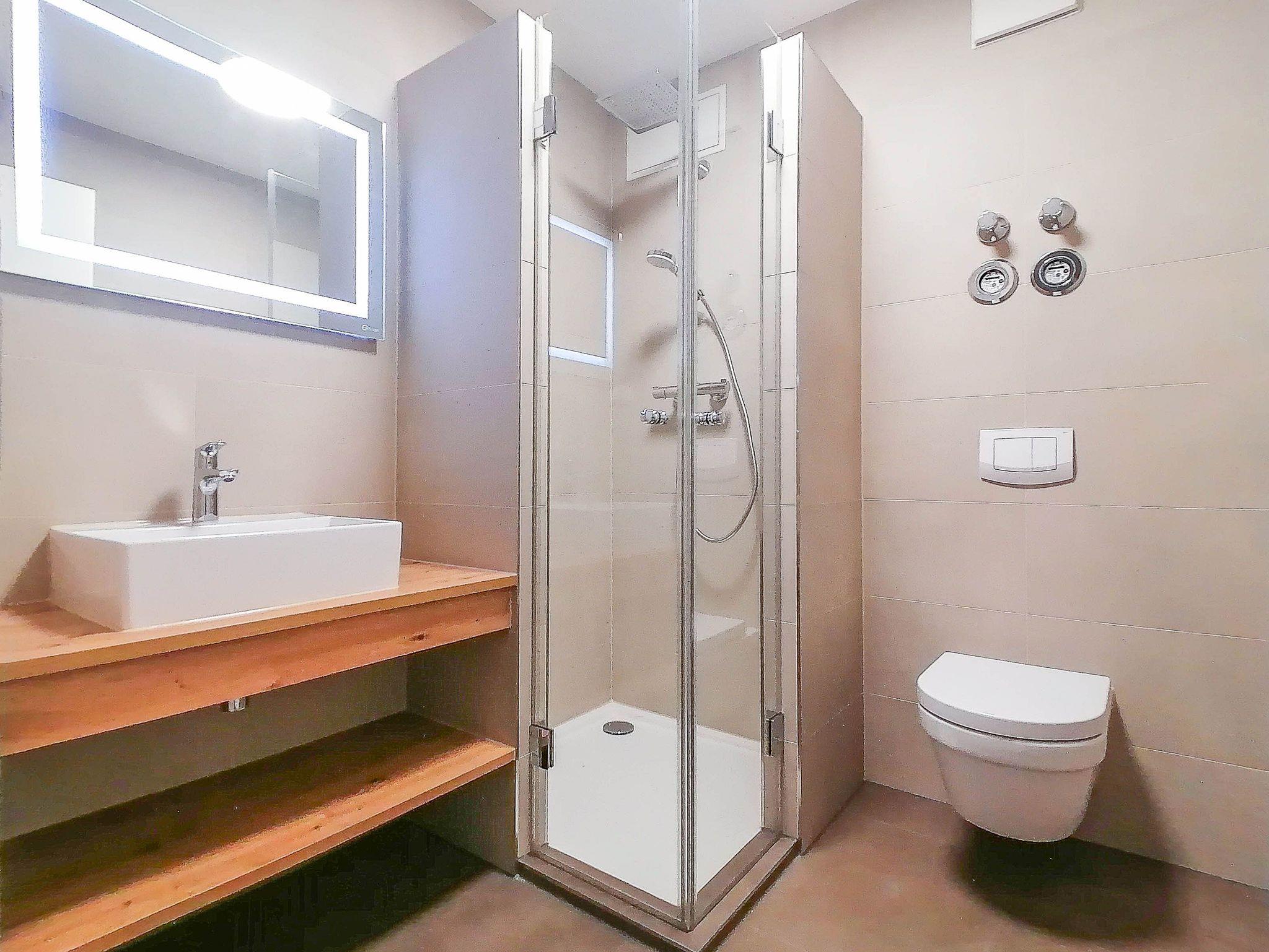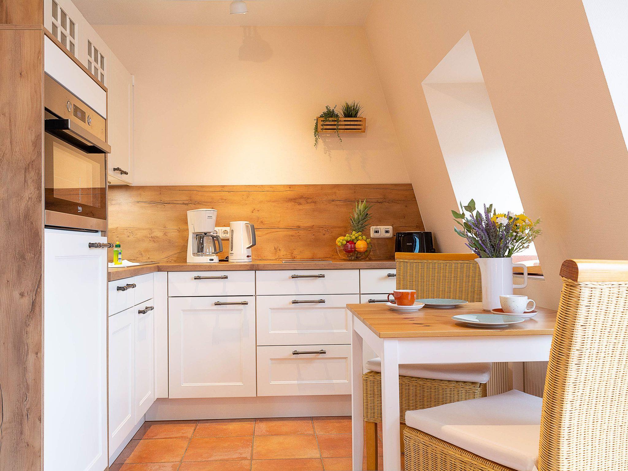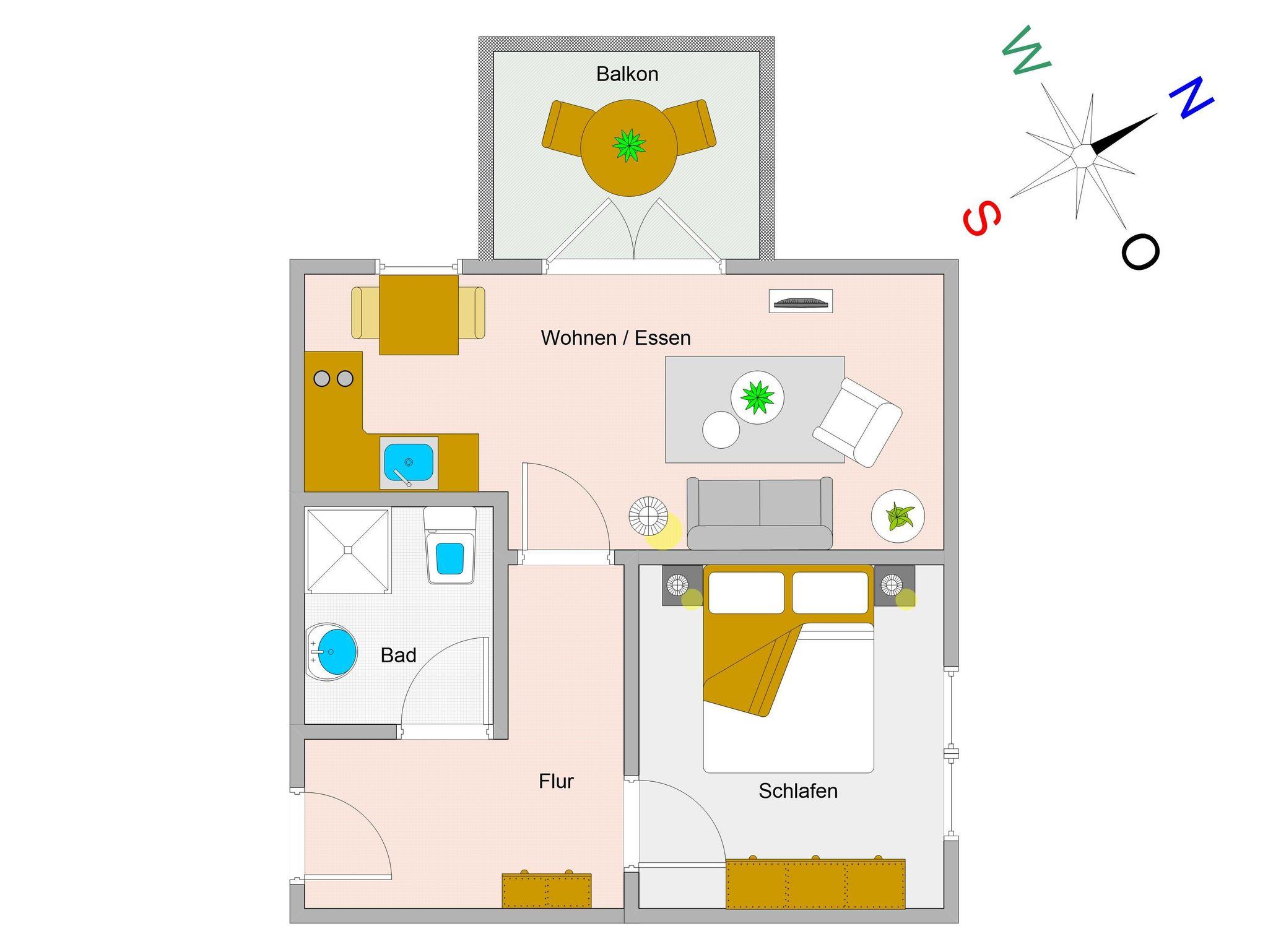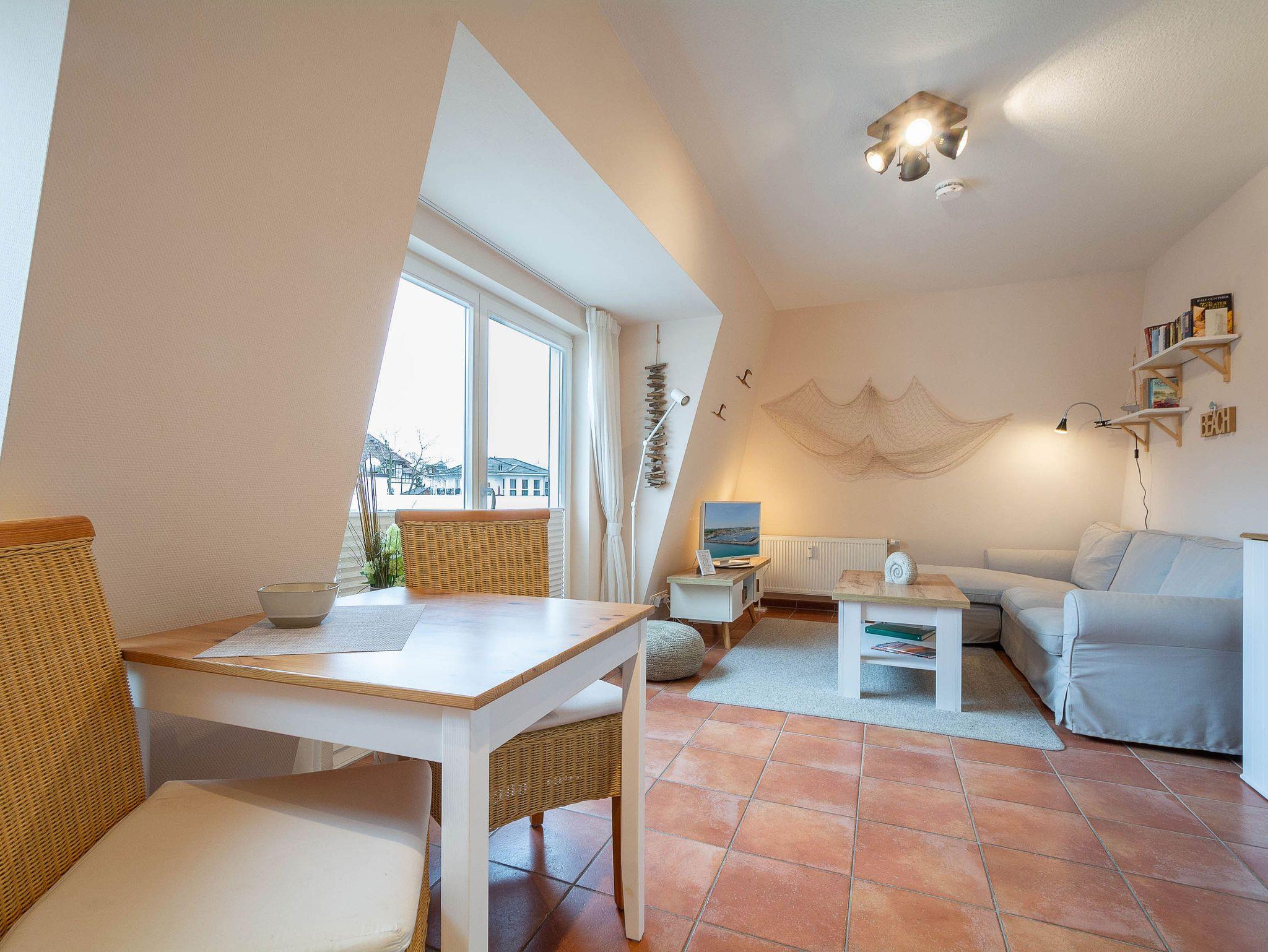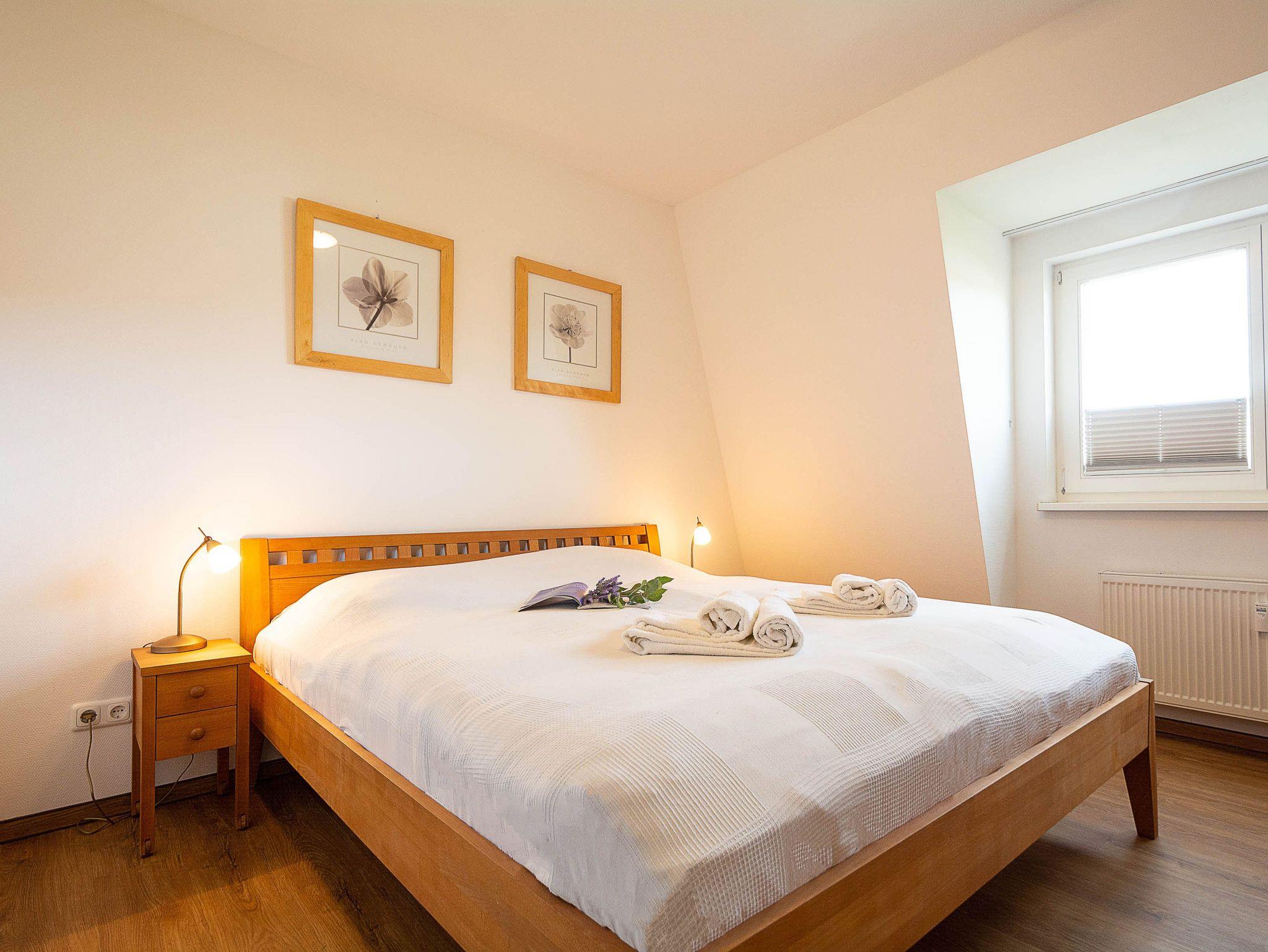 Herzlich willkommen in der Wohnung 22! Die liebevoll und modern eingerichtete Ferienwohnung befindet sich im 2. Obergeschoss der Residenz Strandkrone und ist für 2 Erwachsene geeignet. Das etwa 45qm große Appartement begrüßt Sie mit einem hellen freundlichen Wohnbereich, welcher mit einer gemütlichen Couchgarnitur, einer Stehlampe, 32-Zoll-Flat-TV sowie Radio mit CD-Player ausgestattet ist. Dem Wohnbereich schließt sich ein kleiner Esstisch sowie die offene Küchenzeile an. Die Küche ist ausgestattet mit allen wichtigen Küchengeräten und -utensilien, die Sie für Ihr perfektes Dinner benötigen: 2-Platten-Cerankochfeld, Backofen, Geschirrspüler, Wasserkocher, Kaffeemaschine, Toaster, Kühlschrank u.v.m. sind in der Küche vorhanden. Vom Wohnraum betreten Sie den nach Nord-Westen ausgerichteten Balkon, der zum Verweilen, Sonnenbaden und warmen Sommerabenden zu einem Gläschen Wein einlädt. Der Wohnraum sowie der Flur sind mit Terrakotta-Fliesen gefliest. Das freundliche Schlafzimmer verfügt über ein großes Doppelbett für 2 Personen (1.80m x 2.00m) sowie einen geräumigen Kleiderschrank für Ihre Urlaubsgarderobe. Das geflieste Bad mit Dusche und WC bietet genügend Ablagefläche für Ihre Badutensilien.