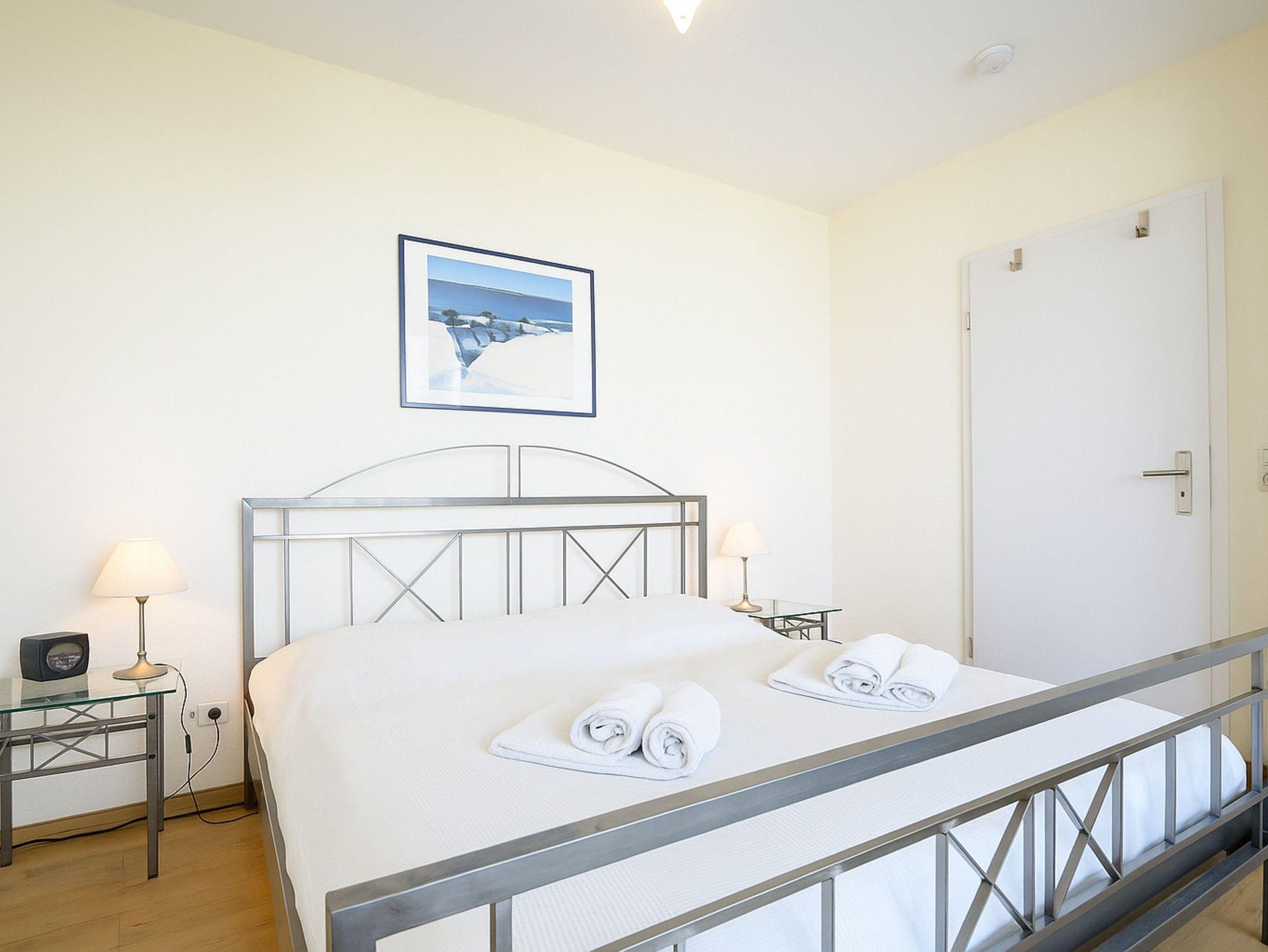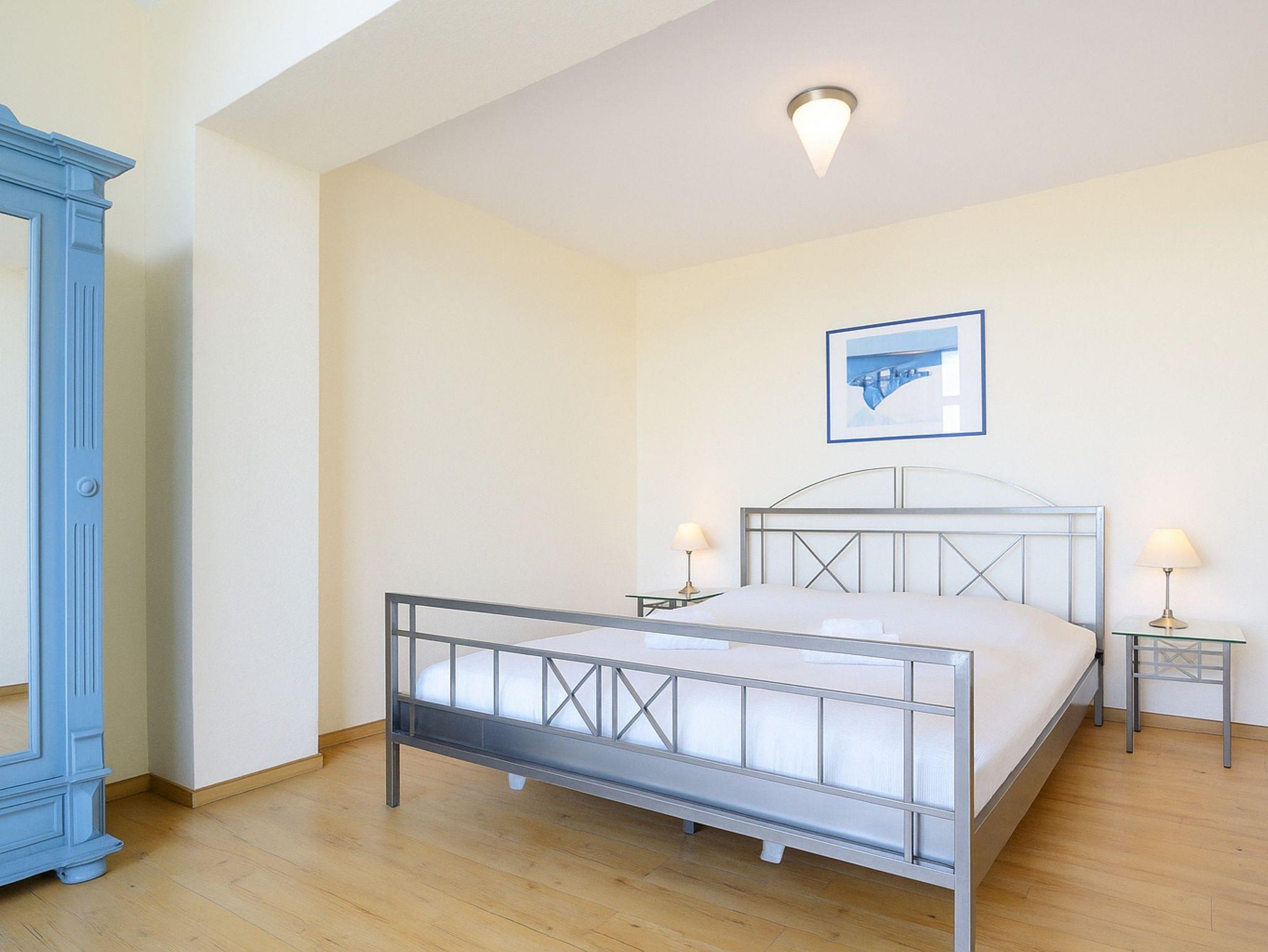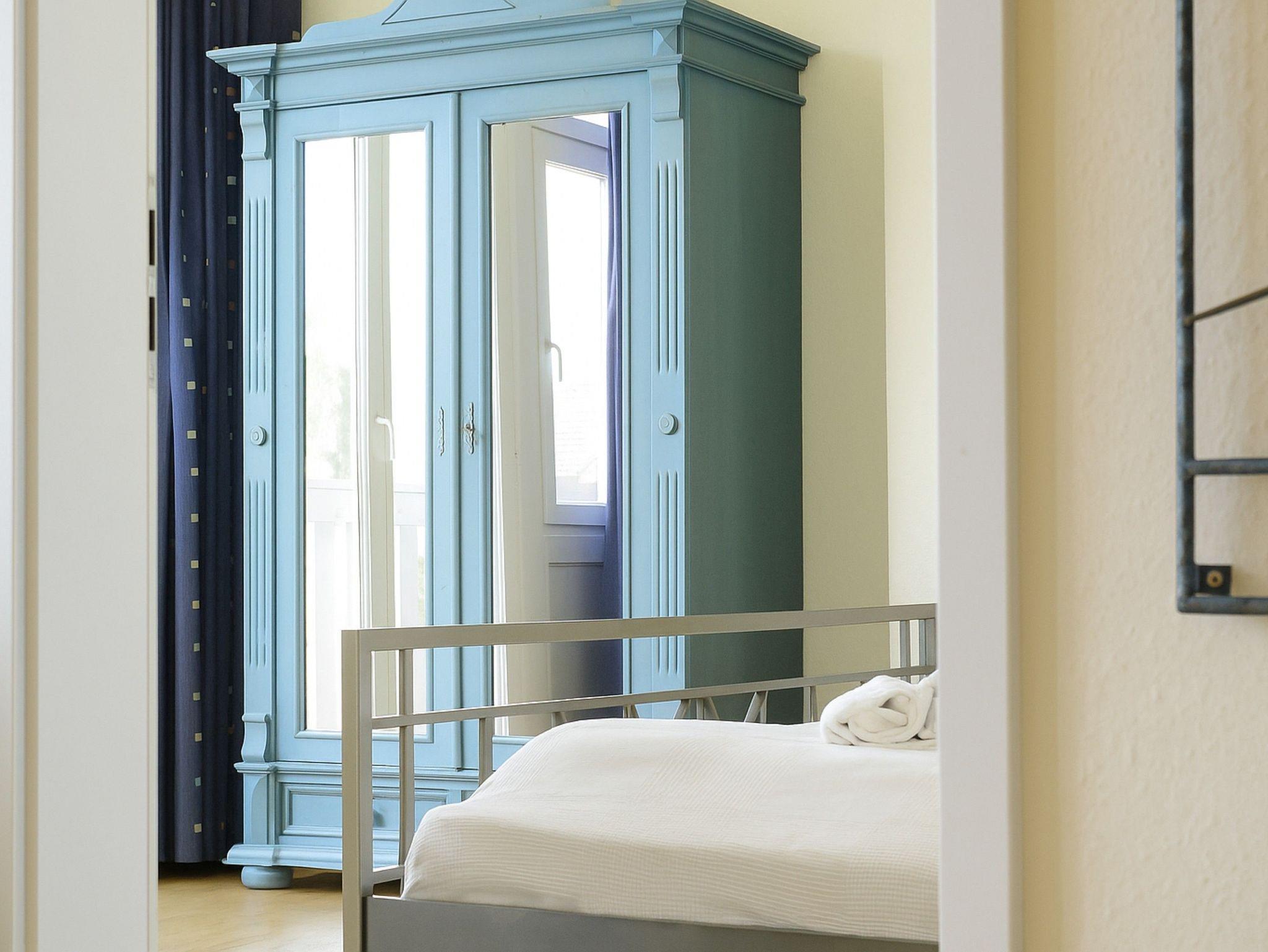 Das helle Schlafzimmer überzeugt mit einem komfortablen Doppelbett und einem rustikalen Kleiderschrank mit Ganzkörperspiegel. Ein Radiowecker sorgt dafür, dass Sie erfrischt in den Tag starten können.