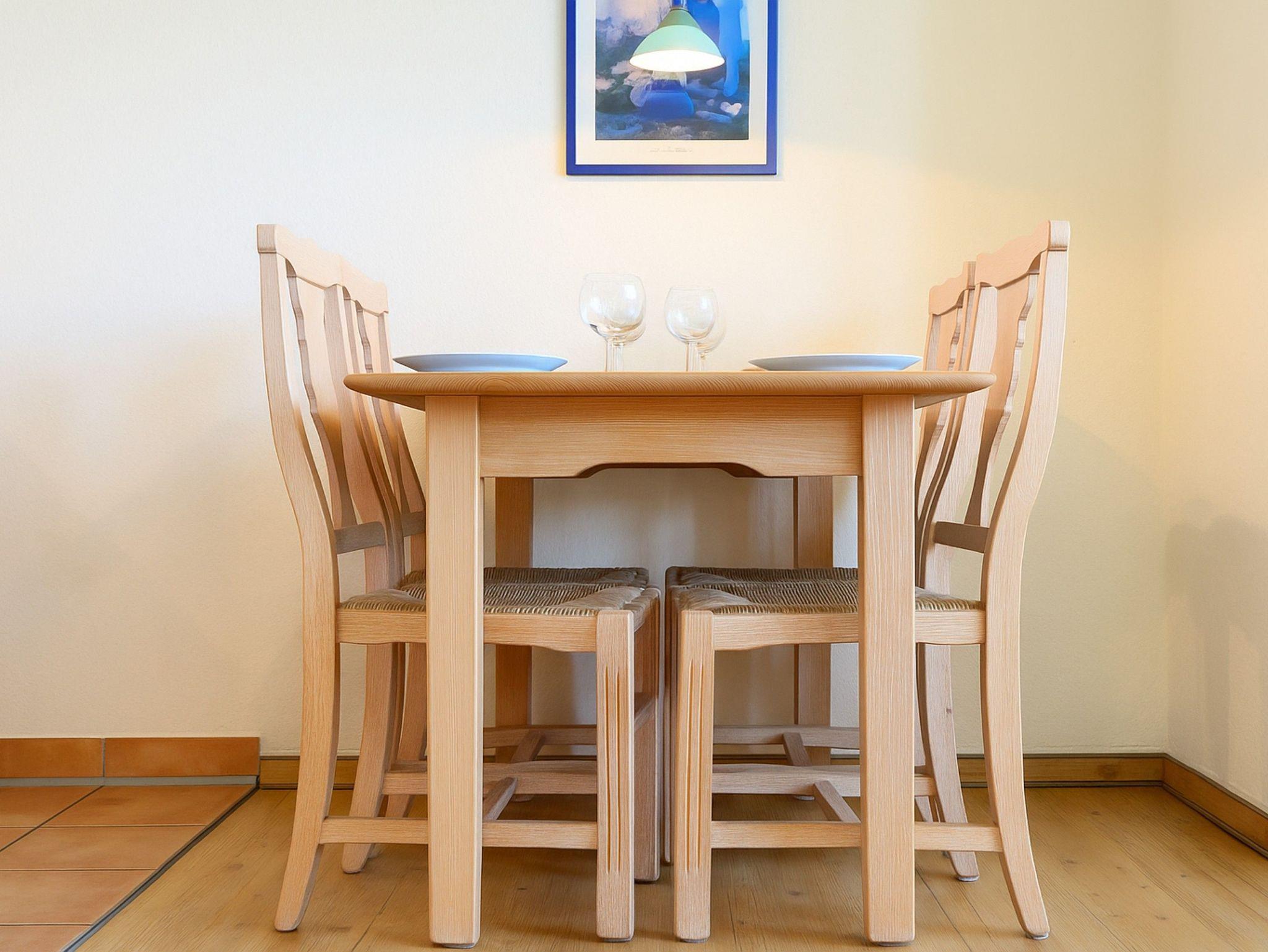 Der Wohnbereich lädt mit einer gemütlichen Schlafcouch zum Entspannen ein. Ein Flachbild-TV, ein Radio sowie der Esstisch im Landhausstil mit vier Stühlen machen diesen Raum besonders einladend für gemeinsame Mahlzeiten und gemütliche Stunden.