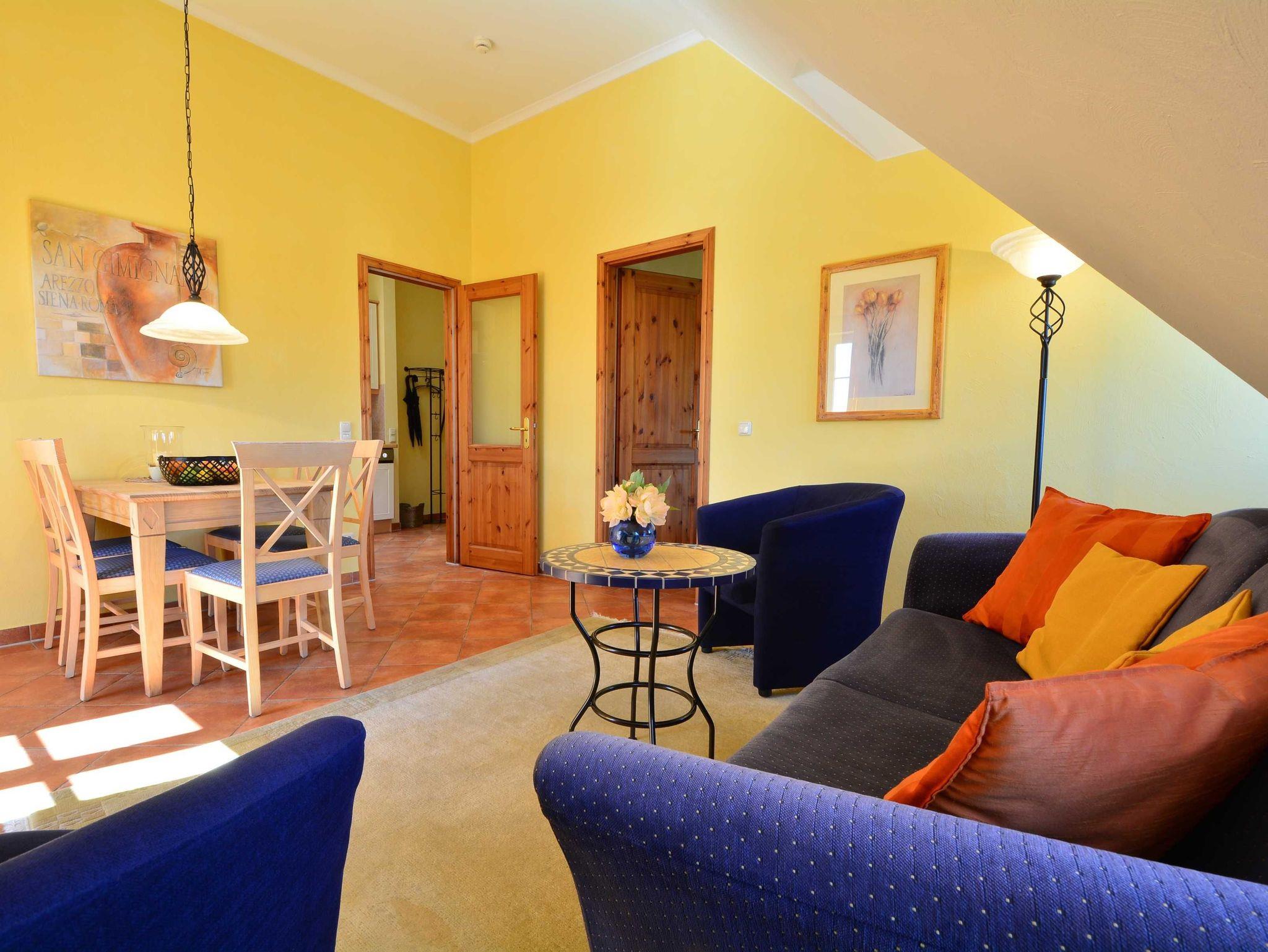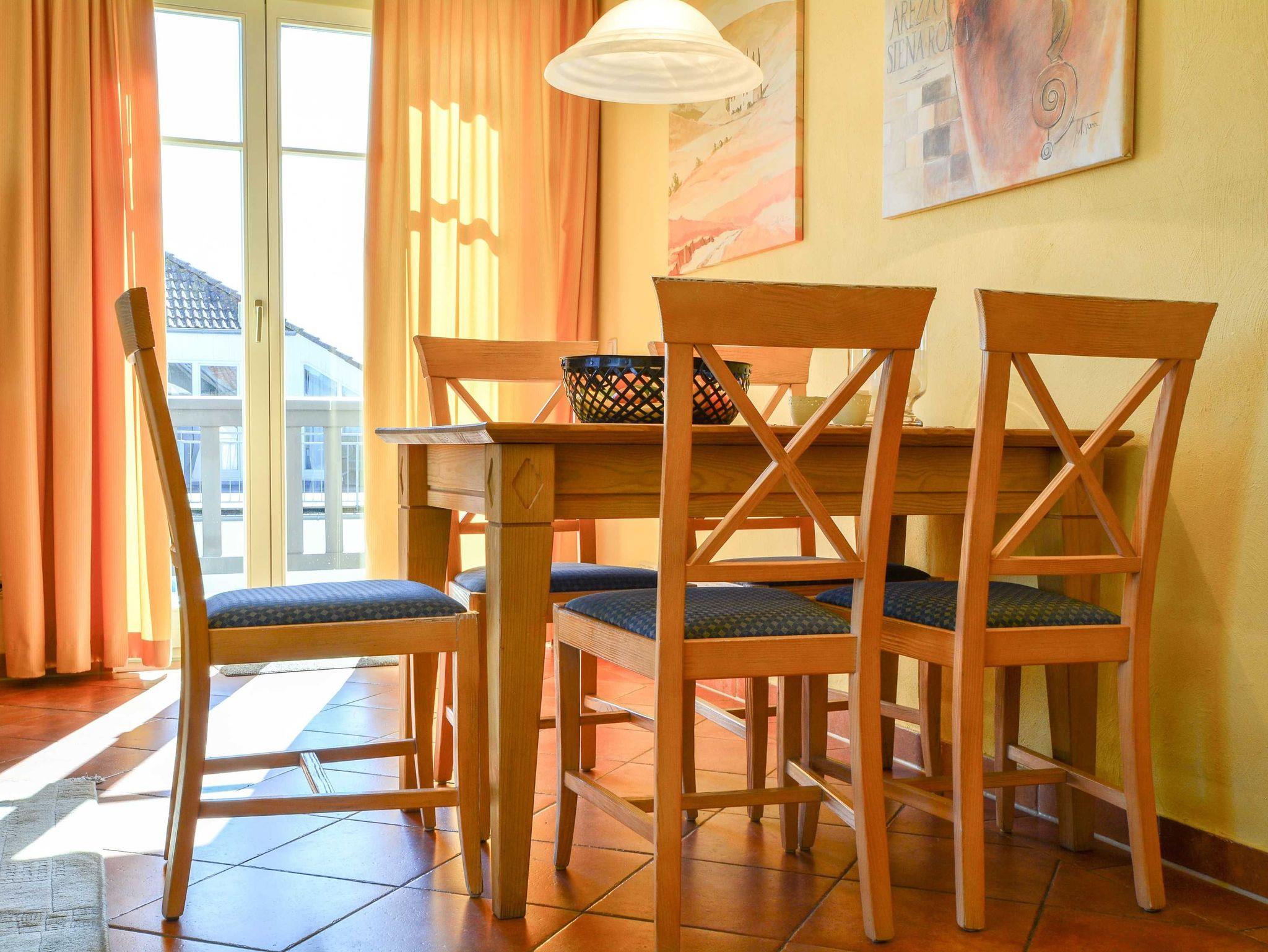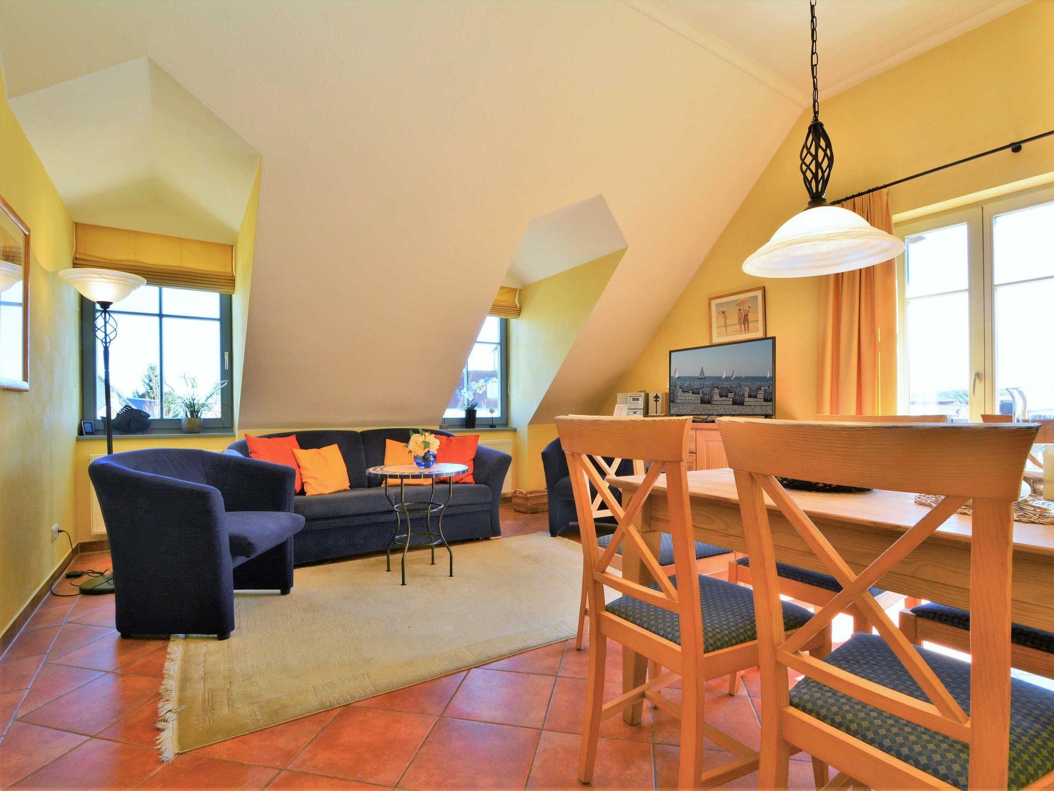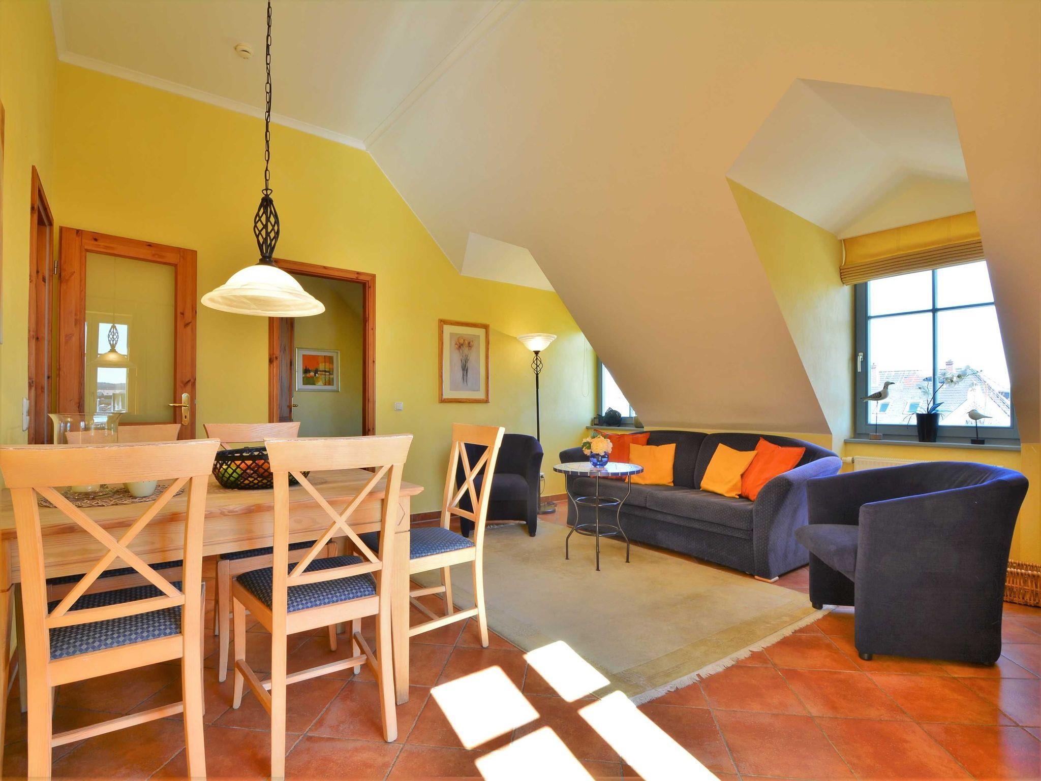 Herzlich Willkommen in der Residenz Laguna! Hier im Dachgeschoss befindet sich die Wohnung Nr. 17, welche im mediterranen Stil eingerichtet ist. Die 54 m² große 3-Raum-Ferienwohnung mit Südbalkon ist für 2 bis 4 Personen geeignet. Der großzügige Wohnraum ist ausgestattet mit Couch und zwei Sesseln, einem Essplatz mit Stühlen, TV, Stereoanlage und DVD-Player. Die Küchenzeile mit Kühlschrank, Geschirrspüler, Backofen u. Herd, Mikrowelle, Kaffeemaschine, Toaster, Wasserkocher etc. befindet sich außerhalb des Wohnraumes in der vorgelagerten Diele. Die gefangenen Räume wie Küche und Bad haben elektrisch zu öffnende Lichtkuppeln. Infolgedessen ist die Wohnung lichtdurchflutet und gut gelüftet. Hierzu tragen auch die hohen Decken (3,25 m) bei. Hier meint man dass die Sonne scheint, selbst wenn es draußen regnet. Ein Schlafraum mit Doppelbett, ein Schlafraum mit 2 Einzelbetten sowie das Fußboden beheizte Bad mit Dusche, WC und Handtuch-Heizkörper vervollständigen das Gesamtbild dieser Wohnung.