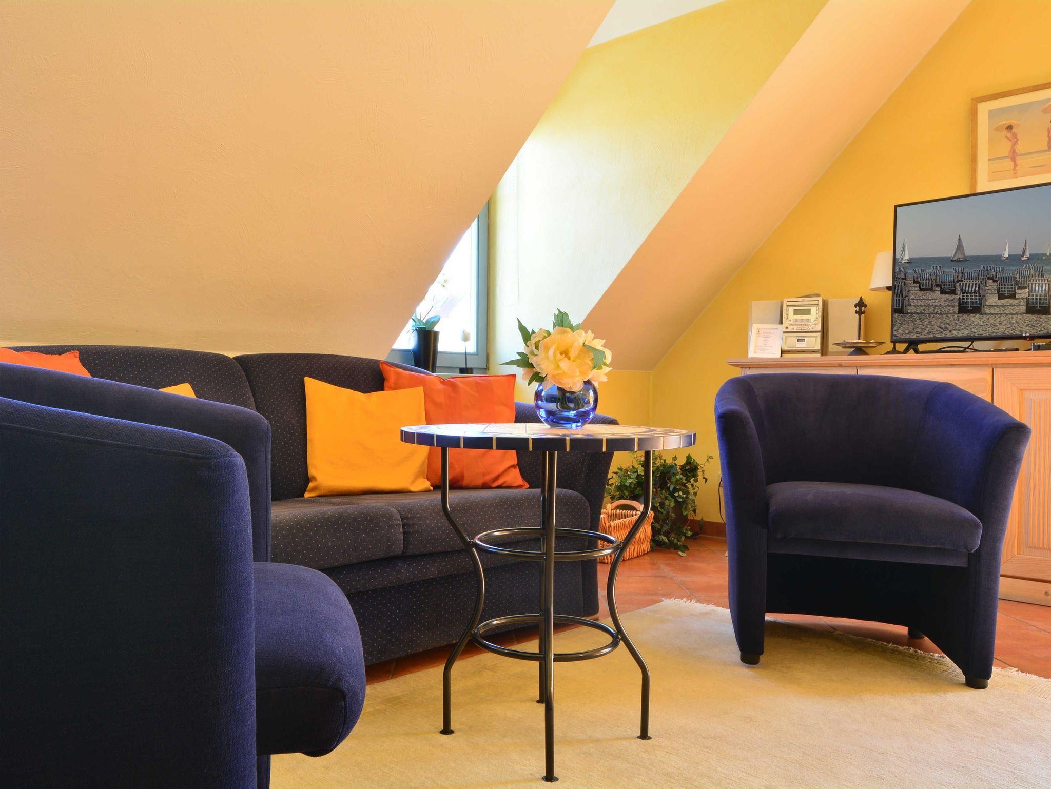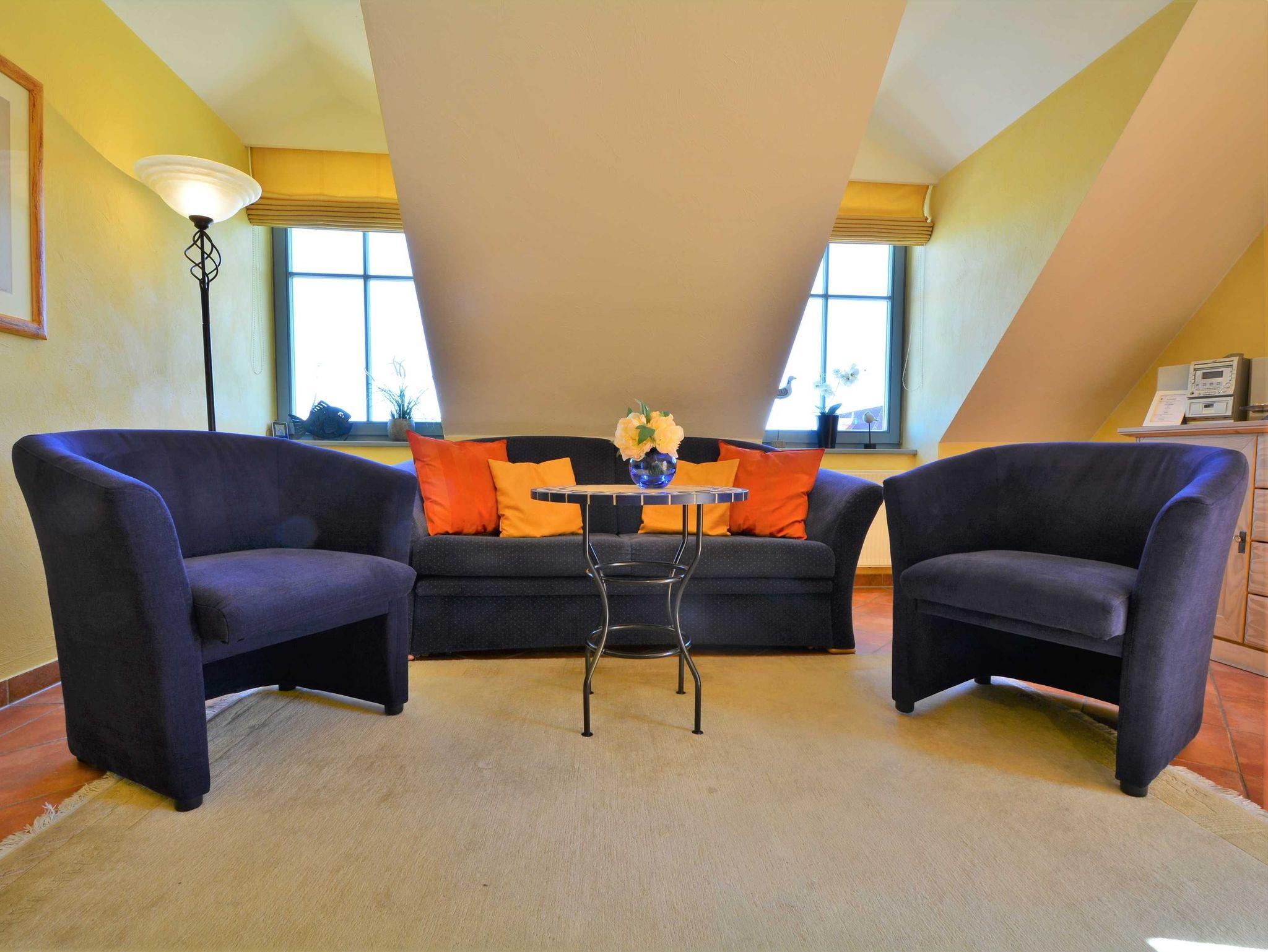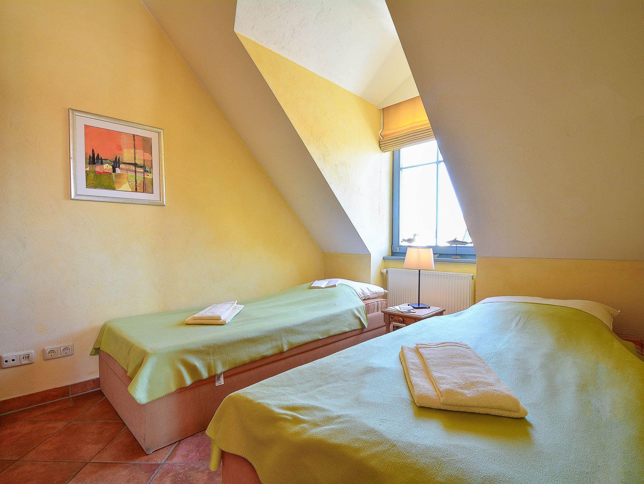 Herzlich Willkommen in der Residenz Laguna! Hier im Dachgeschoss befindet sich die Wohnung Nr. 17, welche im mediterranen Stil eingerichtet ist. Die 54 m² große 3-Raum-Ferienwohnung mit Südbalkon ist für 2 bis 4 Personen geeignet. Der großzügige Wohnraum ist ausgestattet mit Couch und zwei Sesseln, einem Essplatz mit Stühlen, TV, Stereoanlage und DVD-Player. Die Küchenzeile mit Kühlschrank, Geschirrspüler, Backofen u. Herd, Mikrowelle, Kaffeemaschine, Toaster, Wasserkocher etc. befindet sich außerhalb des Wohnraumes in der vorgelagerten Diele. Die gefangenen Räume wie Küche und Bad haben elektrisch zu öffnende Lichtkuppeln. Infolgedessen ist die Wohnung lichtdurchflutet und gut gelüftet. Hierzu tragen auch die hohen Decken (3,25 m) bei. Hier meint man dass die Sonne scheint, selbst wenn es draußen regnet. Ein Schlafraum mit Doppelbett, ein Schlafraum mit 2 Einzelbetten sowie das Fußboden beheizte Bad mit Dusche, WC und Handtuch-Heizkörper vervollständigen das Gesamtbild dieser Wohnung.