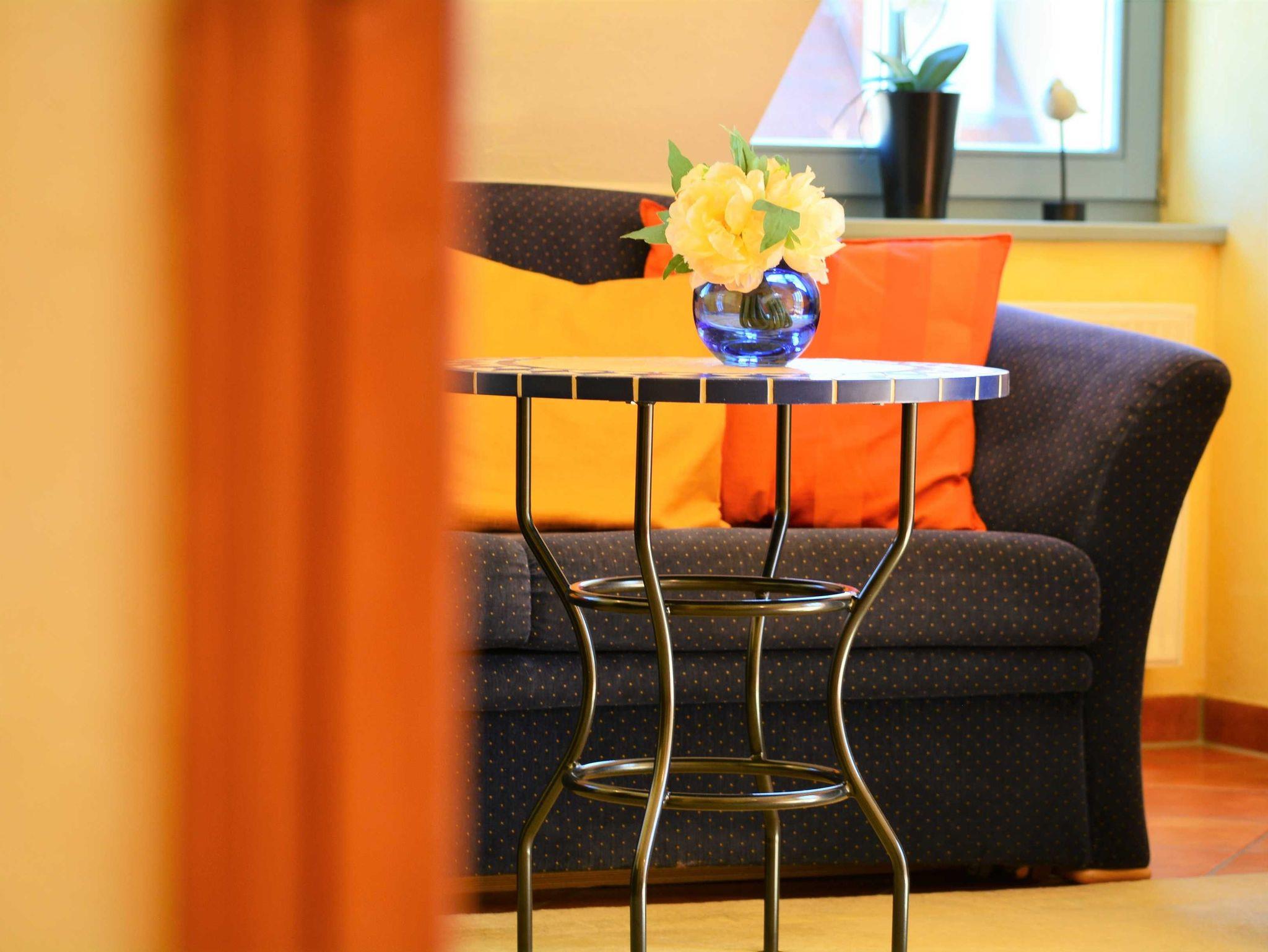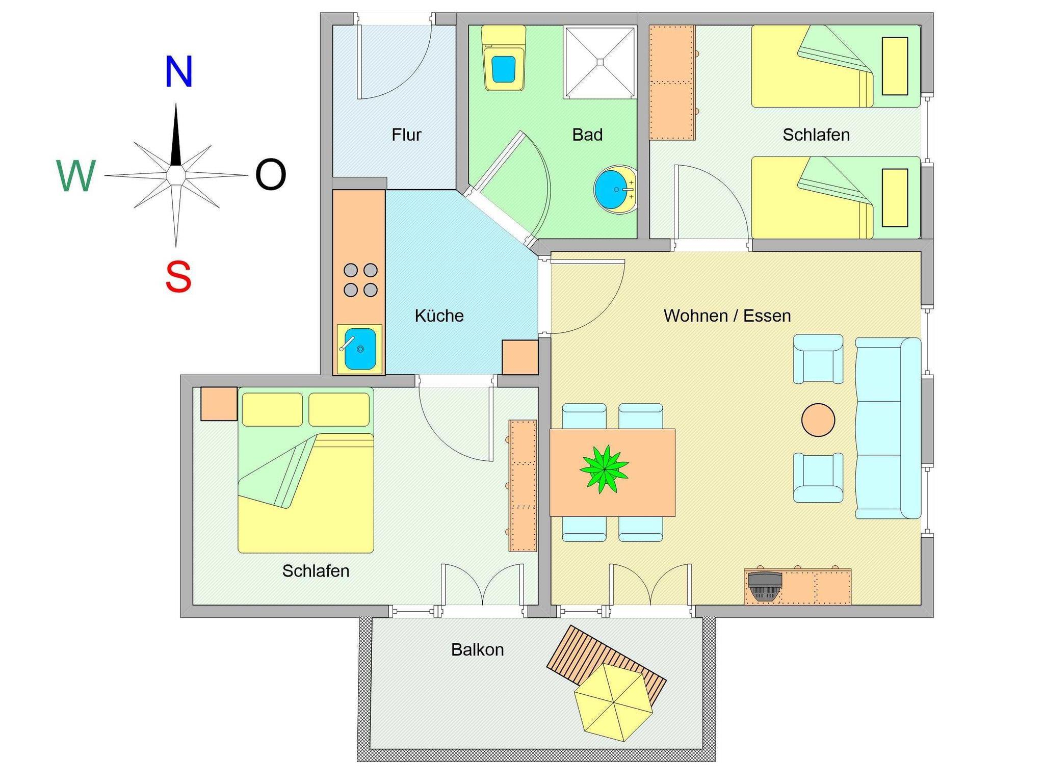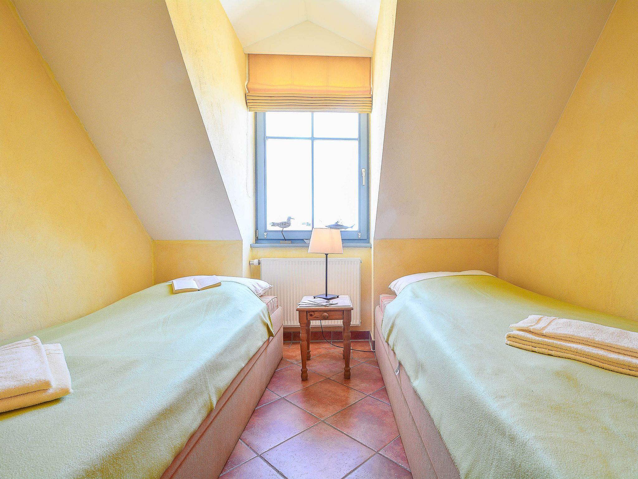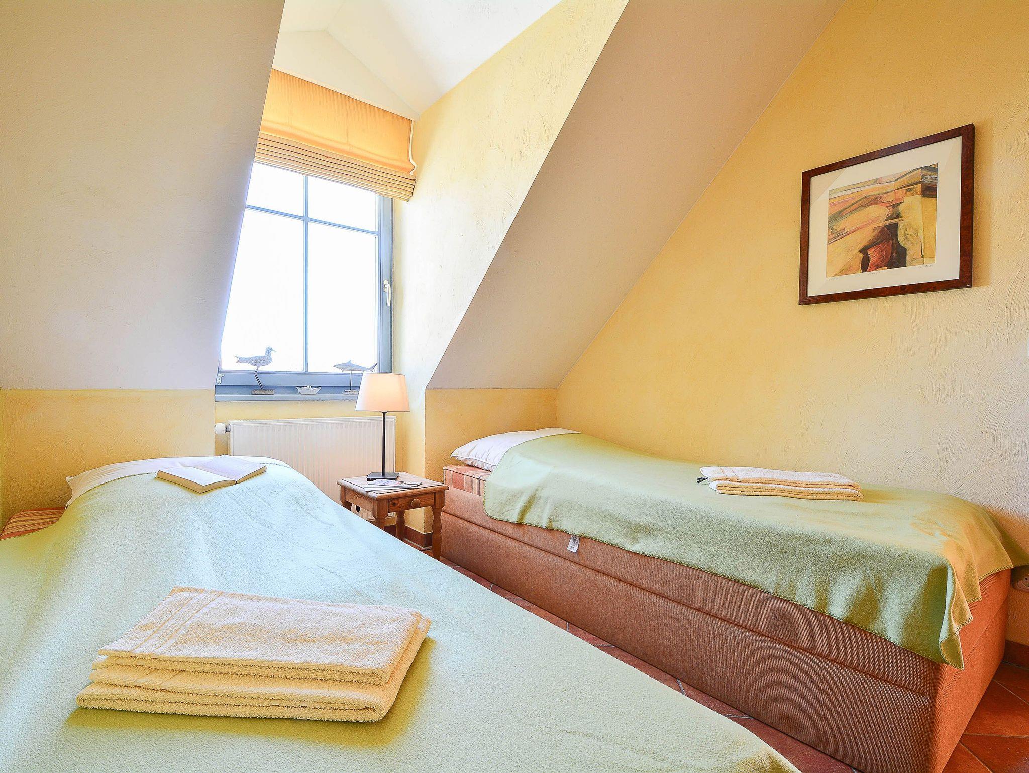 Herzlich Willkommen in der Residenz Laguna! Hier im Dachgeschoss befindet sich die Wohnung Nr. 17, welche im mediterranen Stil eingerichtet ist. Die 54 m² große 3-Raum-Ferienwohnung mit Südbalkon ist für 2 bis 4 Personen geeignet. Der großzügige Wohnraum ist ausgestattet mit Couch und zwei Sesseln, einem Essplatz mit Stühlen, TV, Stereoanlage und DVD-Player. Die Küchenzeile mit Kühlschrank, Geschirrspüler, Backofen u. Herd, Mikrowelle, Kaffeemaschine, Toaster, Wasserkocher etc. befindet sich außerhalb des Wohnraumes in der vorgelagerten Diele. Die gefangenen Räume wie Küche und Bad haben elektrisch zu öffnende Lichtkuppeln. Infolgedessen ist die Wohnung lichtdurchflutet und gut gelüftet. Hierzu tragen auch die hohen Decken (3,25 m) bei. Hier meint man dass die Sonne scheint, selbst wenn es draußen regnet. Ein Schlafraum mit Doppelbett, ein Schlafraum mit 2 Einzelbetten sowie das Fußboden beheizte Bad mit Dusche, WC und Handtuch-Heizkörper vervollständigen das Gesamtbild dieser Wohnung.