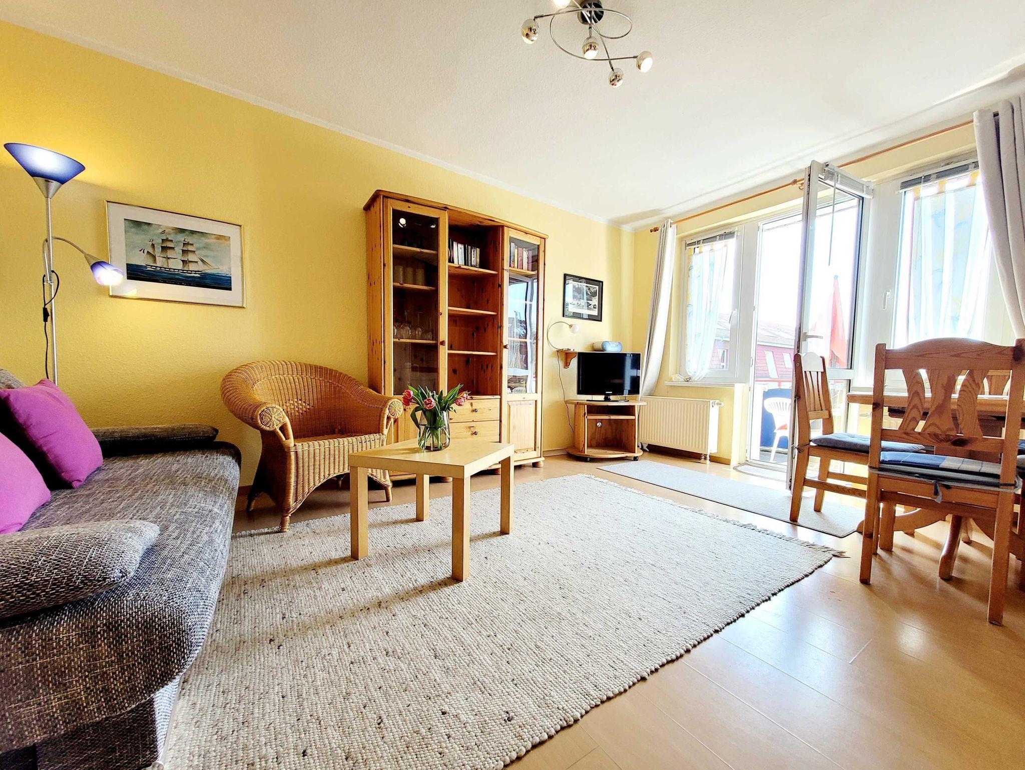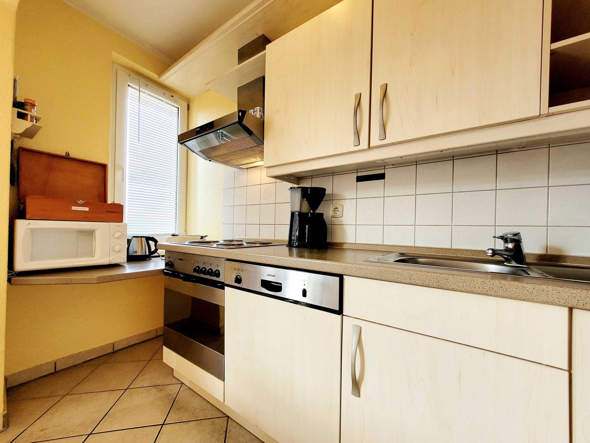 Der Wohnbereich ist mit einem bequemen Schlafsofa und einem TV ausgestattet ? ein perfekter Ort zum Entspannen nach einem Strandtag. Direkt angrenzend befindet sich der Essbereich mit einer voll ausgestatteten Küche, inklusive 4-Platten-Herd, Backofen, Geschirrspüler, Mikrowelle, Toaster, Wasserkocher und Kaffeemaschine. Hier lässt sich alles für ein gemeinsames Frühstück oder ein gemütliches Abendessen zubereiten.