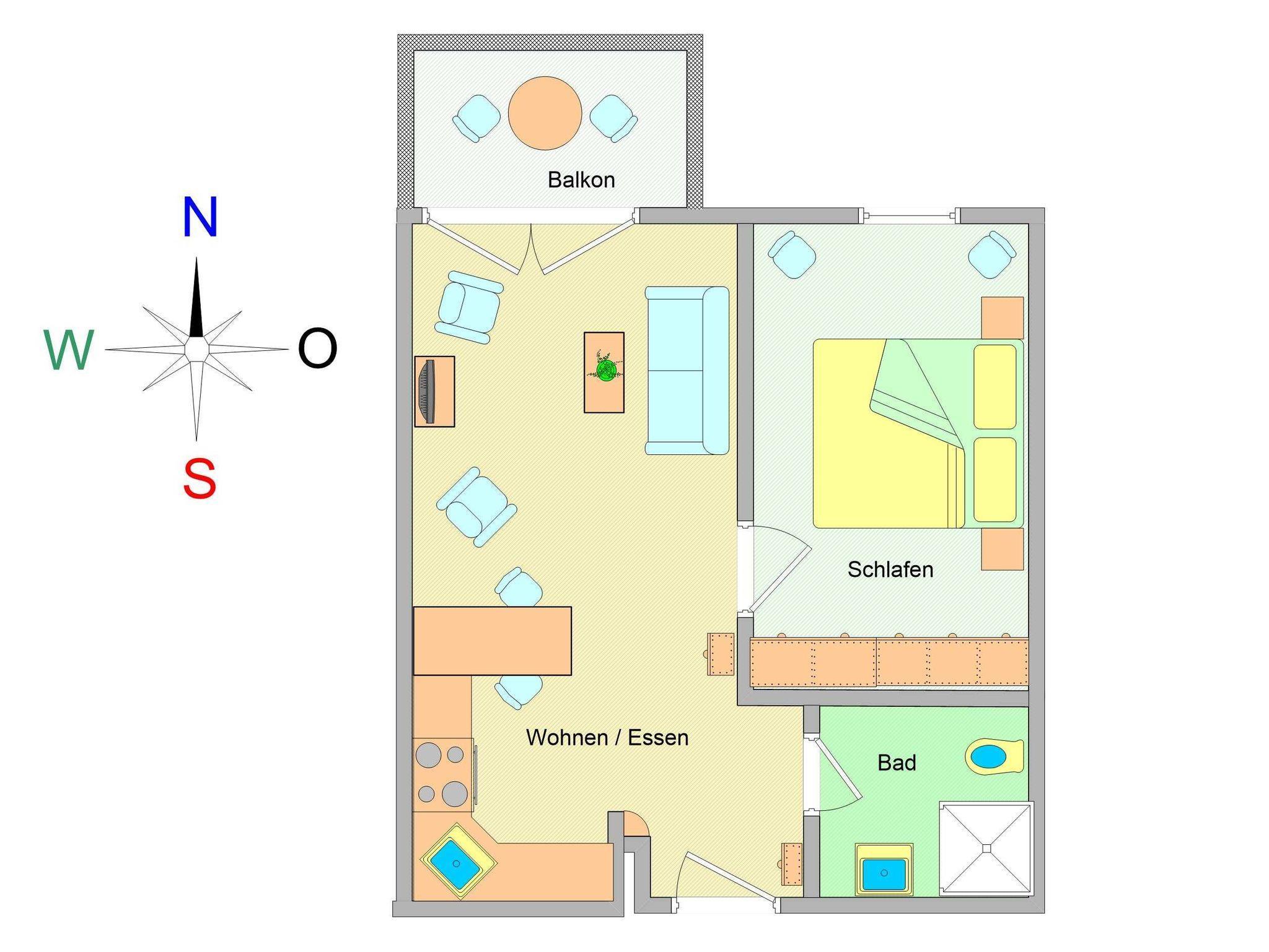 Sie wohnen in einer 2-Raum-Wohnung von ca. 39 m² Größe, die sich im ersten Obergeschoss befindet. Das Wohnzimmer ist ausgestattet mit Küchenzeile (Induktionsherd mit 4 Kochstellen, Geschirrspüler, Mikrowelle), bequemer Sitzgarnitur, Radio und TV-Gerät. Ein Schlafzimmer mit großem Doppelbett und Kleiderschrank sowie das Bad mit Dusche und WC vervollständigen das Gesamtbild dieser Wohnung.