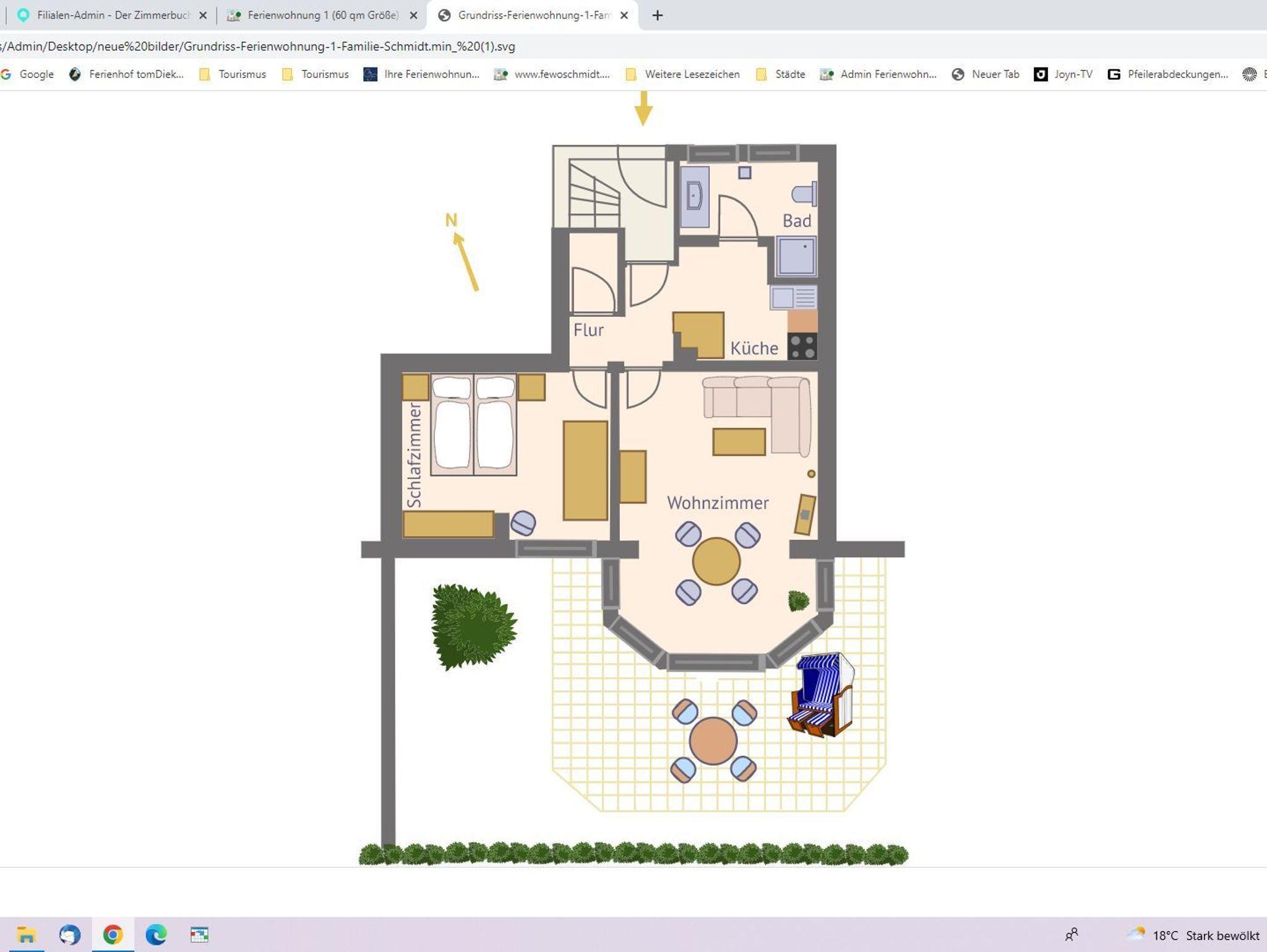 Die Wohnung Nr.1 ist eine in einem Ferienhaus im Erdgeschoss liegende separate Ferienwohnung von ca. 60 qm Größe, bestehend aus einem Wohnzimmer mit Erker und Terrasse inkl. Standkorb, Schlafzimmer, Küche, Bad und Flur mit kleinem Abstellraum.