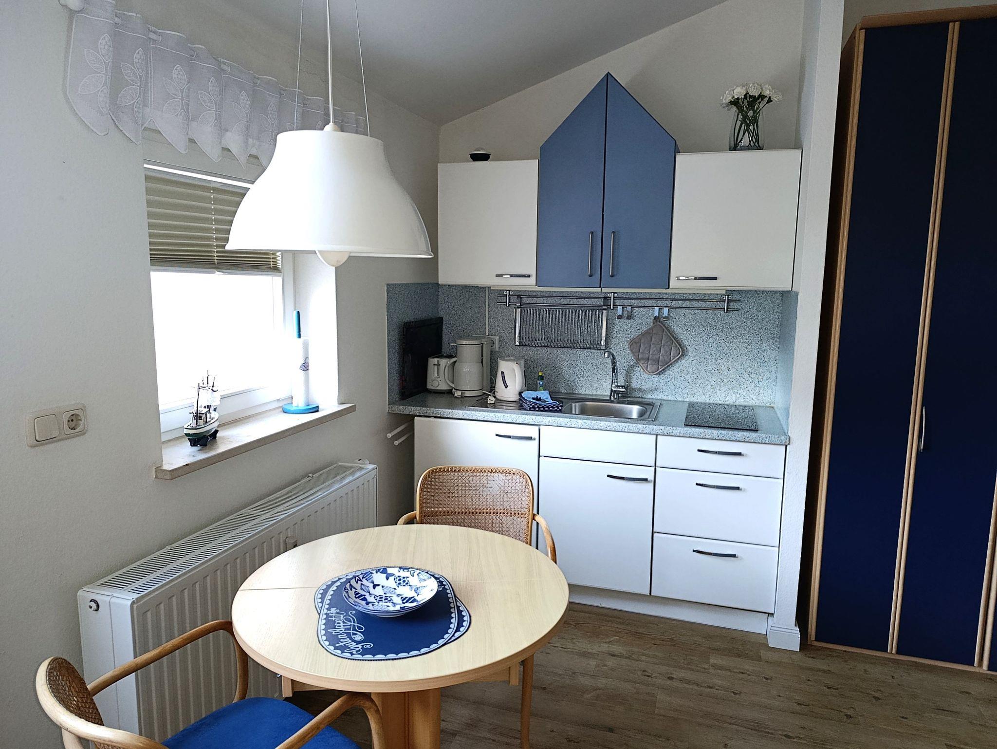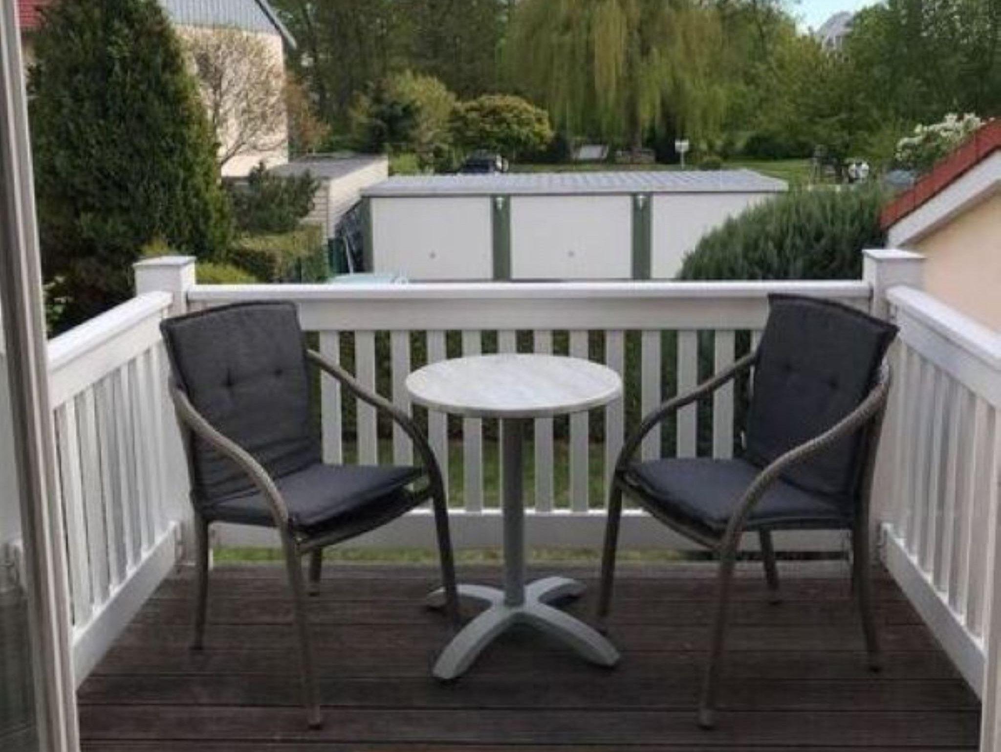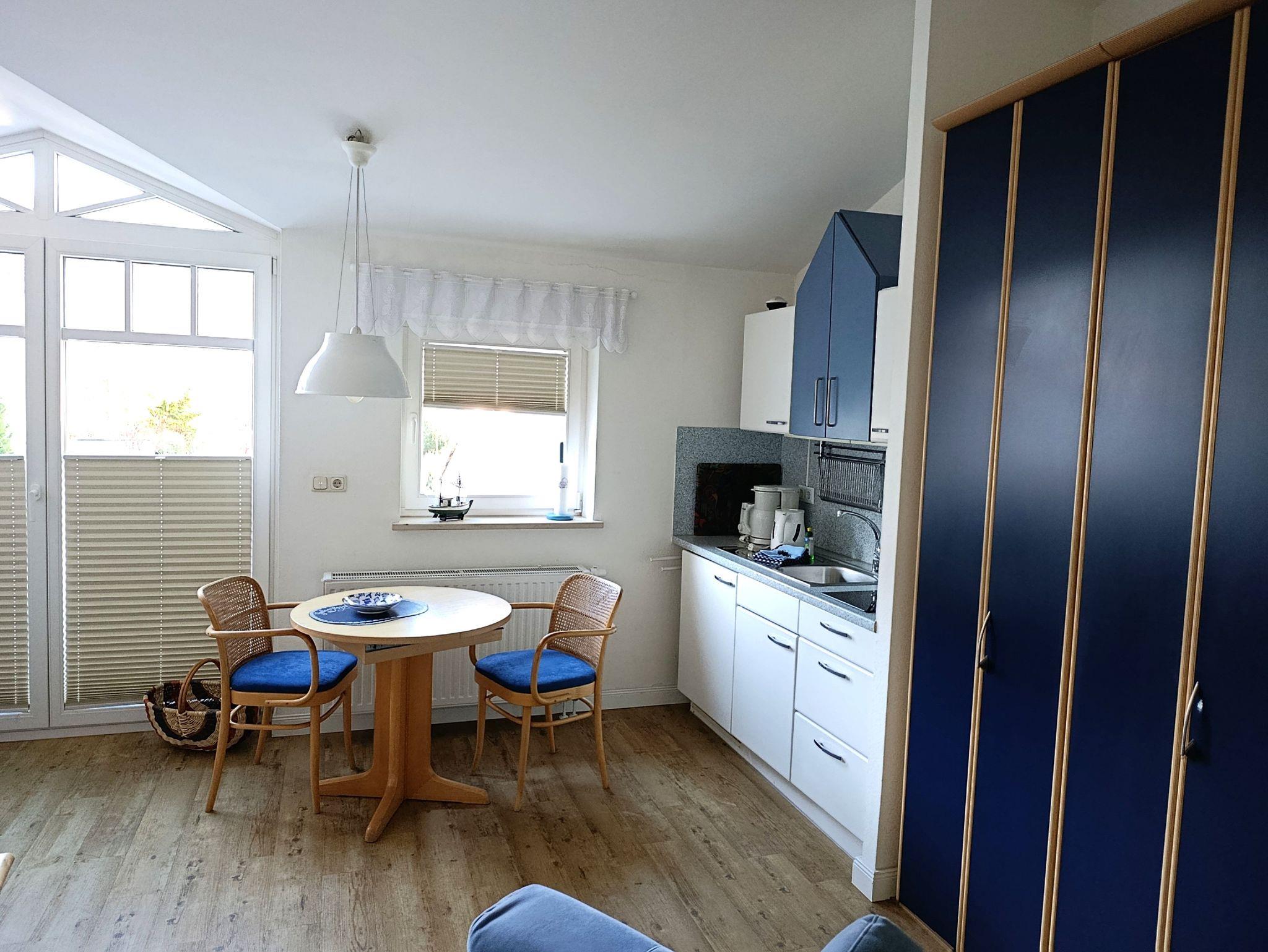 Nur 150 m vom Strand wohnen Sie in einer 2-Raum-Ferienwohnung. Die 39 qm große Wohnung liegt in der ersten Etage. Das Wohnzimmer ist mit einer Couch, Couchtisch, Sessel, Anrichte, mit Kabel-TV (Flachbildschirm), Radio, Essbereich (Tisch und Stühle) und Küchenzeile ausgestattet. Der Balkon mit Tisch und Stühle geht zur Südseite. Im Schlafzimmer stehen ein Doppelbett und eine kleine Anrichte. Die Küchenzeile wurde ausgestattet mit Mikrowelle, Kühlschrank, Kaffeemaschine, Zwei-Platten-Kochfeld, Toaster und Wasserkocher. Das Bad mit Dusche und WC komplettiert die Wohnung.