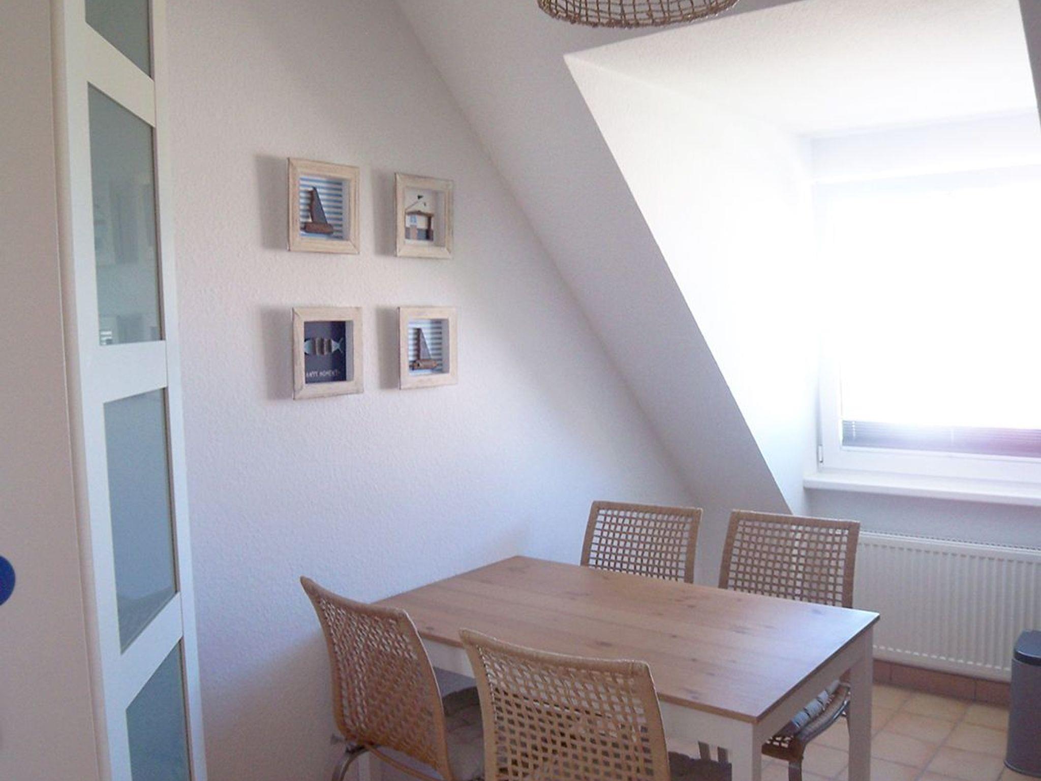 Im Wohnzimmer befindet sich ein bequemes Ecksofa um sich von Ihren Ausflüge in Kühlungsborn und Umgebung zu erholen. Sie finden hier einen Flachbildfernseher vor. Der Essbereich ist im Wohnzimmer integriert.