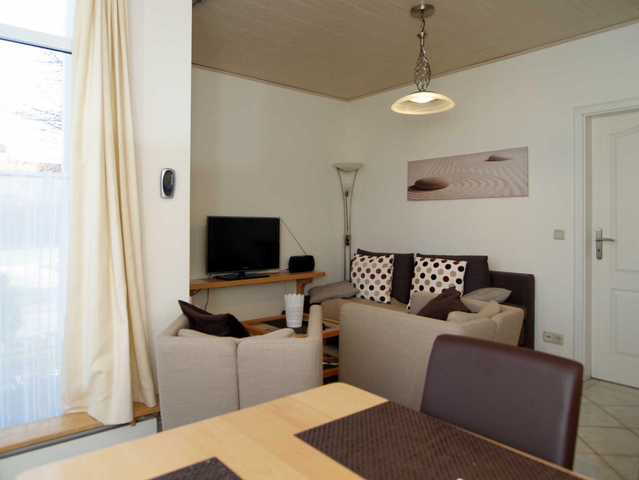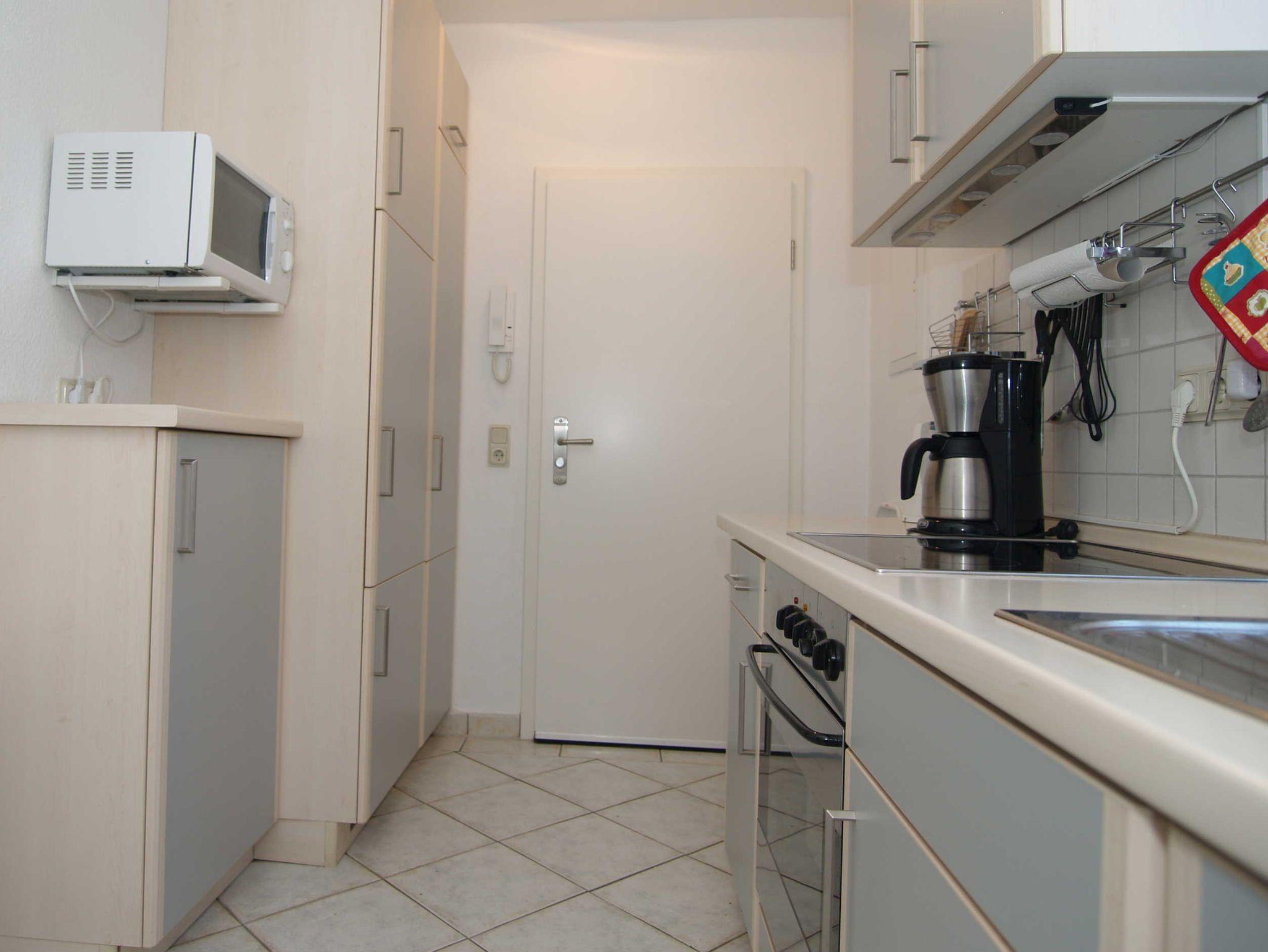 Sie wohnen in einer ca. 48m² großen 2-Raum-Wohnung, die sich im Erdgeschoss einer Villa befindet. Der Wohnraum ist ausgestattet mit einer Schlafcouch, einer Essecke und TV. Von hier gelangen Sie auf die nach Norden ausgerichtete bepflanzte Terrasse. Die separate Küche ist mit allen wichtigen Küchenutensilien ausgestattet. Im Schlafzimmer finden Sie ein Doppelbett und einen großen Kleiderschrank. Das Bad mit Großdusche und WC vervollständigt das Gesamtbild dieser Wohnung.