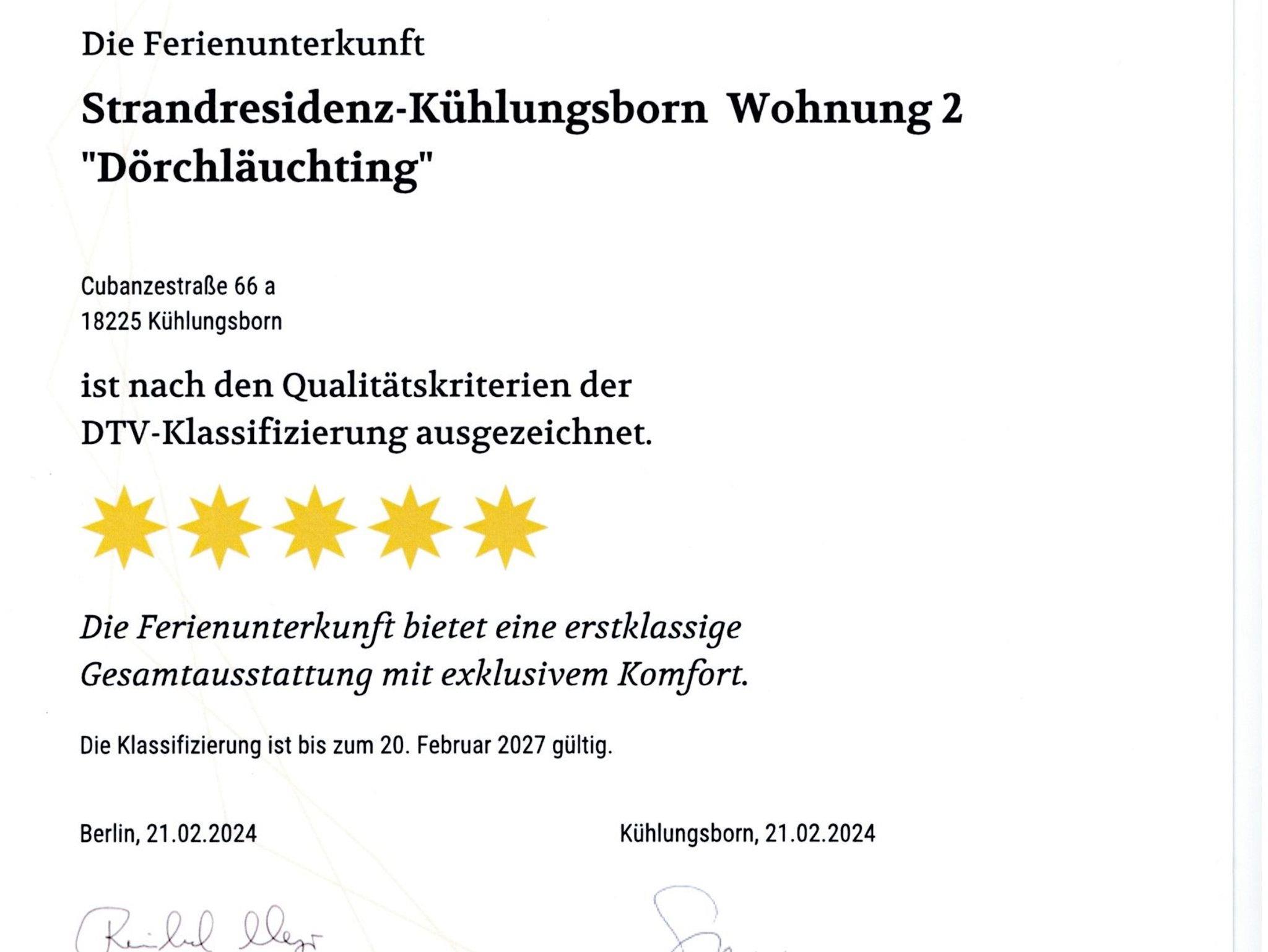 Die 7 Wohnungen gehören zu den Flaggschiffen der vom DTV zertifizierten deutschen Ferienwohnungen mit 1.216 bis zu 1.331 vergebenen Punkten. 5 Sterne gibt es ab 900 Punkte.