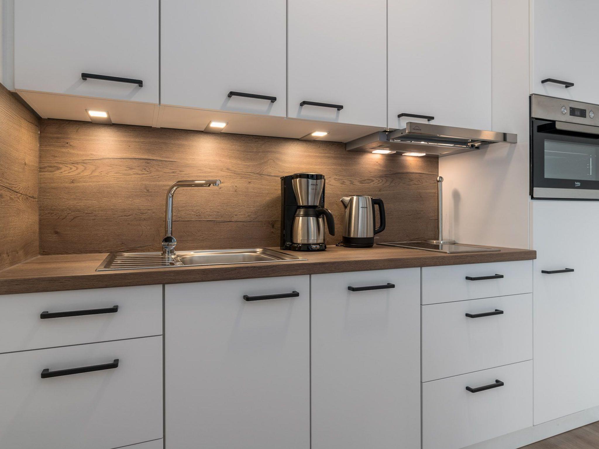 Das Bad verfügt über eine Dusche, einem Haartrockner und einem Handtuchtrockner. Zu Ihrem Apartment gehört ebenfalls ein großer und lichtdurchfluteter Wohn- und Essbereich mit offener Küche.