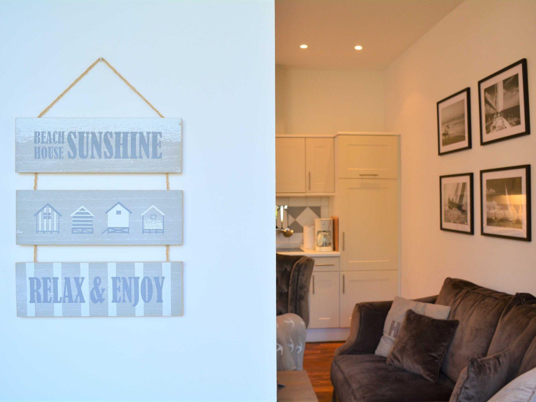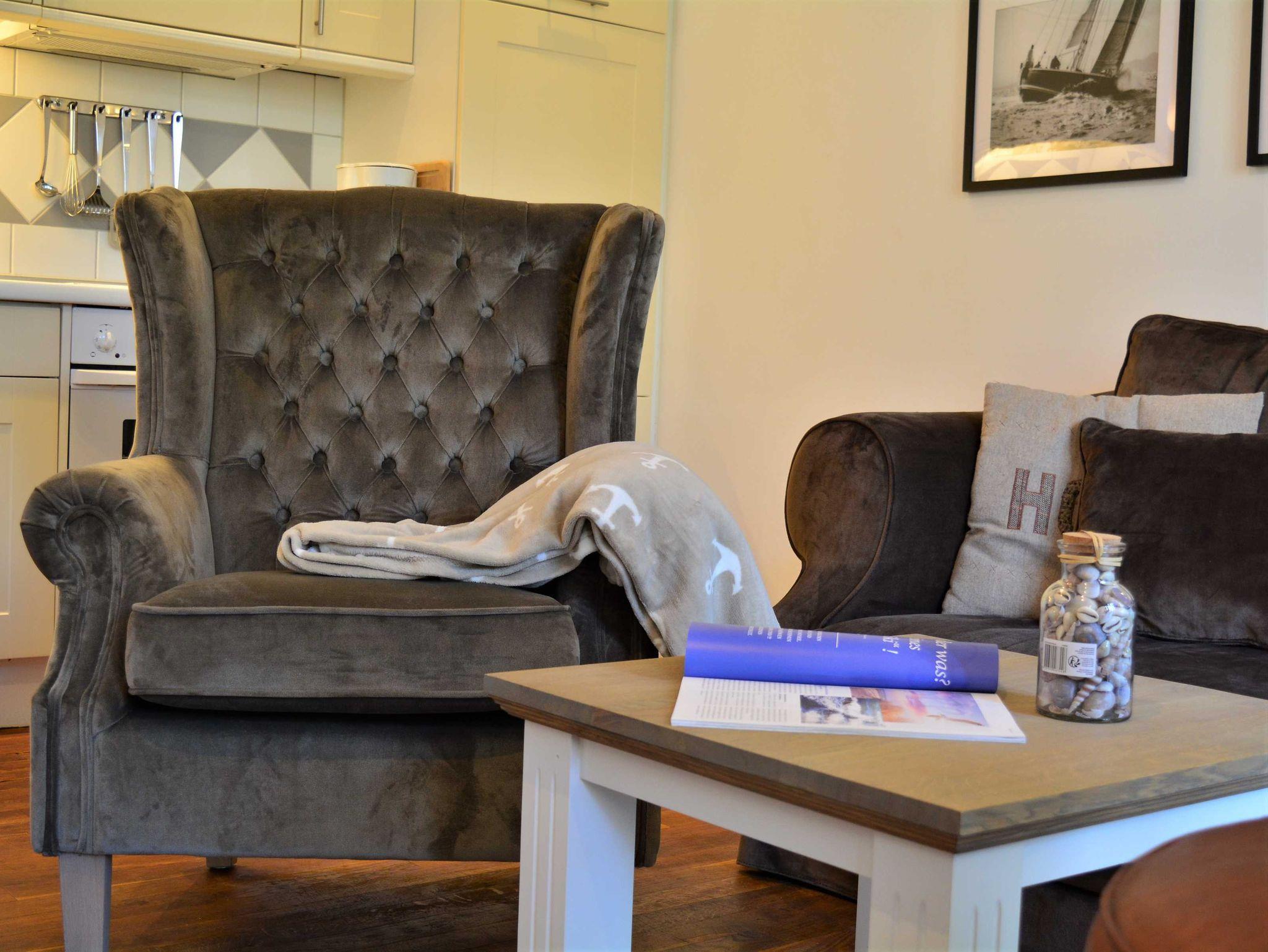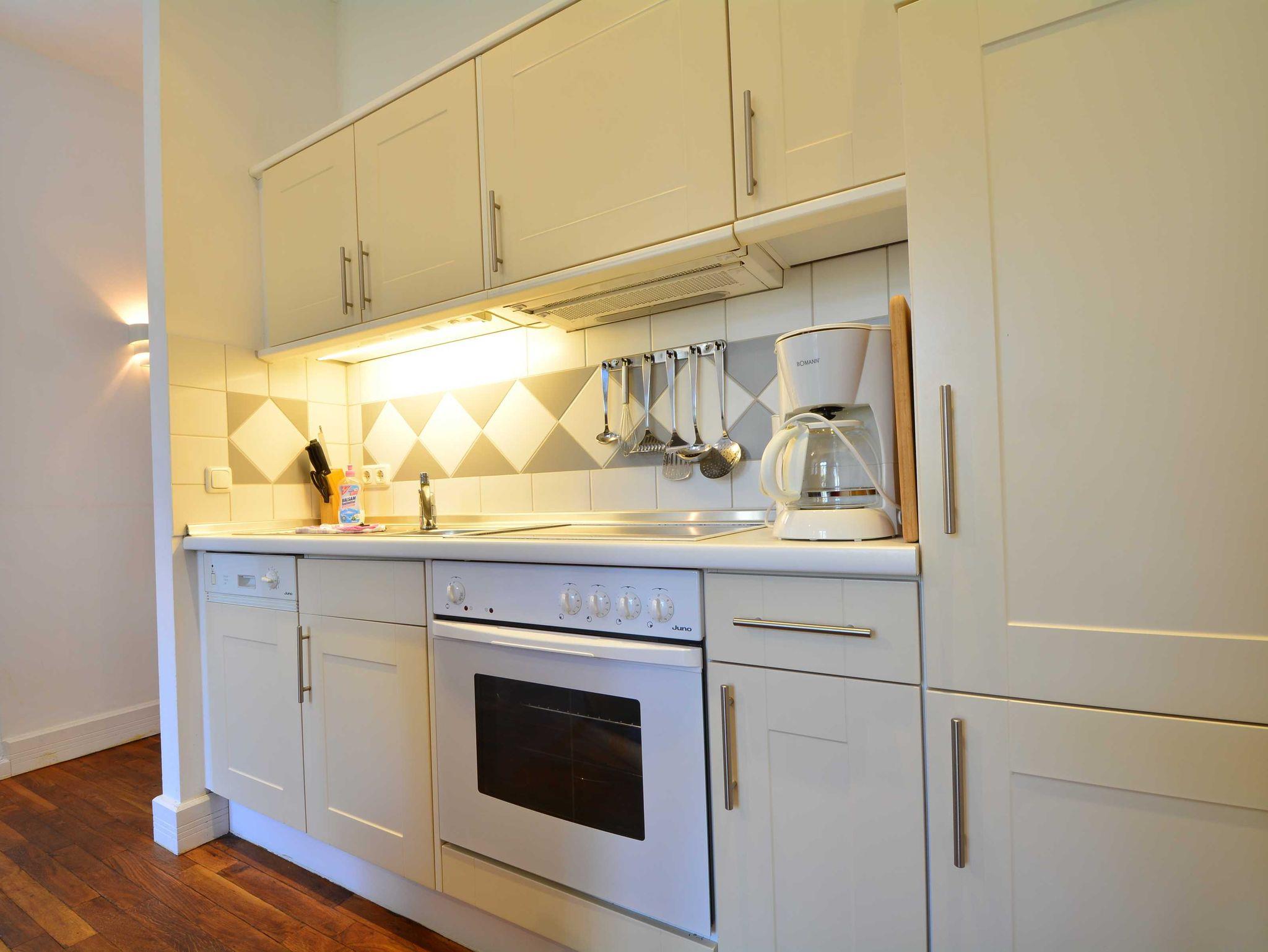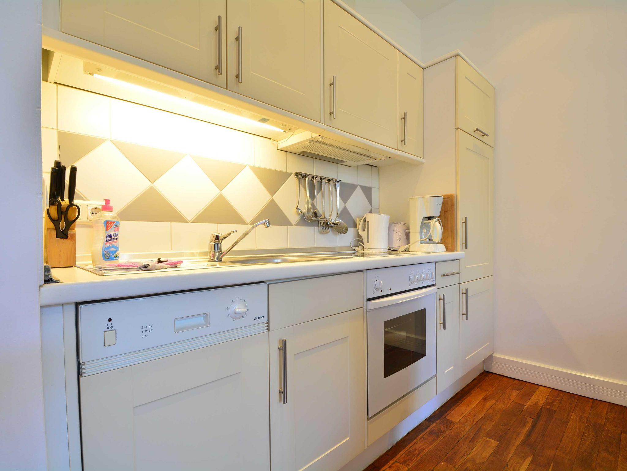 Die anschließende offene Küchenzeile bietet alle wichtigen Küchengeräte, die Sie für Ihren perfekten Urlaub an der Ostsee benötigen: Ein Backofen mit Dunstabzug und 4-Zonen-Ceranfeld, ein kleiner Geschirrspüler sowie ein Kühlschrank mit Gefrierfach befinden sich in der gut ausgestatteten Küche. Eine Kaffeemaschine, ein Wasserkocher, ein Toaster sowie genügend Geschirr und Kochutensilien komplettieren die Kücheneinrichtung.