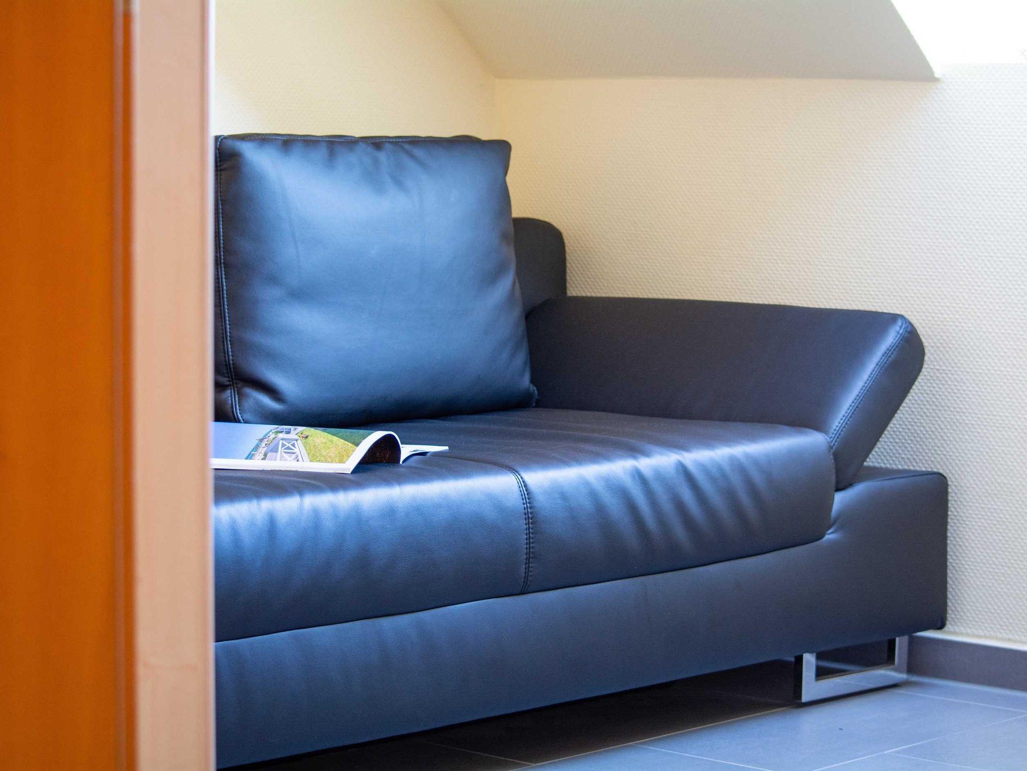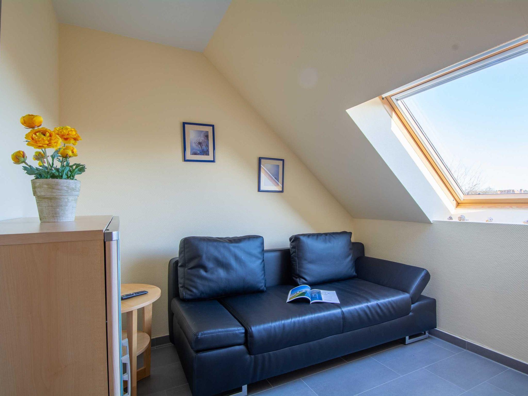 Das moderne geflieste Tageslichtbad im Obergeschoss ist ausgestattet mit einer bodengleichen Dusche, Waschbecken und WC sowie reichlich Ablagefläche für Ihre Badutensilien. Hier befindet sich auch der Sauna- und Ruheraum, dessen Nutzung sich inklusive versteht.