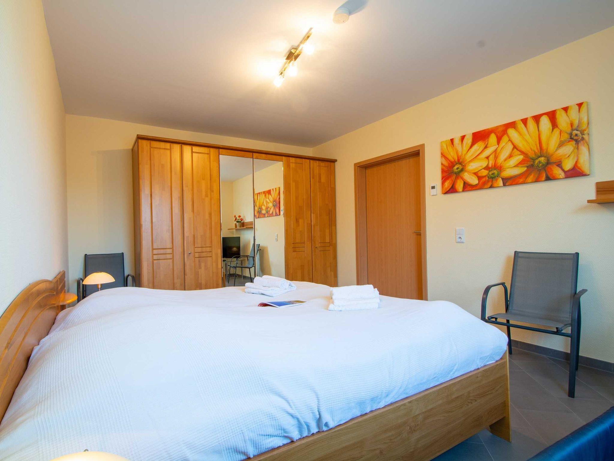 Ebenfalls auf der unteren Etage befinden sich das erste Schlafzimmer und das erste Bad. Im Schlafzimmer lädt Sie ein komfortables Doppelbett (2 x 90 x 200 cm) zur Nachtruhe ein. Der großzügige Kleiderschrank mit Ganzkörperspiegel bietet genügend Platz für Ihre Urlaubsgarderobe. Ein 39-Zoll-Smart-TV befindet sich ebenfalls in dem Schlafzimmer. Als Sichtschutz bzw. zum Verdunkeln sind im Schlafzimmer Außenrollos an den Fenstern angebracht. Im ersten Obergeschoss befinden sich zwei weitere Schlafzimmer. Eines ist ebenfalls mit einem Massivholzbett (2 x 90 x 200 cm), einem Schreibtisch, einem großen Kleiderschrank mit Ganzkörperspiegel sowie Außenrollos eingerichtet, das andere Schlafzimmer verfügt über eine ausziehbare Schlafcouch (80cm x 200 cm, ausgezogen 140cm x 200cm), einen Kleiderschrank sowie ein 27-Zoll-Flachbild-TV.
