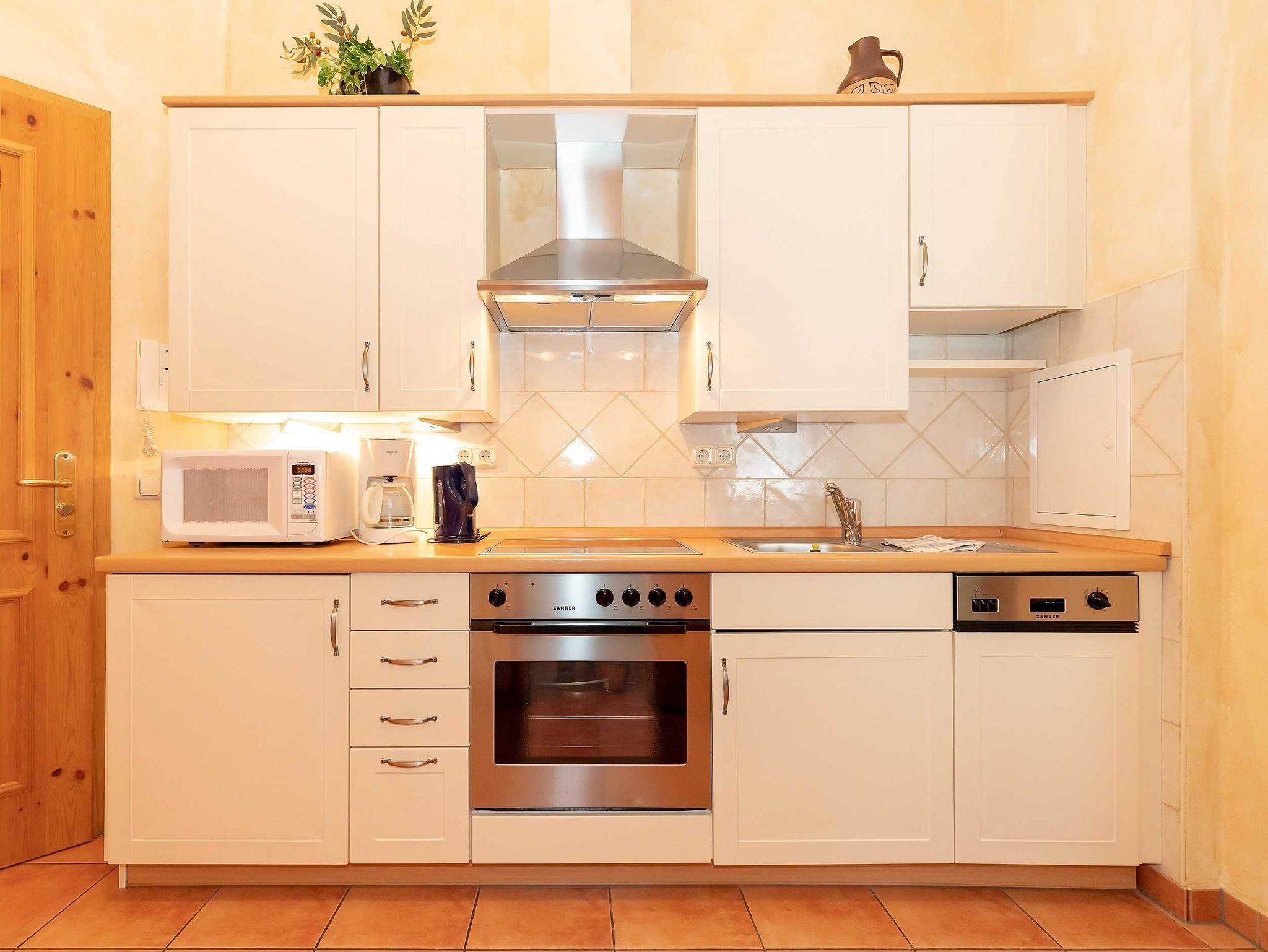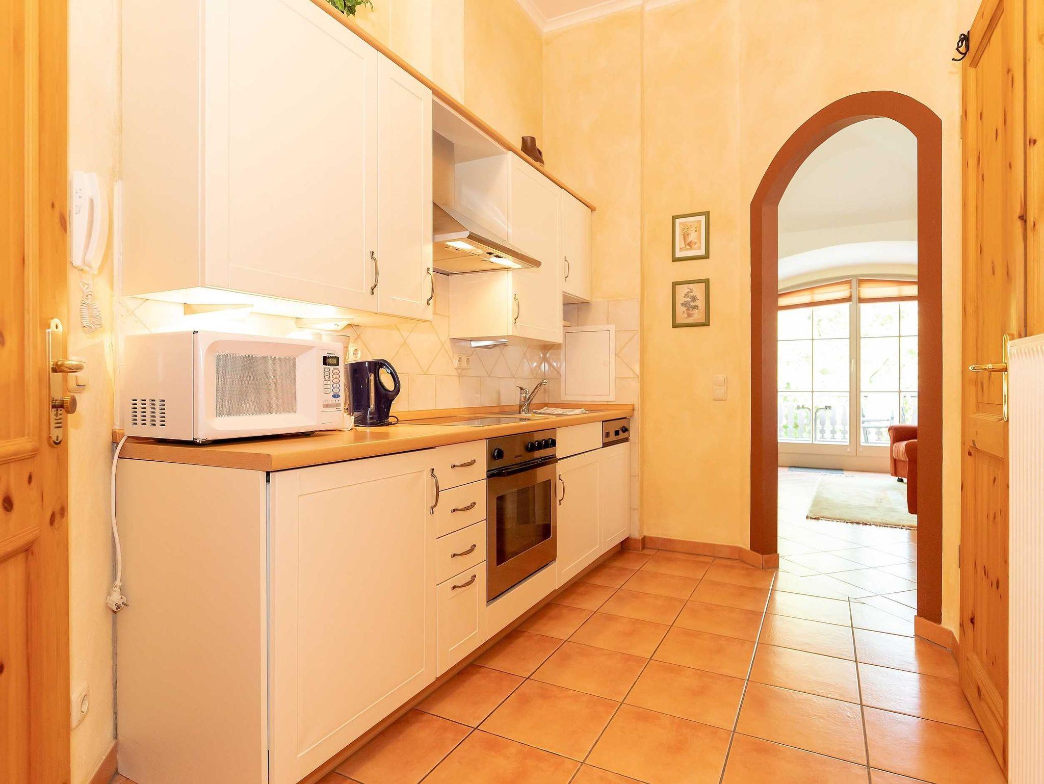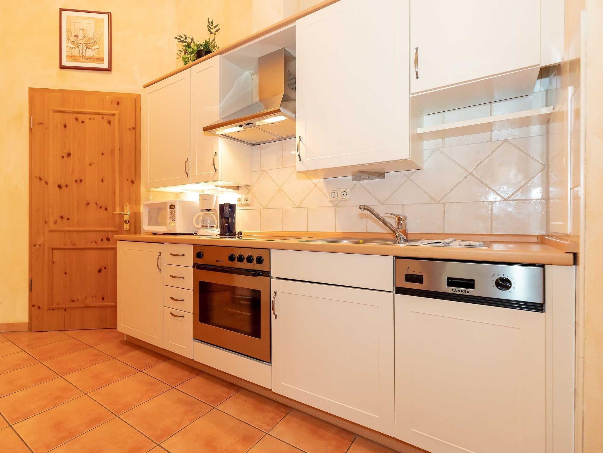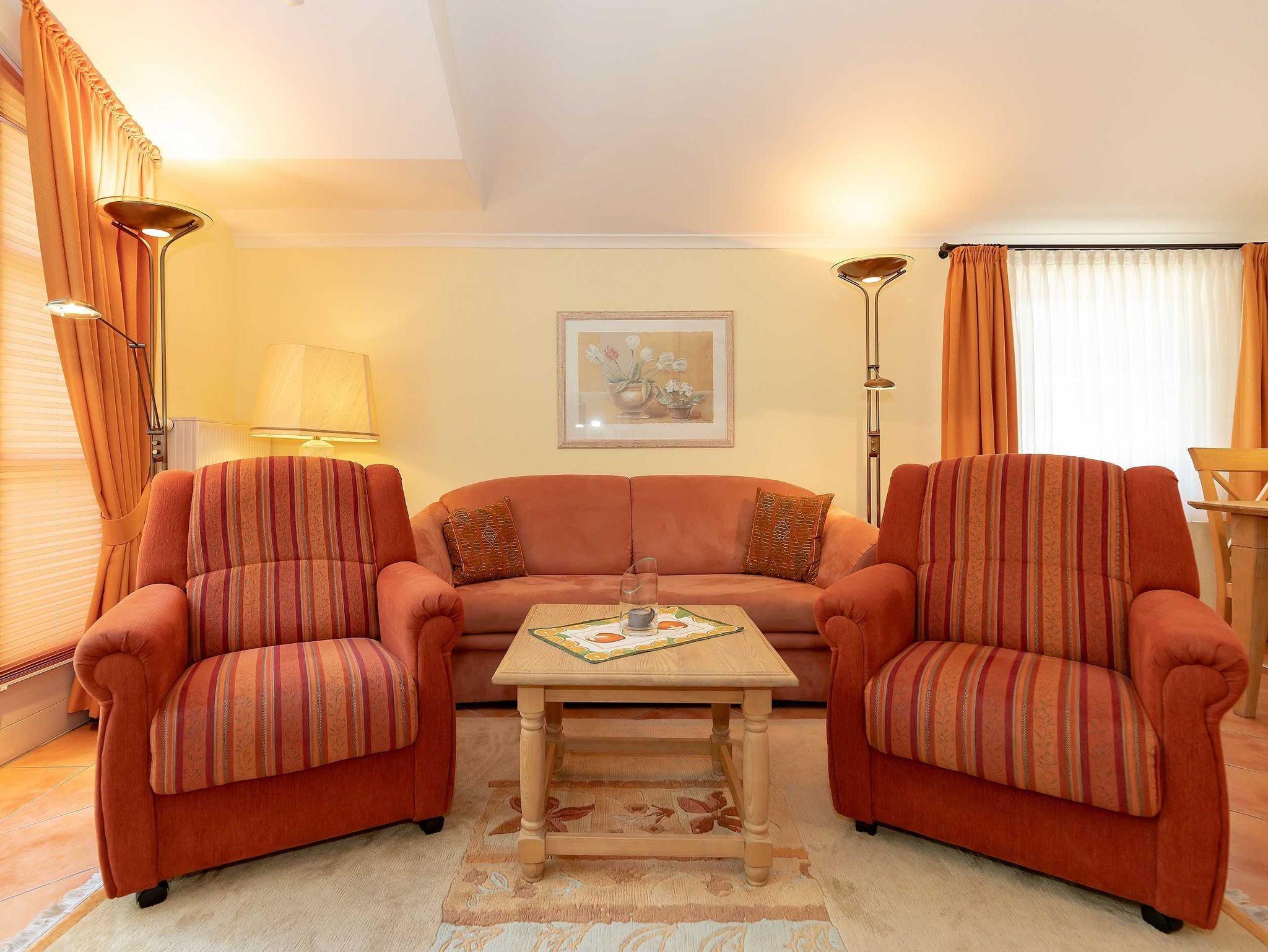 Die 62 qm große 2-Raum-Wohnung verfügt über einen hellen freundlichen Wohnraum mit einer einladenden Schlafcouch, einem gemütlichen Essplatz, einem Flachbild-TV und einer Stereoanlage. Die offene Küchenzeile im Flurbereich ist komplett ausgestattet mit einem Geschirrspüler, 4-Platten-Ceranfeld, Backofen mit Dunstabzug, eine Mikrowelle und Kühlschrank sowie genügend Geschirr und Kochutensilien für Ihr „perfektes Dinner“. Eine Kaffeemaschine, Wasserkocher und Toaster sind selbstverständlich auch in der Küche vorhanden. Vom Wohnraum aus gelangen Sie auf die großzügige Dachterrasse, die mit einem charmanten Tisch und 4 Stühlen ausgestattet ist.