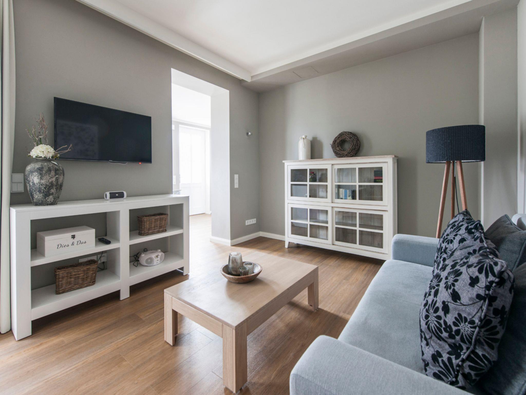 Zur Ausstattung der 52 m² großen Wohnung gehören u.a. eine komplette Küche mit Herd, Backofen, Spülmaschine, Kühlschrank mit Gefrierfach, Kaffeemaschine, Toaster, Nespresso-Maschine, Handmixer etc.; CD-Radio & Bluetooth-Lautsprecher, TV in Wohn- und Schlafzimmer (Doppelbett 180x200 m), WLAN-Hotspot, Bügeleisen und-brett, Fön, Schranksafe, etc. Alle Möbel wurden exklusiv und individuell aus Holz von einem Tischler gefertigt, ebenso die nach historischem Vorbild erstellten Fenster und Türen. Die Wohnung ist insgesamt sehr hochwertig und geschmackvoll eingerichtet und mit entsprechendem Ambiente geschmückt. Natürliche Materialien und schöne, ruhige Farben geben Ihnen ein hochwertiges Umfeld für Ihren Urlaub.