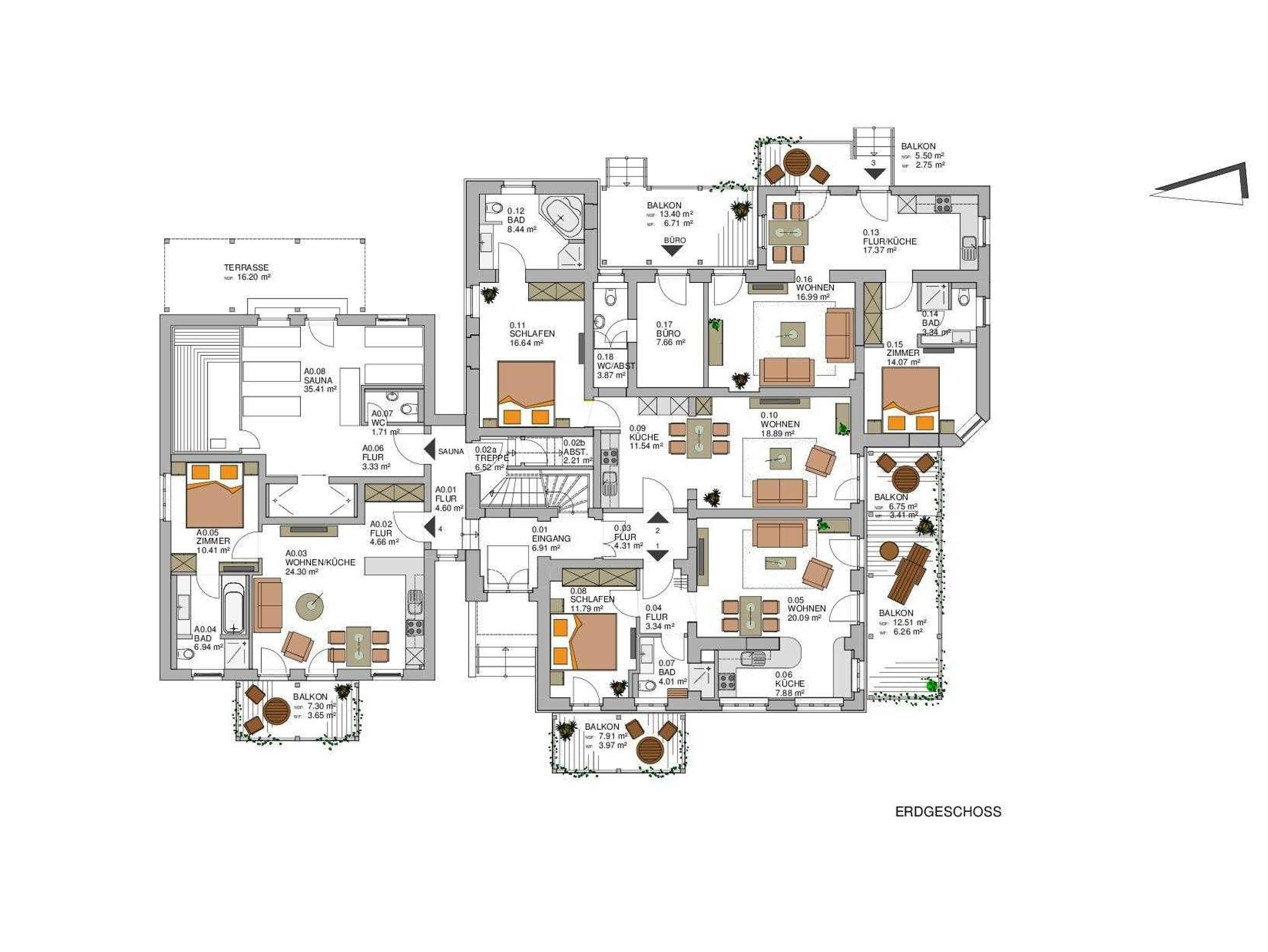 Alle unsere exklusiven Ferienwohnungen haben voll ausgestattete Küchen und großzügige Wohn- und Essräume mit allem Komfort mit großen Balkonen/Terrassen.