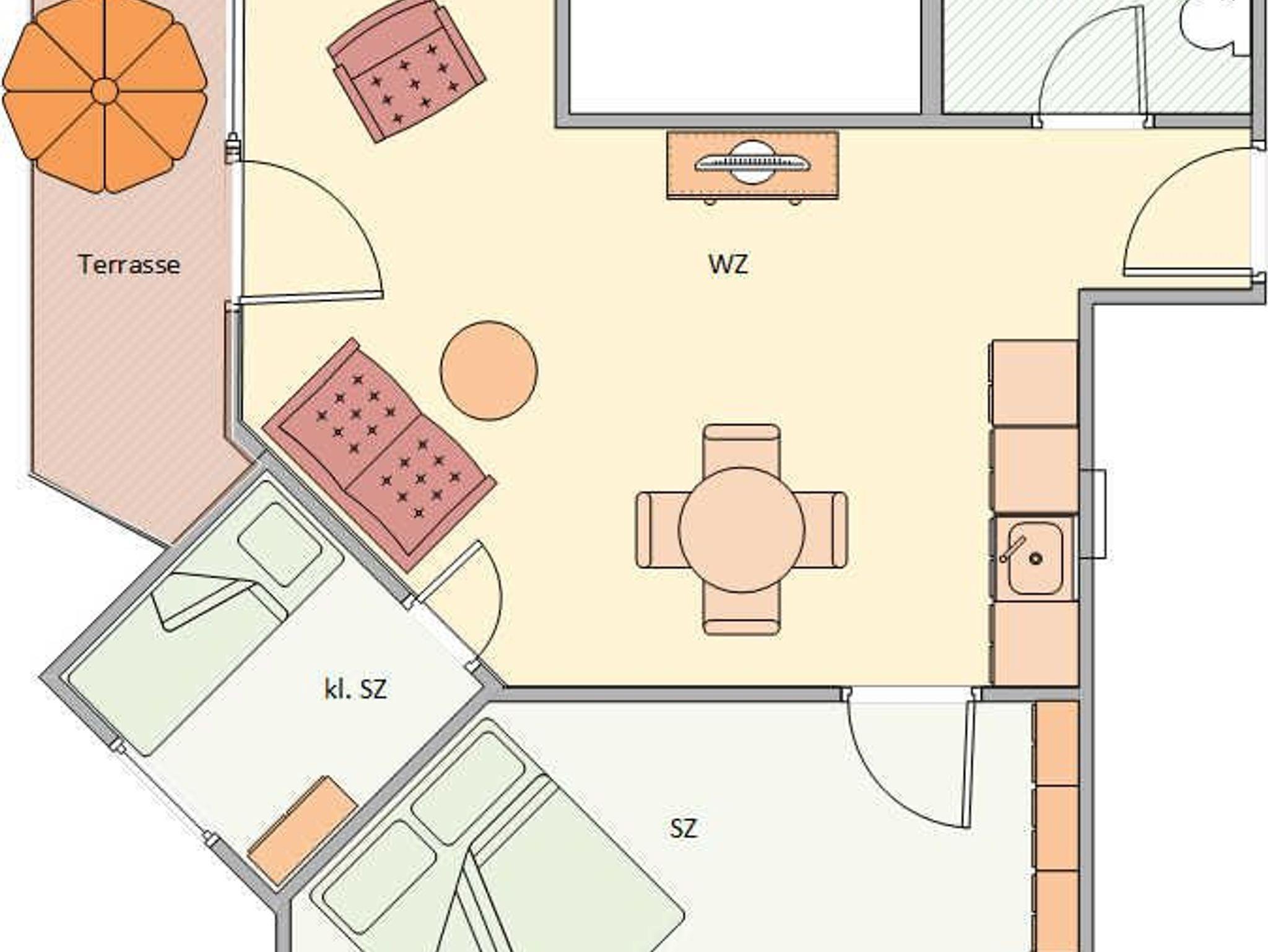 Umfangreich renovierte 3 -Raum Ferienwohnung mit Platz für bis zu 4 Personen. Die Wohnung liegt ebenerdig und ist mit einer Terrasse zur Ostseite ausgerichtet. Im Schlafzimmer befindet sich ein komfortables Bett. Im kleinen Kinderzimmer ein ausziehbarer Querschläfer.Das helle Wohnzimmer ist mit ansprechenden Polstermöbeln ausgestattet. Die offene Küche verfügt neben dem Cerankochfeld über einen Geschirrspüler, Mikrowelle, Kühlschrank mit Tiefkühlfach.