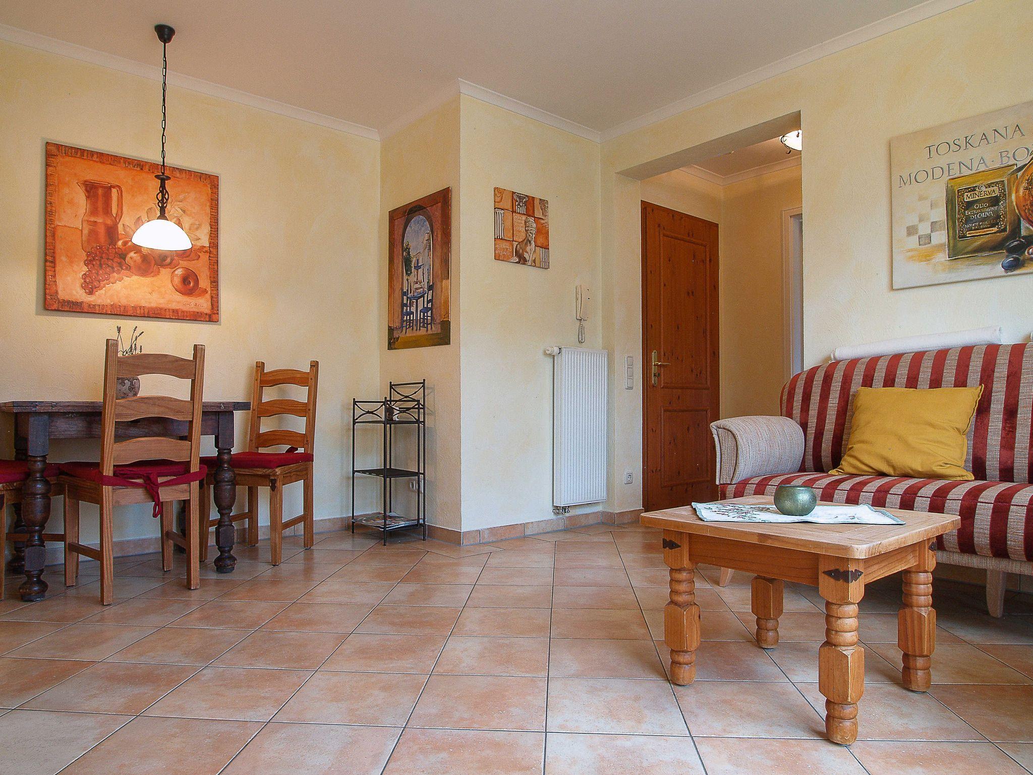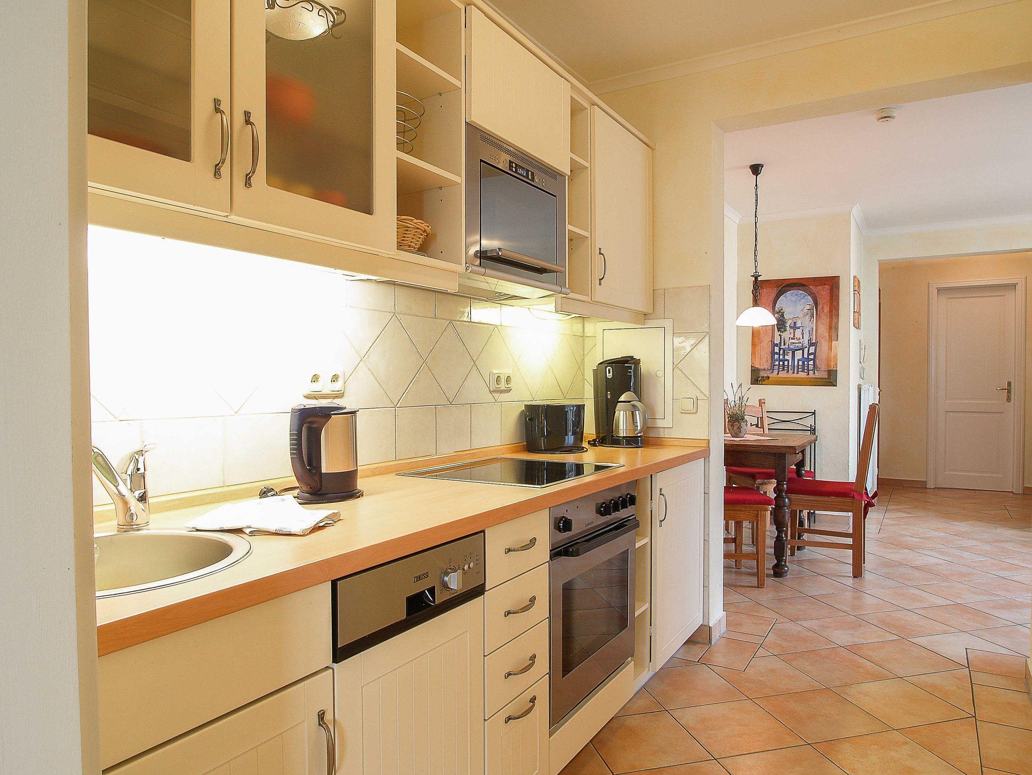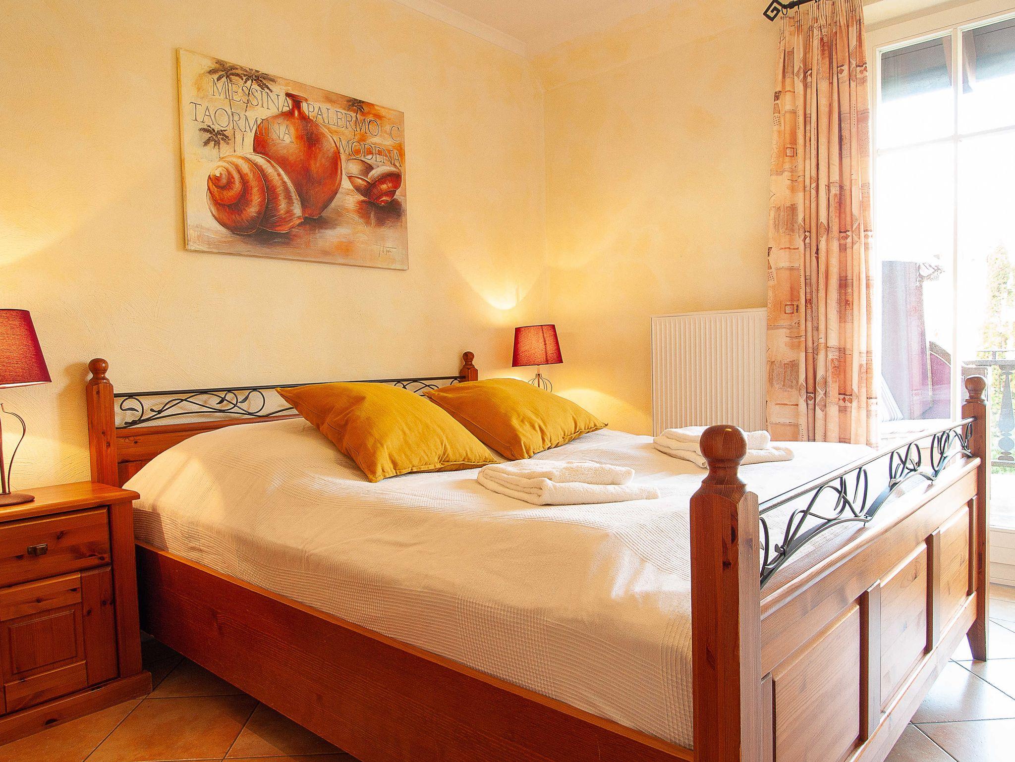 Herzlich willkommen in der Residenz Laguna! Hier kann der Urlaub beginnen! Im 1. Obergeschoss des Vorderhauses mit Blick auf die wunderschöne Wassergartenlandschaft im Innenhof befindet sich die Wohnung Nr. 06. Die liebevoll eingerichtete 3-Raum-Ferienwohnung mit ca. 72m² Wohnfläche bietet Platz für bis zu 4 Personen. Es empfängt Sie ein heller offener Wohnraum im mediterranen Stil mit gemütlicher Couch, Flachbild-TV, Stereoanlage, Essplatz etc. Das Herz der Wohnung ist der 32m² große möblierte West-Balkon mit direktem Blick auf den wunderschönen Innenhof und die mediterrane Teichlandschaft. Hier können Sie Sonnenbaden, Relaxen oder den Abend zu einem Glas Wein ausklingen lassen. Es schließt sich die offene voll ausgestattete Küchenzeile an. Sie bietet nicht nur ein 4-Platten-Cerankochfeld mit Backofen, eine Mikrowelle oder einen Geschirrspüler, sie ist insgesamt mit allen Utensilien ausgestattet, die zum Kochen von Genießern benötigt werden. Eine Kaffeemaschine ist ebenso vorhanden wie Toaster und Wasserkocher. Die Wohnung ist durchgehend mit mediterranen Fliesen versehen. Die beiden Schlafzimmer sind jeweils ausgestattet mit einem Doppelbett, einem geräumigen Kleiderschrank für Ihre Urlaubsgarderobe sowie einem Flachbild-TV. Ein Schlafzimmer ist mit Blick in den Innenhof ausgerichtet - Sie können von hier ebenfalls den großen Balkon betreten. Das andere Schlafzimmer gibt einen Blick in Richtung Norden frei. Das ebenfalls im mediterranen Stil geflieste Tageslichtbad ist sowohl mit einer Dusche als auch einer Badewanne ausgestattet und bietet genügend Ablagefläche für Ihre Badutensilien. Ein Badheizkörper sorgt für immer kuschlig warme Handtücher.