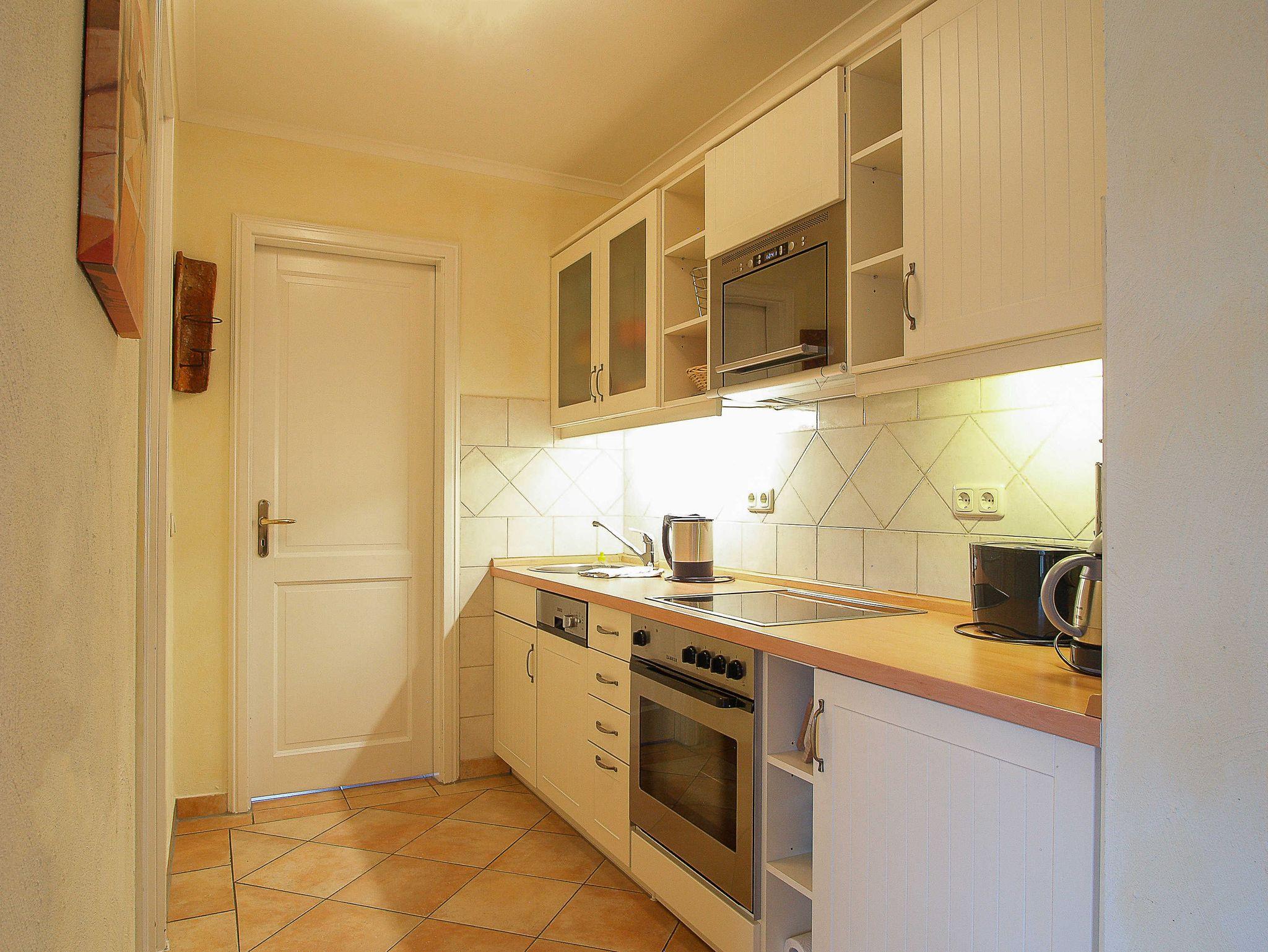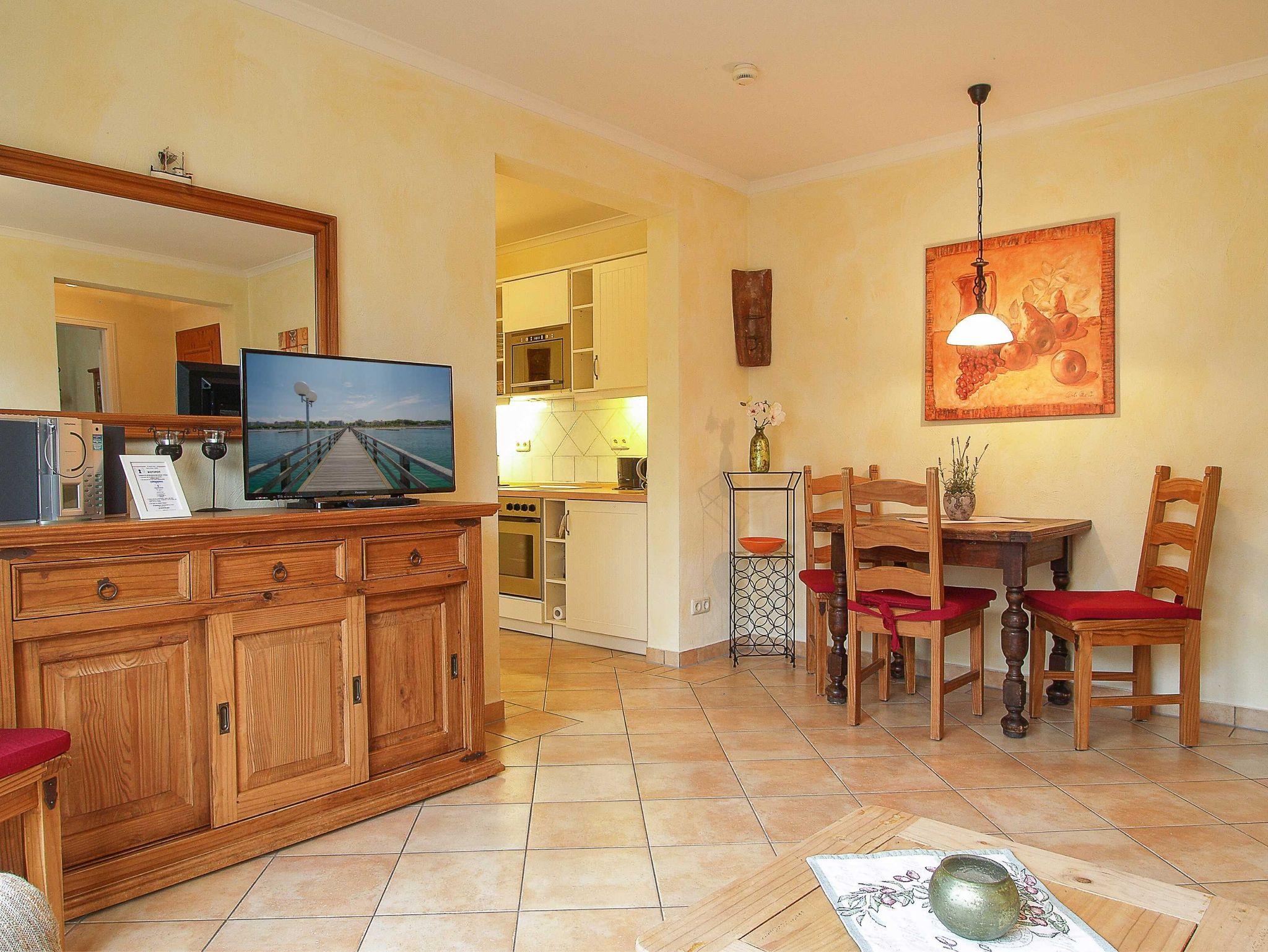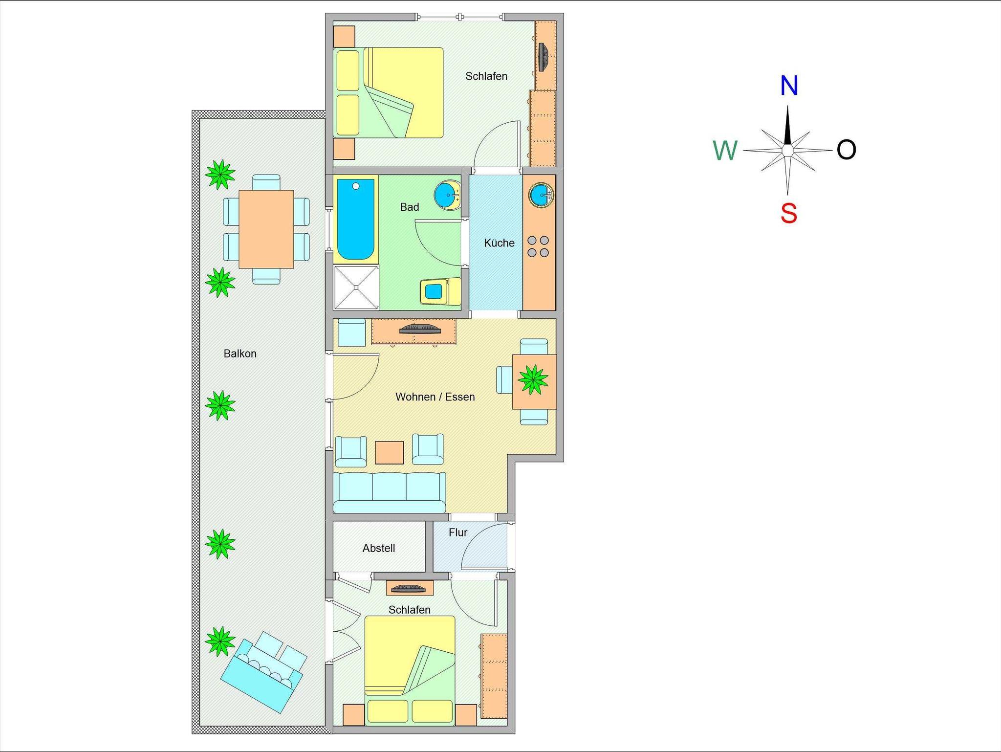 Herzlich willkommen in der Residenz Laguna! Hier kann der Urlaub beginnen! Im 1. Obergeschoss des Vorderhauses mit Blick auf die wunderschöne Wassergartenlandschaft im Innenhof befindet sich die Wohnung Nr. 06. Die liebevoll eingerichtete 3-Raum-Ferienwohnung mit ca. 72m² Wohnfläche bietet Platz für bis zu 4 Personen. Es empfängt Sie ein heller offener Wohnraum im mediterranen Stil mit gemütlicher Couch, Flachbild-TV, Stereoanlage, Essplatz etc. Das Herz der Wohnung ist der 32m² große möblierte West-Balkon mit direktem Blick auf den wunderschönen Innenhof und die mediterrane Teichlandschaft. Hier können Sie Sonnenbaden, Relaxen oder den Abend zu einem Glas Wein ausklingen lassen. Es schließt sich die offene voll ausgestattete Küchenzeile an. Sie bietet nicht nur ein 4-Platten-Cerankochfeld mit Backofen, eine Mikrowelle oder einen Geschirrspüler, sie ist insgesamt mit allen Utensilien ausgestattet, die zum Kochen von Genießern benötigt werden. Eine Kaffeemaschine ist ebenso vorhanden wie Toaster und Wasserkocher. Die Wohnung ist durchgehend mit mediterranen Fliesen versehen. Die beiden Schlafzimmer sind jeweils ausgestattet mit einem Doppelbett, einem geräumigen Kleiderschrank für Ihre Urlaubsgarderobe sowie einem Flachbild-TV. Ein Schlafzimmer ist mit Blick in den Innenhof ausgerichtet - Sie können von hier ebenfalls den großen Balkon betreten. Das andere Schlafzimmer gibt einen Blick in Richtung Norden frei. Das ebenfalls im mediterranen Stil geflieste Tageslichtbad ist sowohl mit einer Dusche als auch einer Badewanne ausgestattet und bietet genügend Ablagefläche für Ihre Badutensilien. Ein Badheizkörper sorgt für immer kuschlig warme Handtücher.