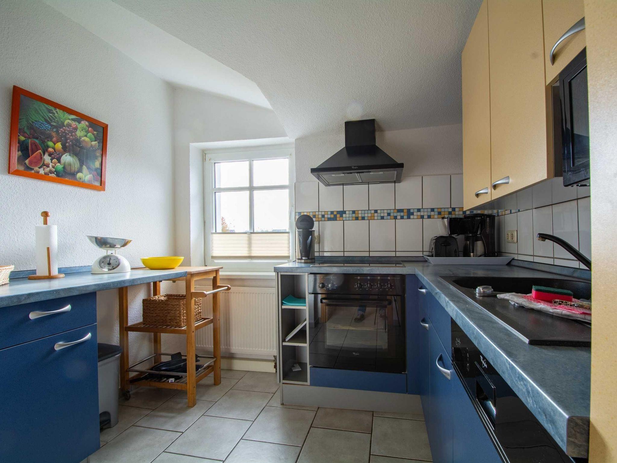 Die voll eingerichtete Küche hält für Sie alle wichtigen Küchengeräte und -utensilien bereit, die Sie für Ihr perfektes Dinner benötigen: Ein 4-Zonen-Cerankochfeld, ein Backofen mit Dunstabzug, ein Geschirrspüler, eine Mikrowelle sowie ein Kühlschrank mit Gefrierfach. Eine Kaffeemaschine, ein Wasserkocher und ein Toaster sowie genügend Koch- und Essgeschirr vervollständigen die Kücheneinrichtung.