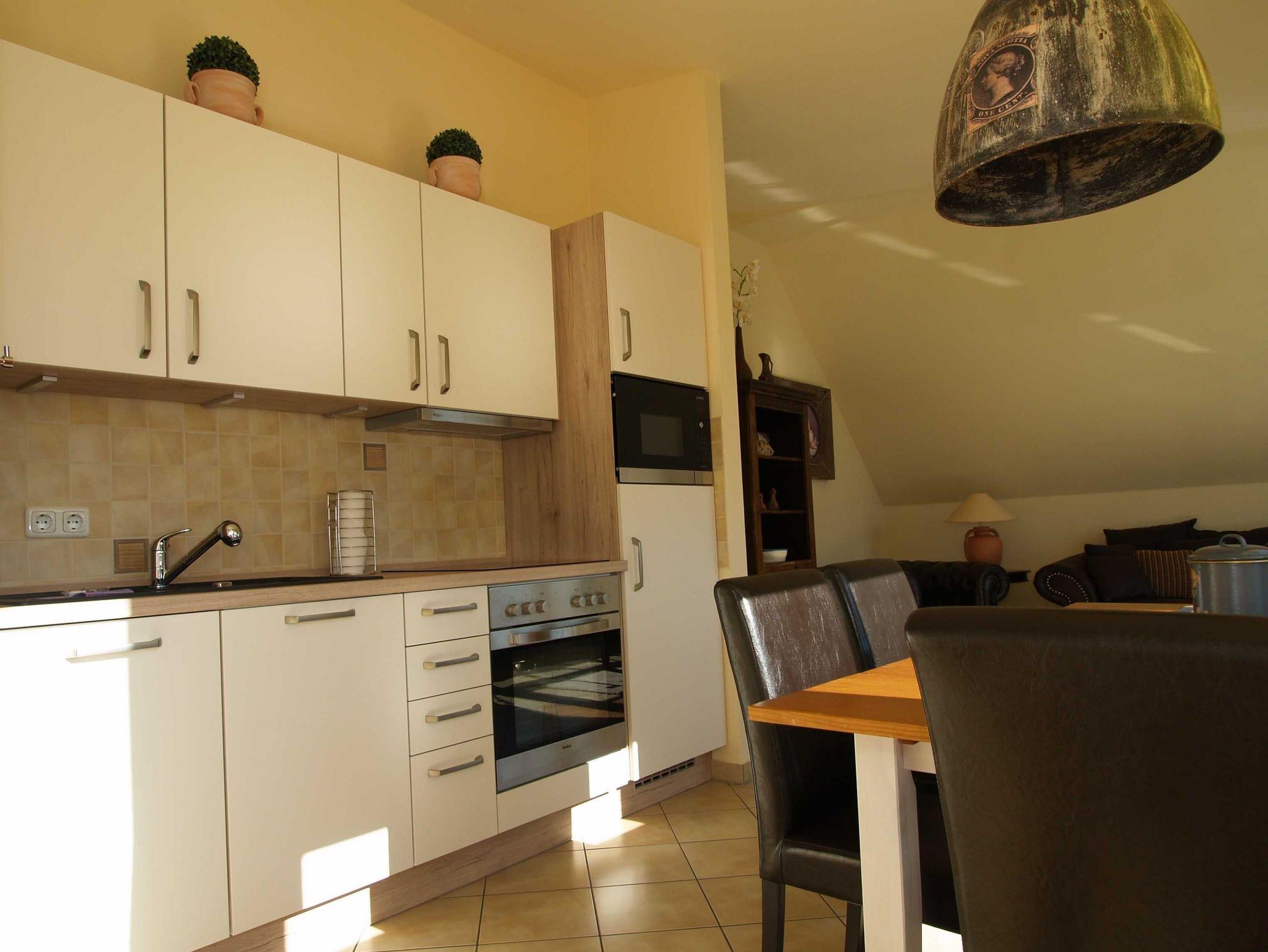 Die offene helle Küchenzeile hält für Sie alle wichtigen Küchengeräte und -utensilien bereit, die Sie für Ihr perfektes Dinner benötigen: Ein 4-Zonen-Cerankochfeld mit Backofen, ein Geschirrspüler, eine Mikrowelle sowie ein Kühlschrank mit Gefrierfach befinden sich in der Küche. Eine Kaffeemaschine, ein Wasserkocher und ein Toaster sowie genügend Koch- und Essgeschirr vervollständigen die Kücheneinrichtung.