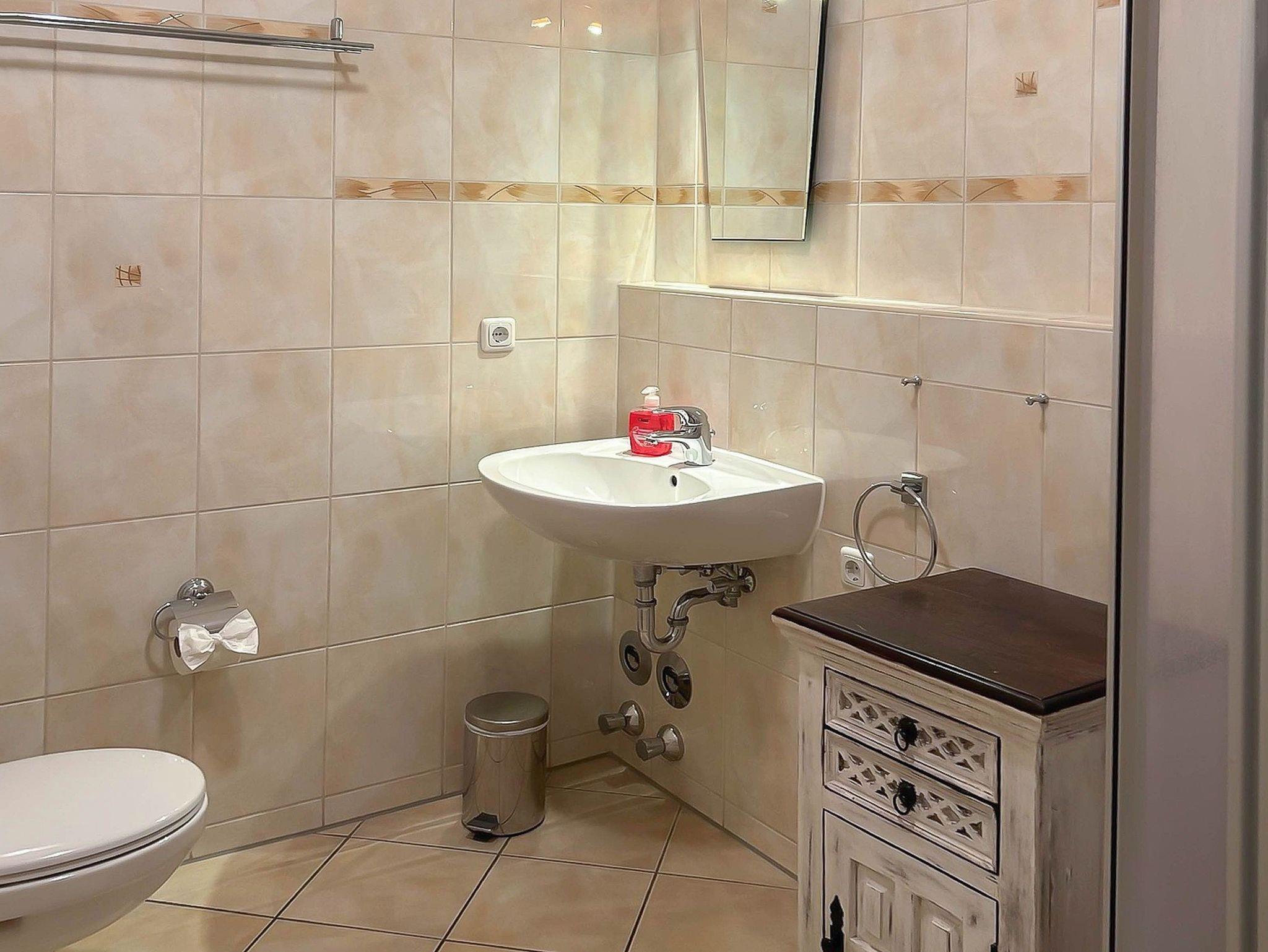 Im Schlafzimmer lädt Sie ein komfortables Doppelbett (2 x 90cm x 200 cm) zur Nachtruhe ein. Der großzügige Kleiderschrank mit Ganzkörperspiegel bietet genügend Platz für Ihre Urlaubsgarderobe. Als Sichtschutz bzw. zum Verdunkeln ist im Schlafzimmer ein Rollo angebracht. Das Bad mit Dusche und WC vervollständigt das Gesamtbild dieser Wohnung.