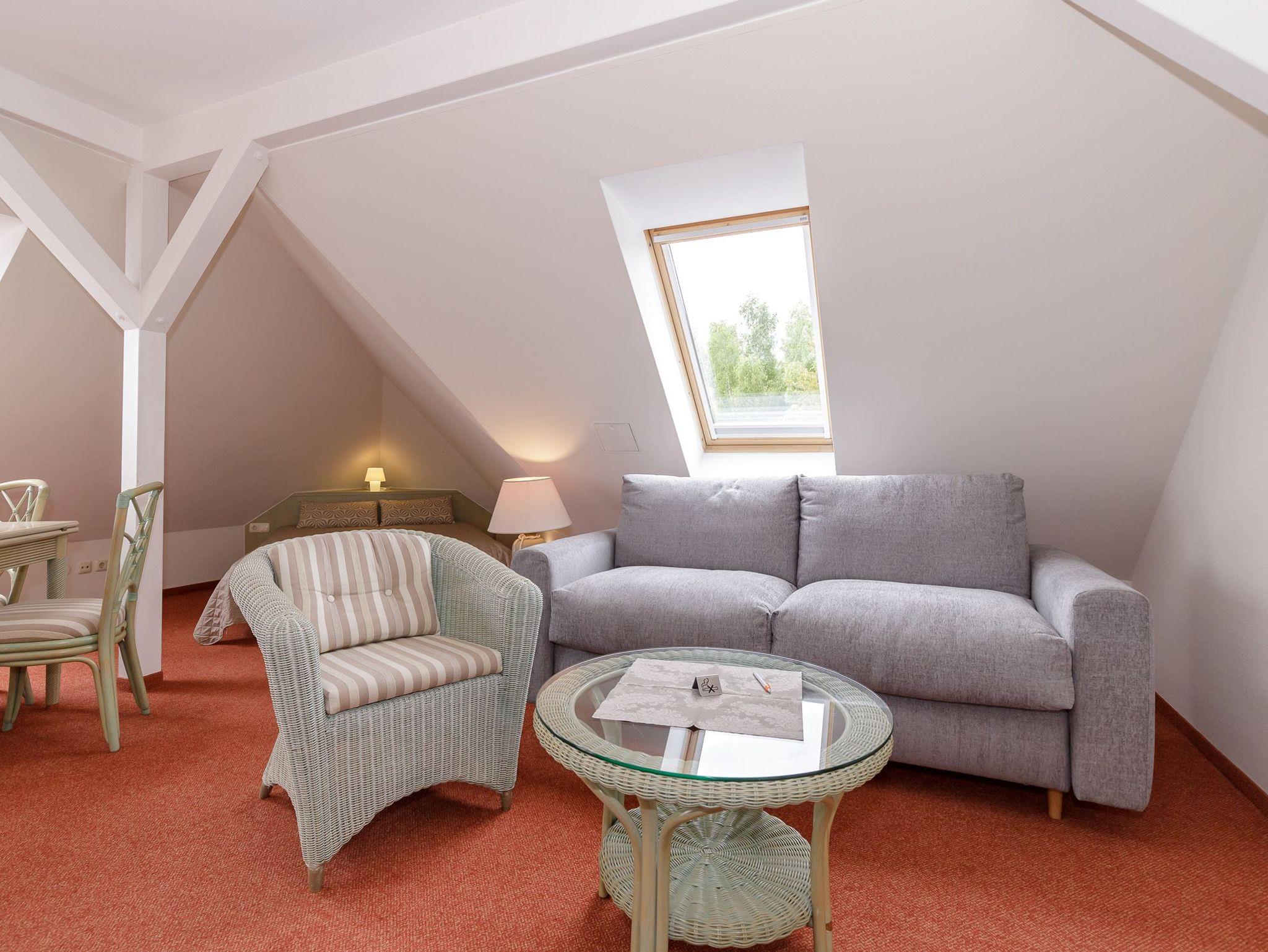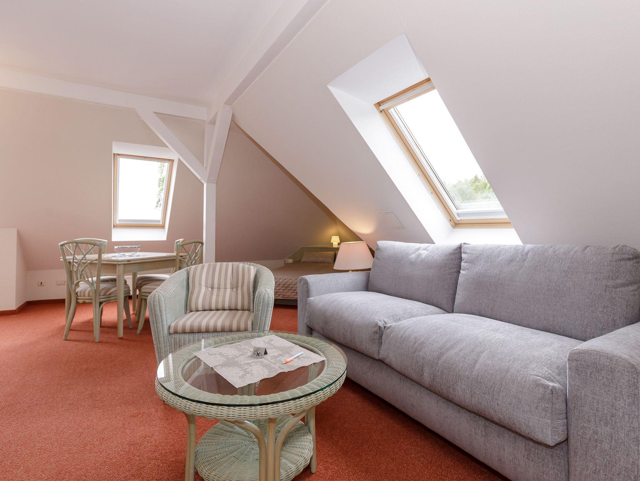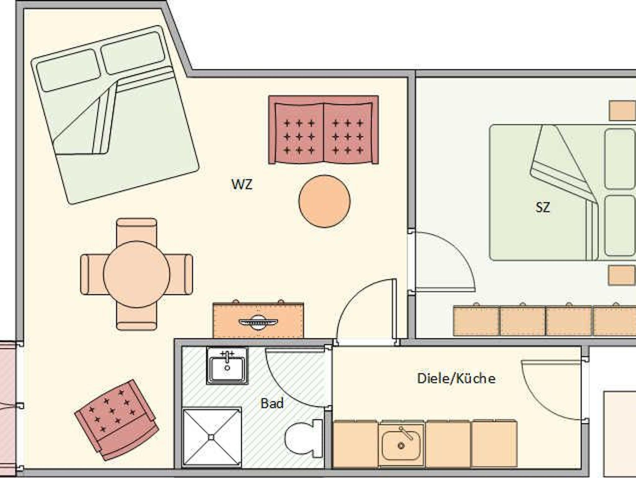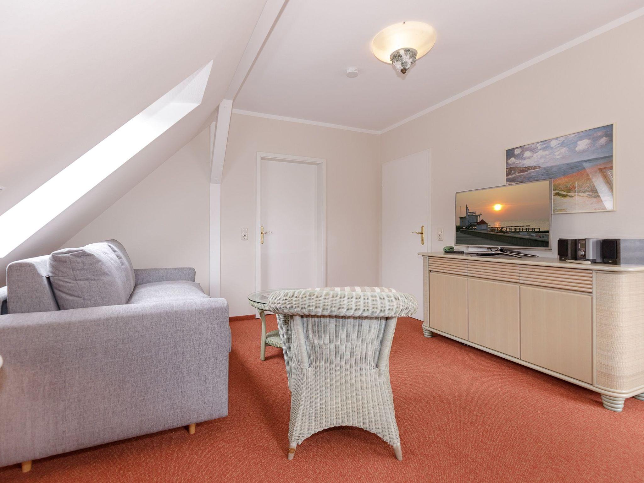 Die Wohnung ist im oberen Dachgeschoss gelegen und hat einen Balkon zur Ostseite. Die Wohnungsgröße beträgt ca. 40 qm und teilt sich in Wohnzimmer, Küche, Schlafzimmer, Duschbad. Im Wohnzimmer befindet sich ein Esstisch mit 4 Stühlen sowie in einem separaten Bereich ein komfortables Doppelbett, Küche mit Ceranfeld und Geschirrspüler, Kühlschrank, Mikrowelle mit Backofen, Tresor, HD-Sat TV und Telefon.