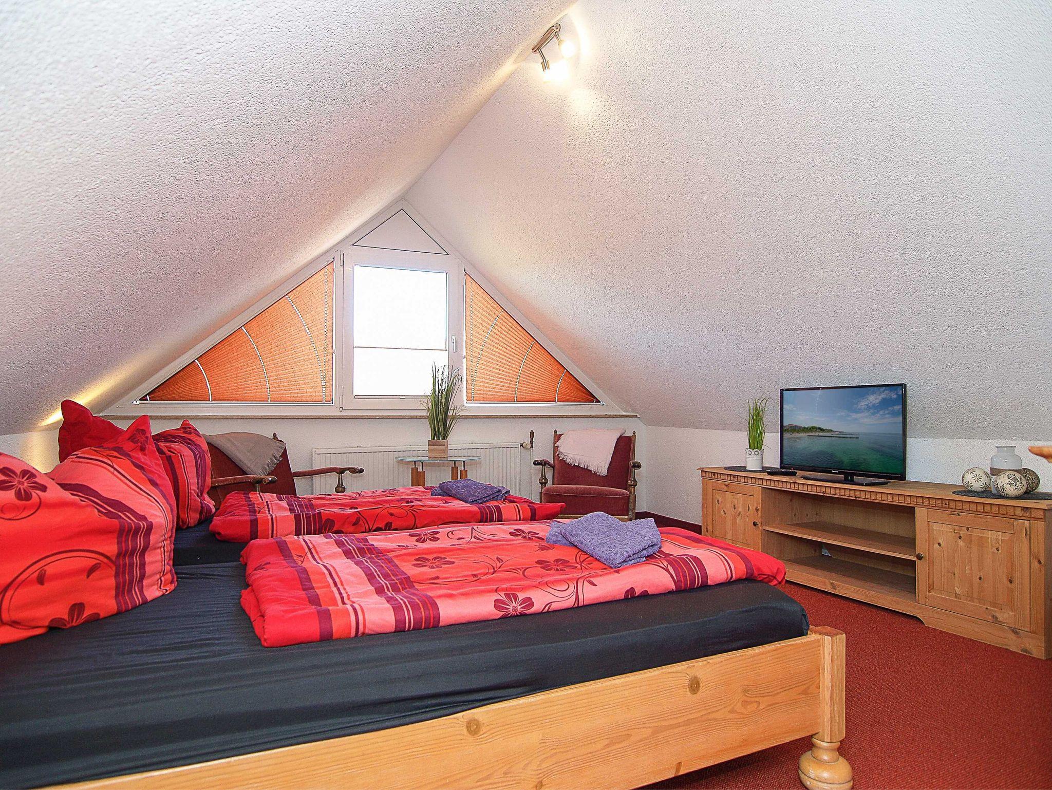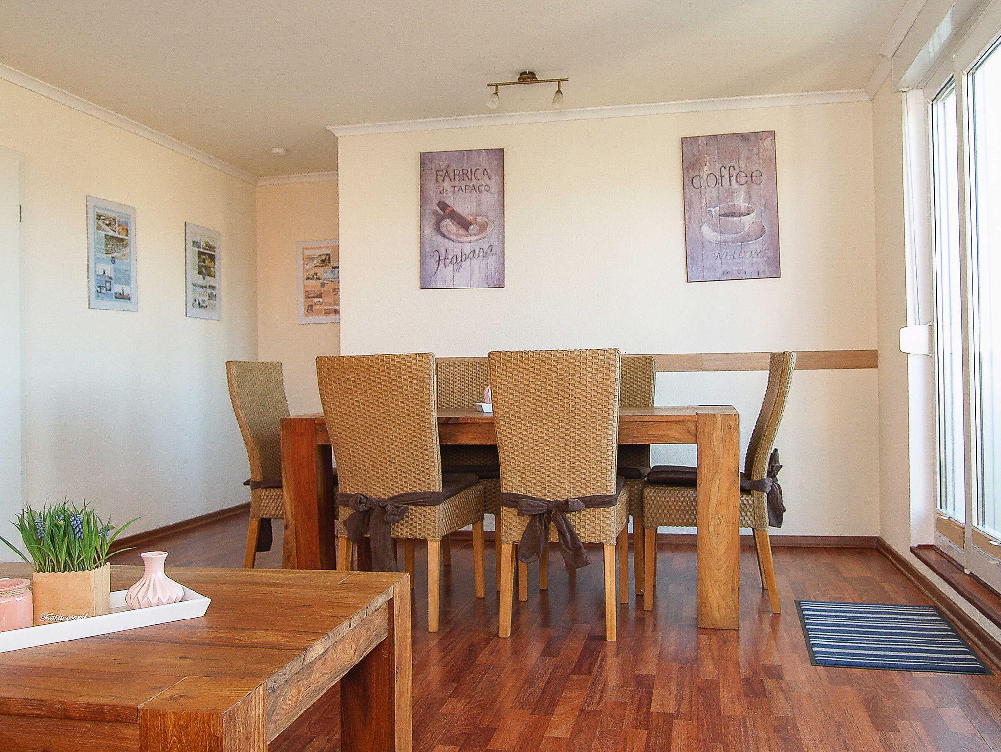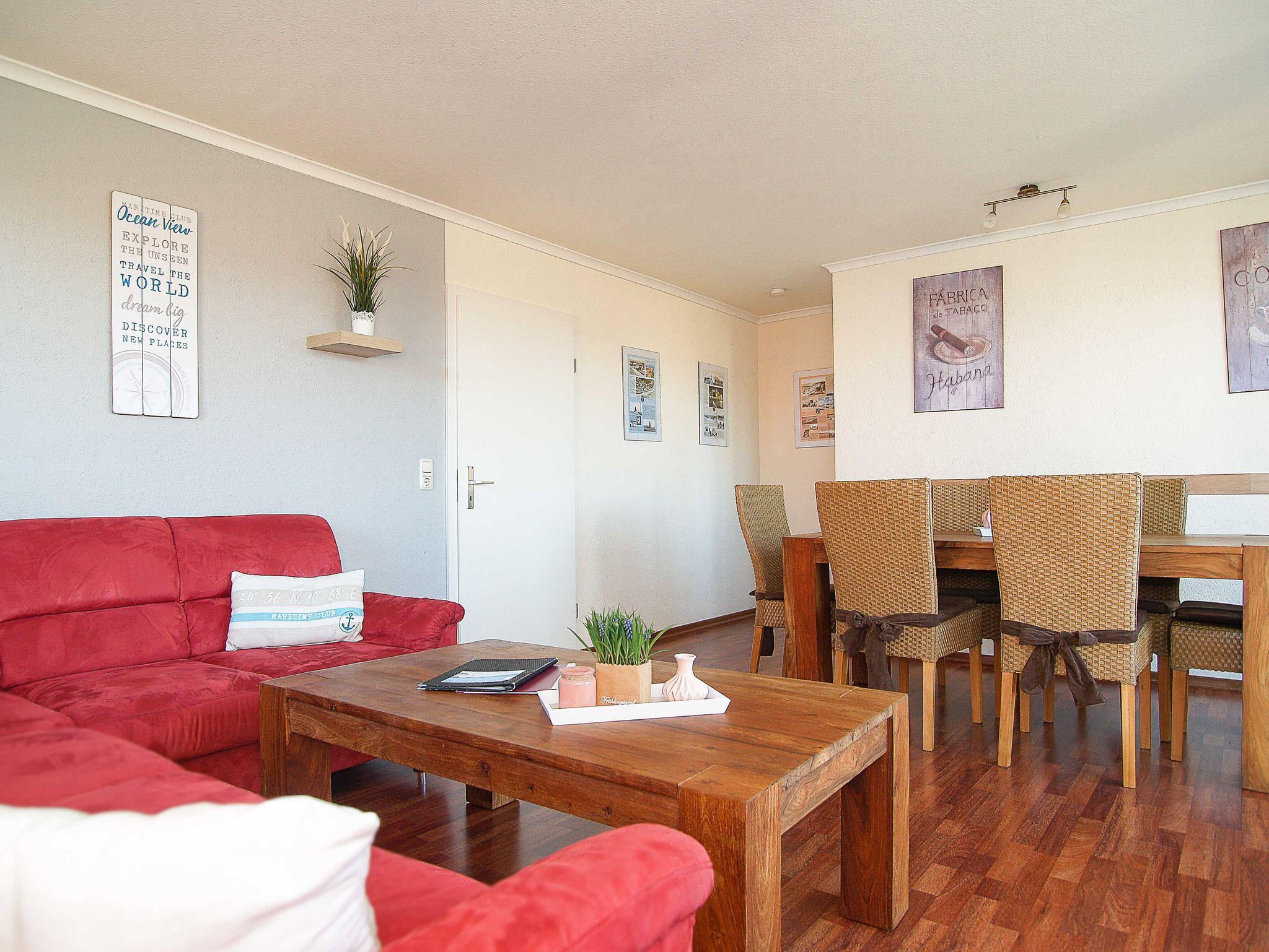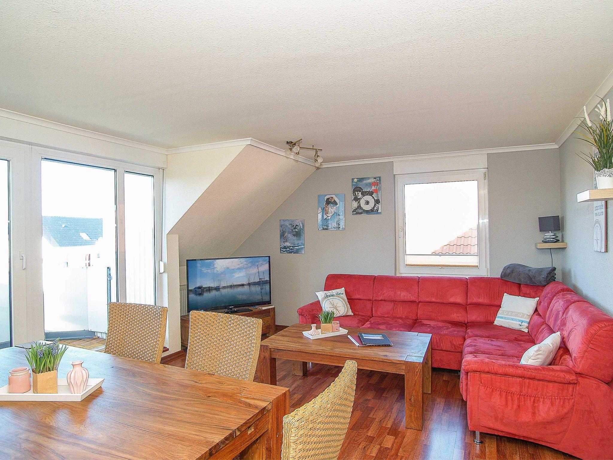 Sie wohnen in einer ca. 82m² grossen 4-Raum-Wohnung, die sich im ersten Obergeschoss befindet und über zwei Etagen verläuft. Der Wohnraum ist ausgestattet mit einer bequemen Sitzecke, einem Fernsehgerät und dem Essbereich. Vom Wohnraum gelangen Sie auf den schönen West-Balkon. Die separate Küche ist ausgestattet mit einem Ceranfeld, einem Backofen, einem Geschirrspüler, einem großen Kühlschrank mit Gefrierfächern und einer Mikrowelle. Es gibt ein Schlafzimmer mit einem Doppelbett und einem großzügigen Kleiderschrank, sowie ein Schlafzimmer mit einem ausziehbaren Kojenbett. Über eine Treppe gelangen Sie zu dem dritten Schlafzimmer. Das offene Schlafzimmer ist ausgestattet mit zwei Einzelbetten und einem zusätzlichen Fernsehgerät. In dem hellen Badezimmer befinden sich eine ebenerdige Dusche und das WC.