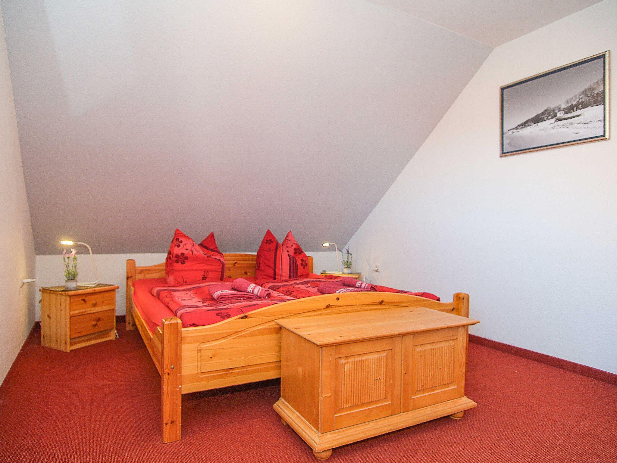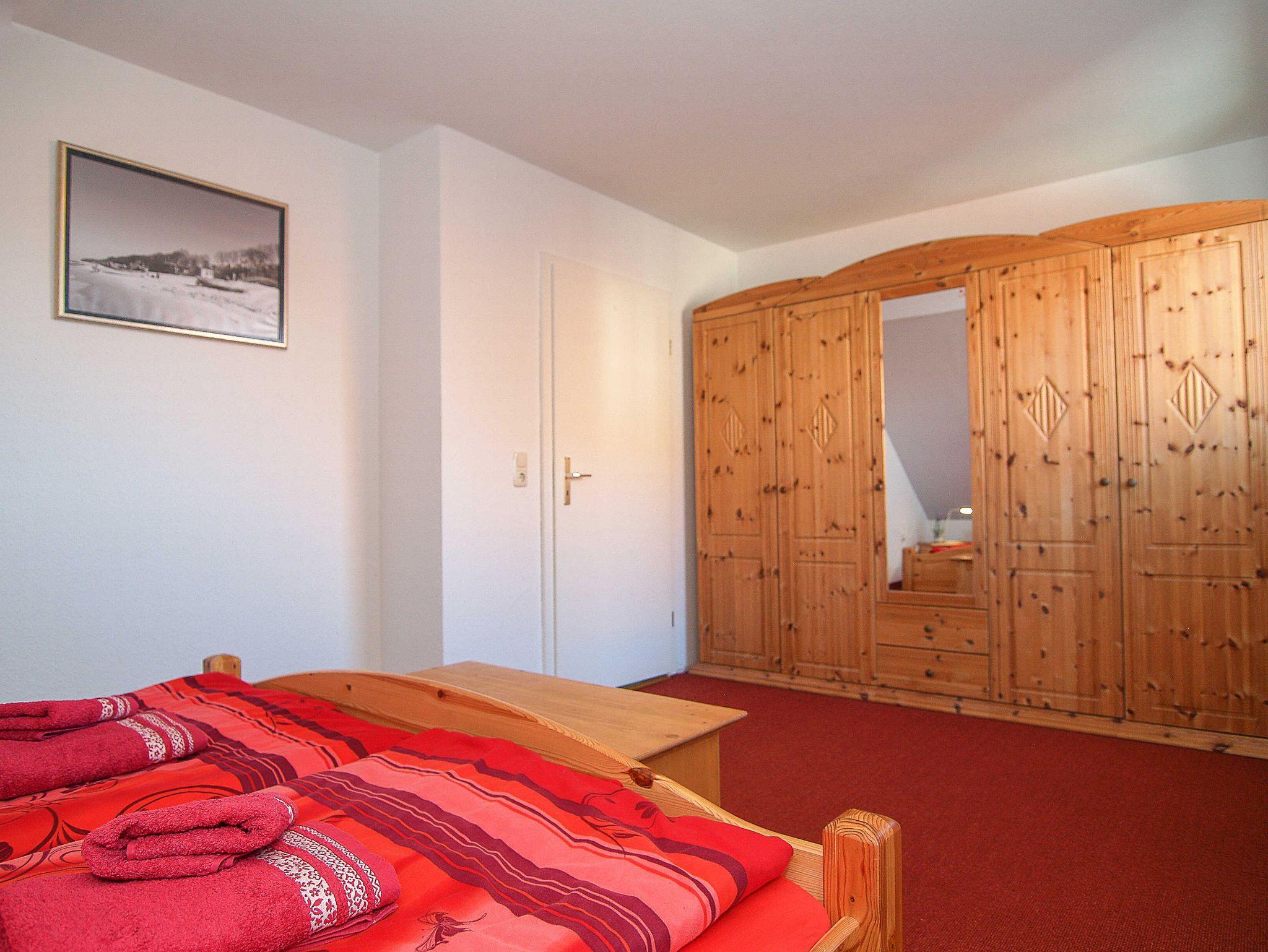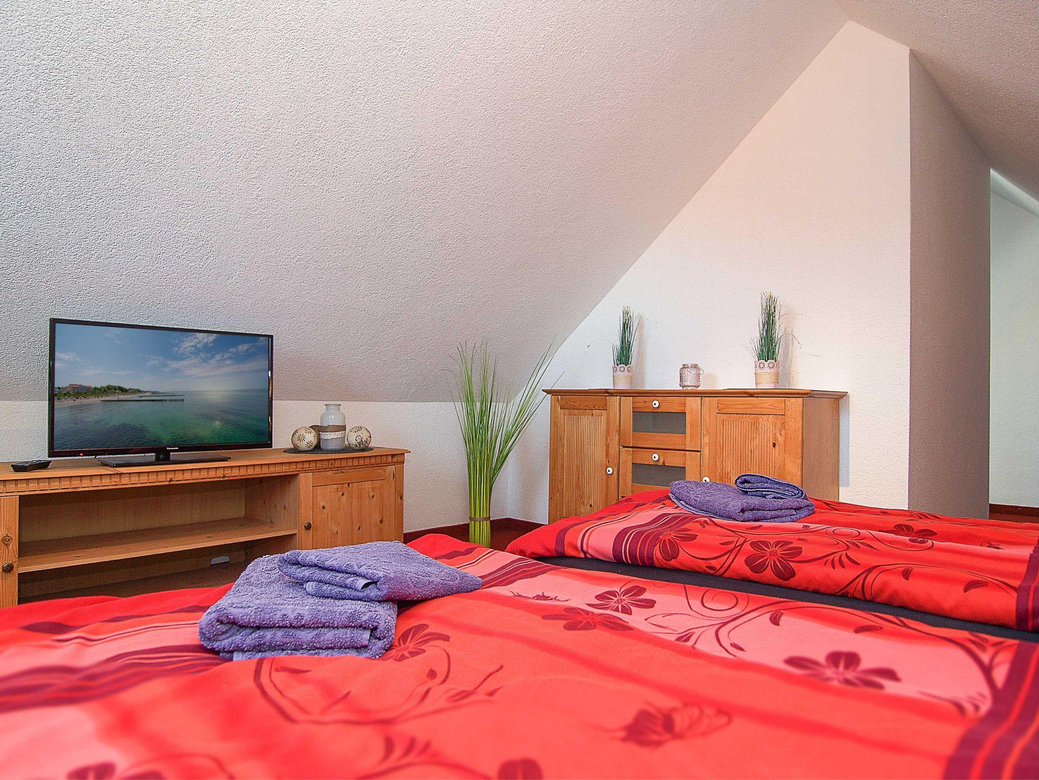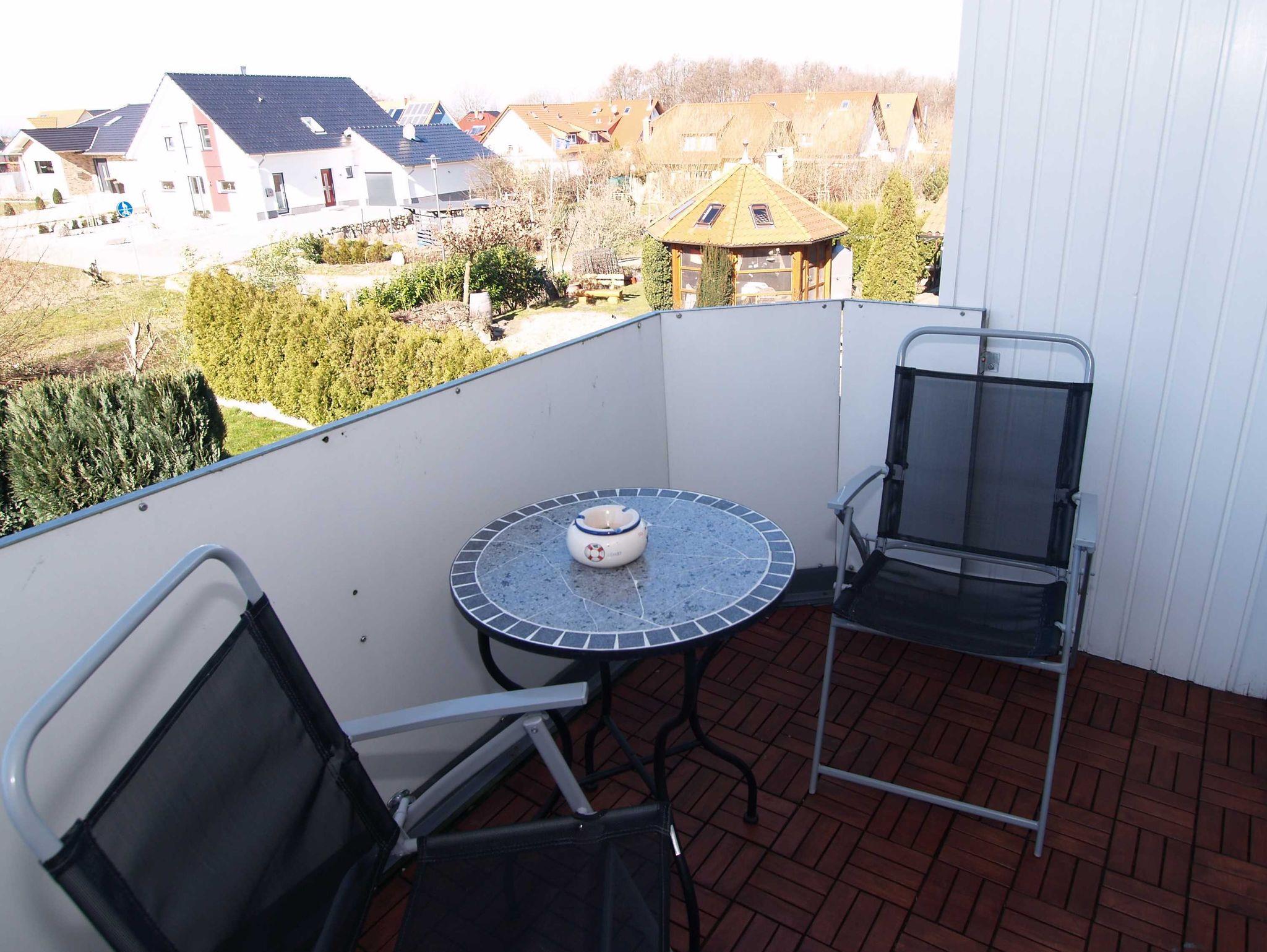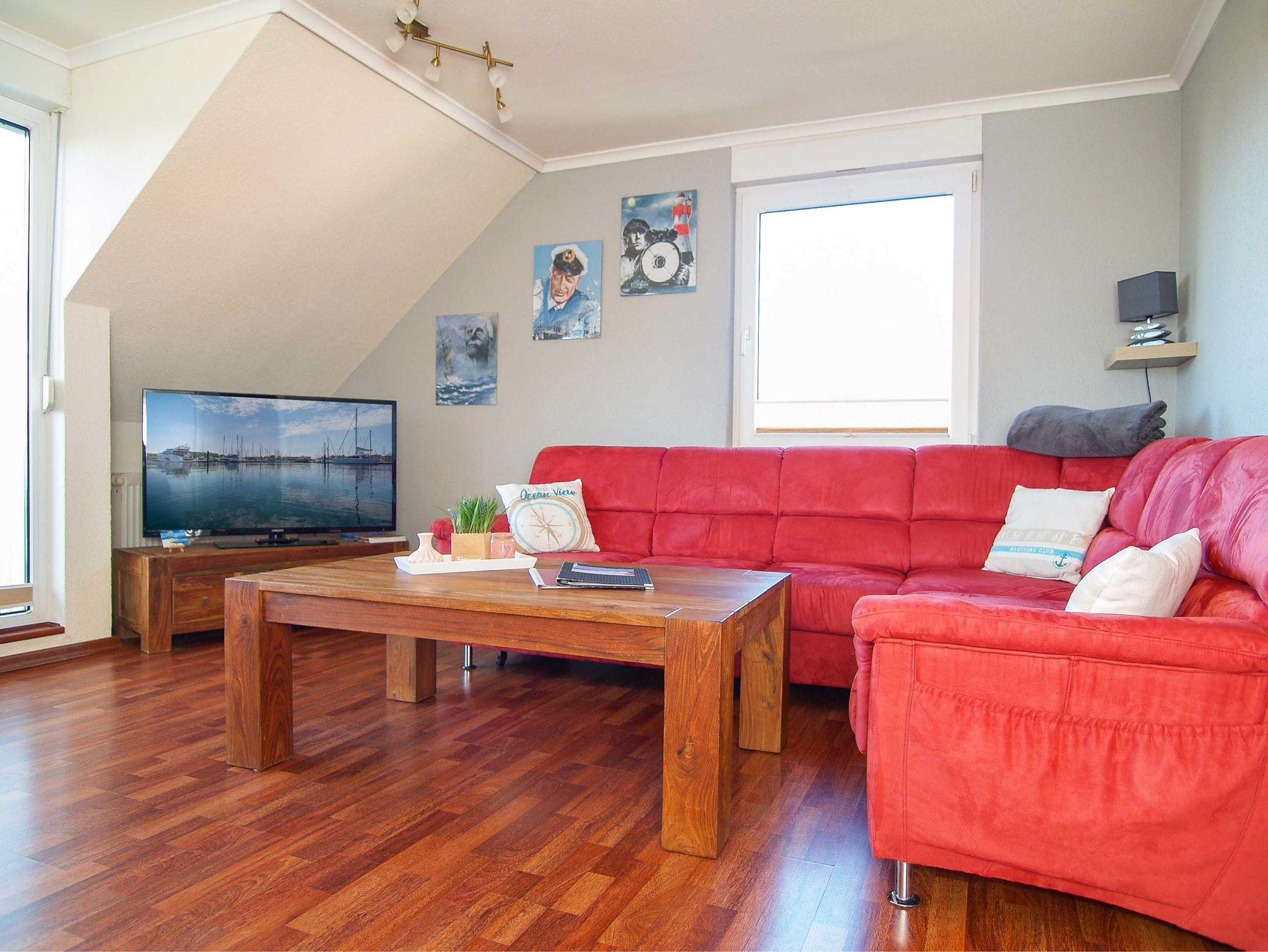 Sie wohnen in einer ca. 82m² grossen 4-Raum-Wohnung, die sich im ersten Obergeschoss befindet und über zwei Etagen verläuft. Der Wohnraum ist ausgestattet mit einer bequemen Sitzecke, einem Fernsehgerät und dem Essbereich. Vom Wohnraum gelangen Sie auf den schönen West-Balkon. Die separate Küche ist ausgestattet mit einem Ceranfeld, einem Backofen, einem Geschirrspüler, einem großen Kühlschrank mit Gefrierfächern und einer Mikrowelle. Es gibt ein Schlafzimmer mit einem Doppelbett und einem großzügigen Kleiderschrank, sowie ein Schlafzimmer mit einem ausziehbaren Kojenbett. Über eine Treppe gelangen Sie zu dem dritten Schlafzimmer. Das offene Schlafzimmer ist ausgestattet mit zwei Einzelbetten und einem zusätzlichen Fernsehgerät. In dem hellen Badezimmer befinden sich eine ebenerdige Dusche und das WC.