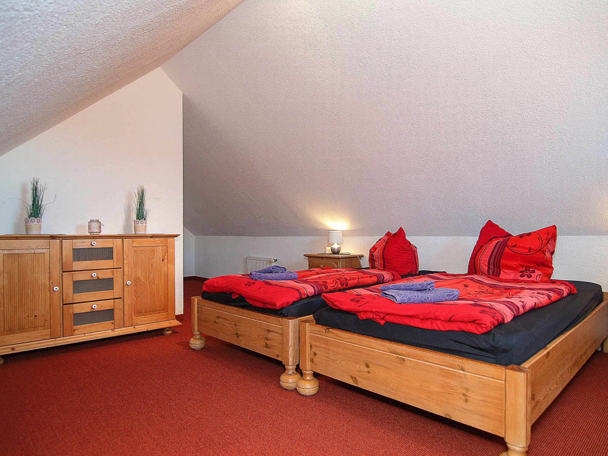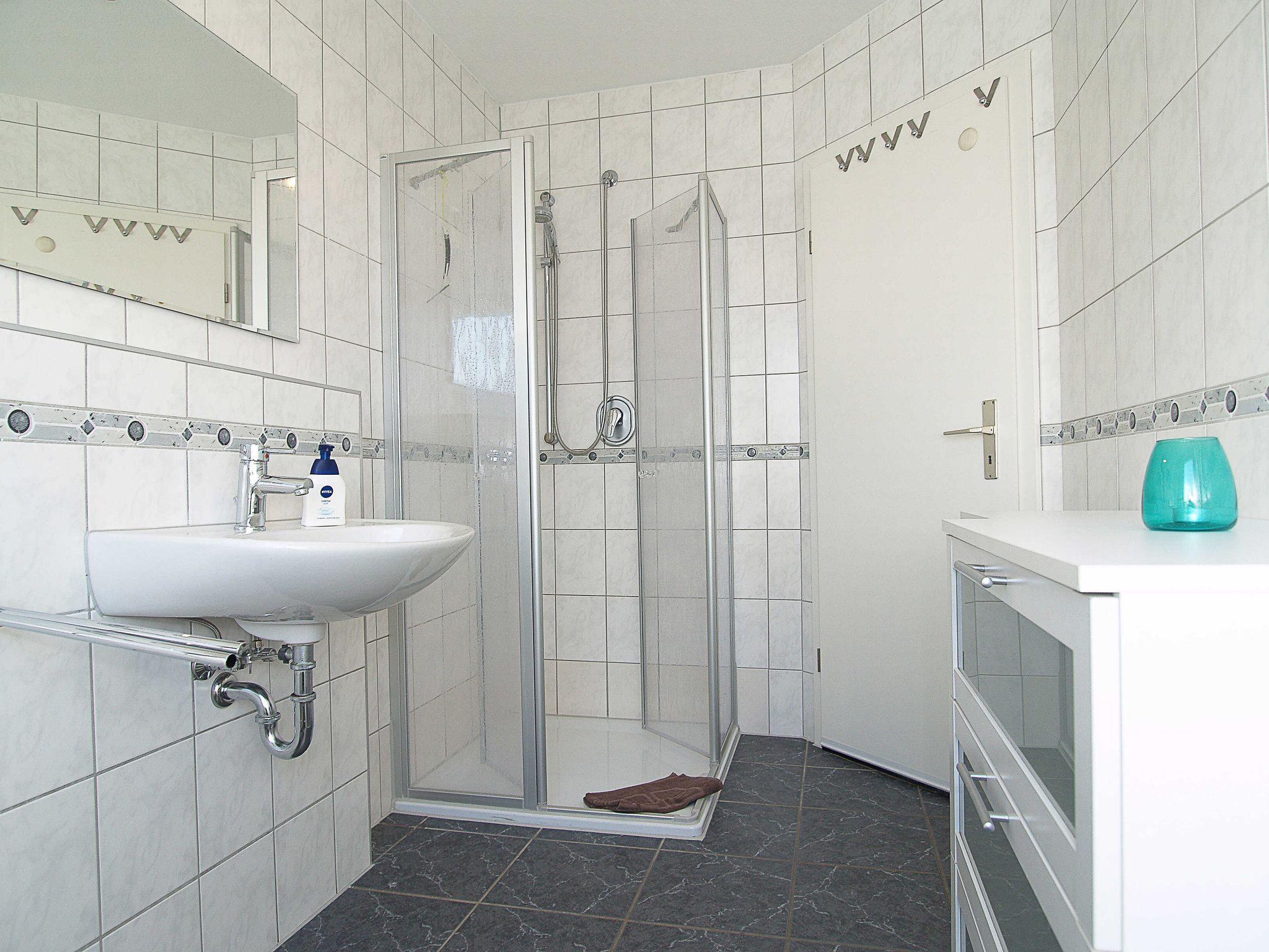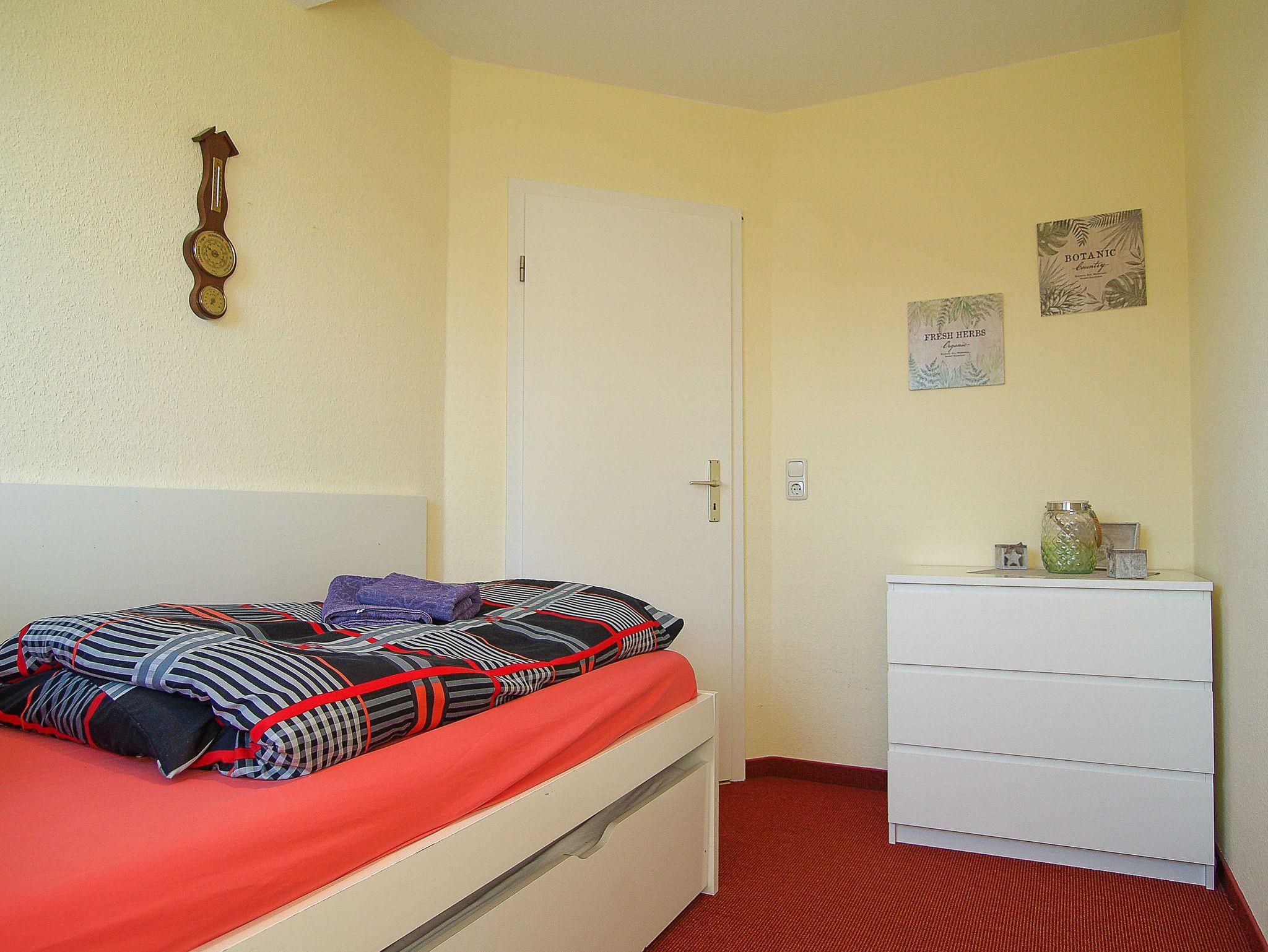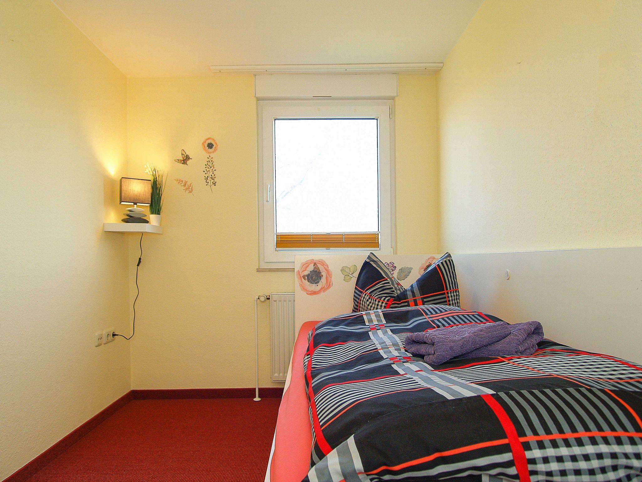Sie wohnen in einer ca. 82m² grossen 4-Raum-Wohnung, die sich im ersten Obergeschoss befindet und über zwei Etagen verläuft. Der Wohnraum ist ausgestattet mit einer bequemen Sitzecke, einem Fernsehgerät und dem Essbereich. Vom Wohnraum gelangen Sie auf den schönen West-Balkon. Die separate Küche ist ausgestattet mit einem Ceranfeld, einem Backofen, einem Geschirrspüler, einem großen Kühlschrank mit Gefrierfächern und einer Mikrowelle. Es gibt ein Schlafzimmer mit einem Doppelbett und einem großzügigen Kleiderschrank, sowie ein Schlafzimmer mit einem ausziehbaren Kojenbett. Über eine Treppe gelangen Sie zu dem dritten Schlafzimmer. Das offene Schlafzimmer ist ausgestattet mit zwei Einzelbetten und einem zusätzlichen Fernsehgerät. In dem hellen Badezimmer befinden sich eine ebenerdige Dusche und das WC.