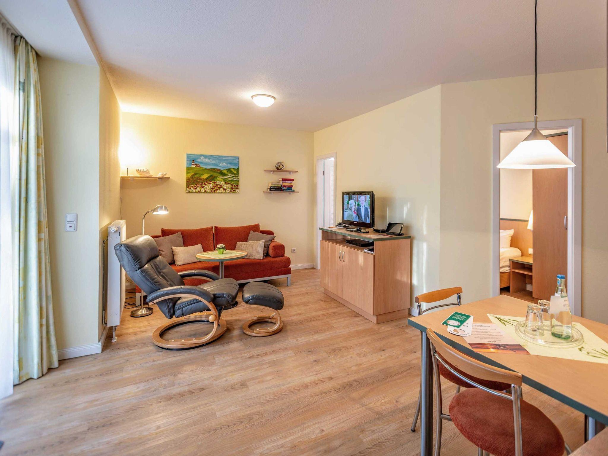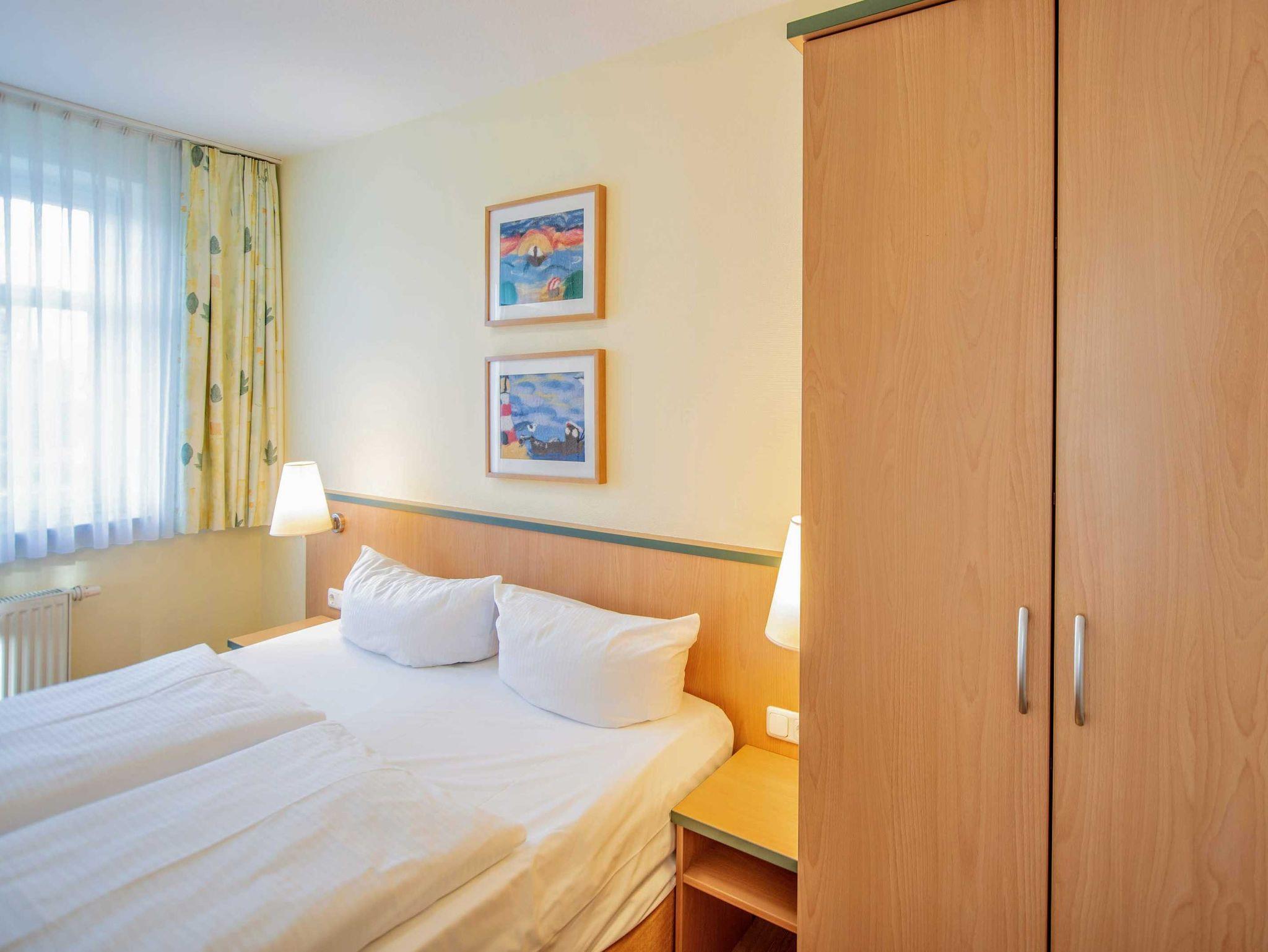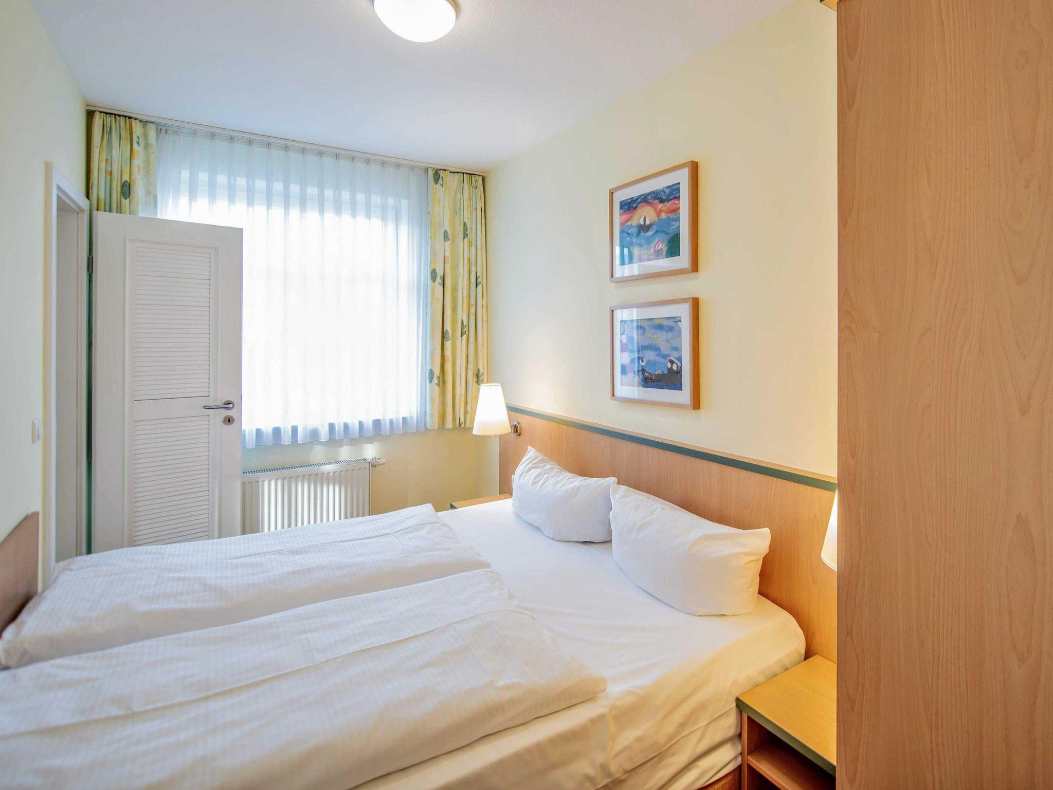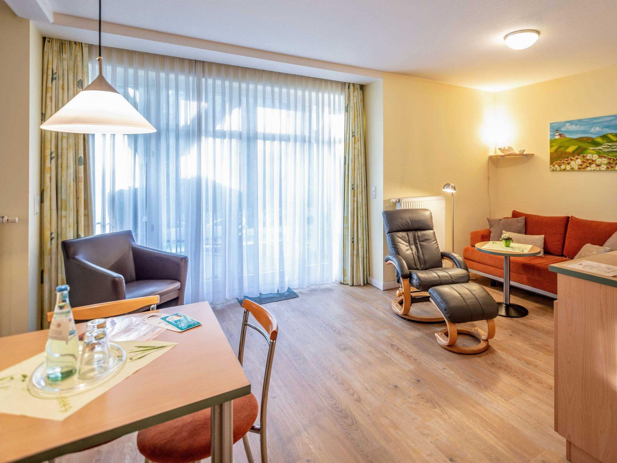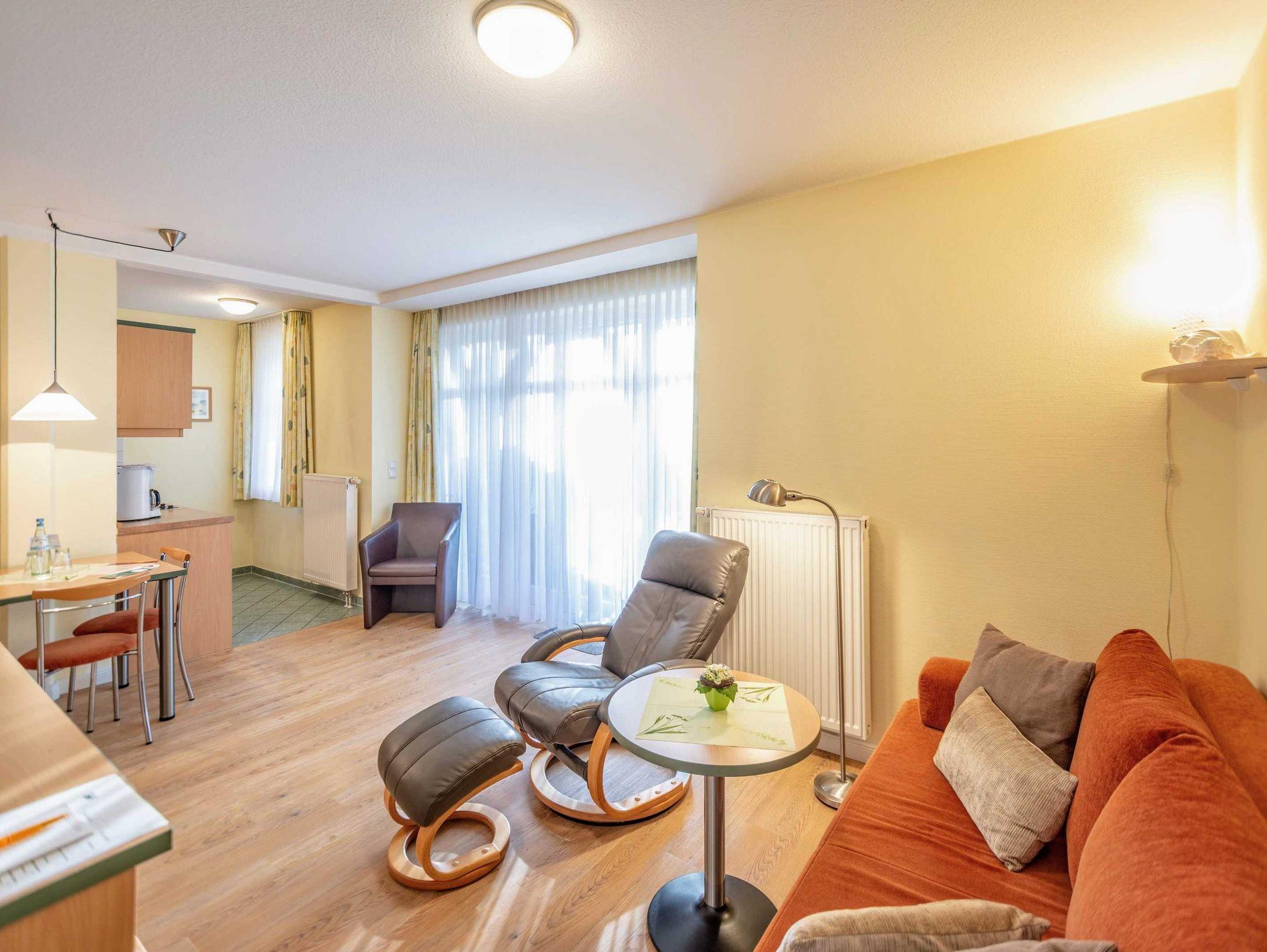 Das 2-Zimmer-Apartment mit Teppichboden befindet sich im Erdgeschoss des Hauses Waldeck. Mit ca. 40 m² Wohnfläche und einer Terrasse mit Strandkorb zur Südseite und Blick zum Stadtwald (sehr ruhige Lage), besteht das Apartment aus einem Wohnzimmer mit Schlafcouch und einer voll ausgestatteten Küchenzeile mit Geschirrspülmaschine, Kühlschrank, Mikrowelle, Zwei-Platten-Cerankochfeld, Kaffeemaschine, Wasserkocher und einem Toaster. Das Schlafzimmer verfügt über ein Doppelbett. Im Badezimmer befindet sich eine Badewanne, ein Fön wird Ihnen zur Verfügung gestellt. Das Apartment ist für maximal 2 Erwachsene und insgesamt 3 Personen geeignet, auch Hunde sind gestattet.