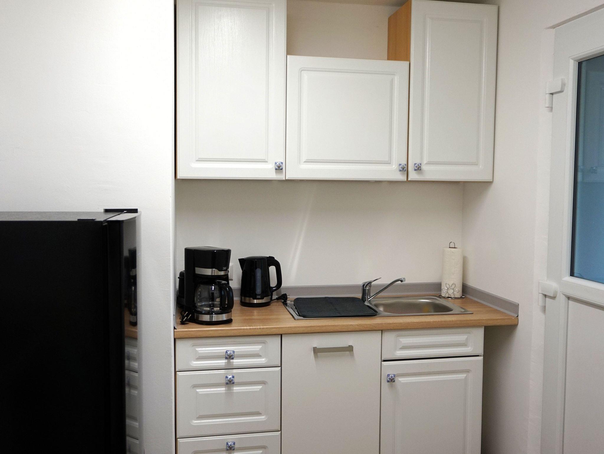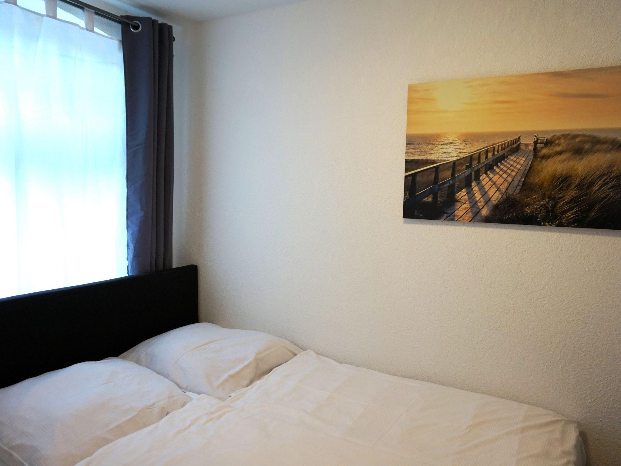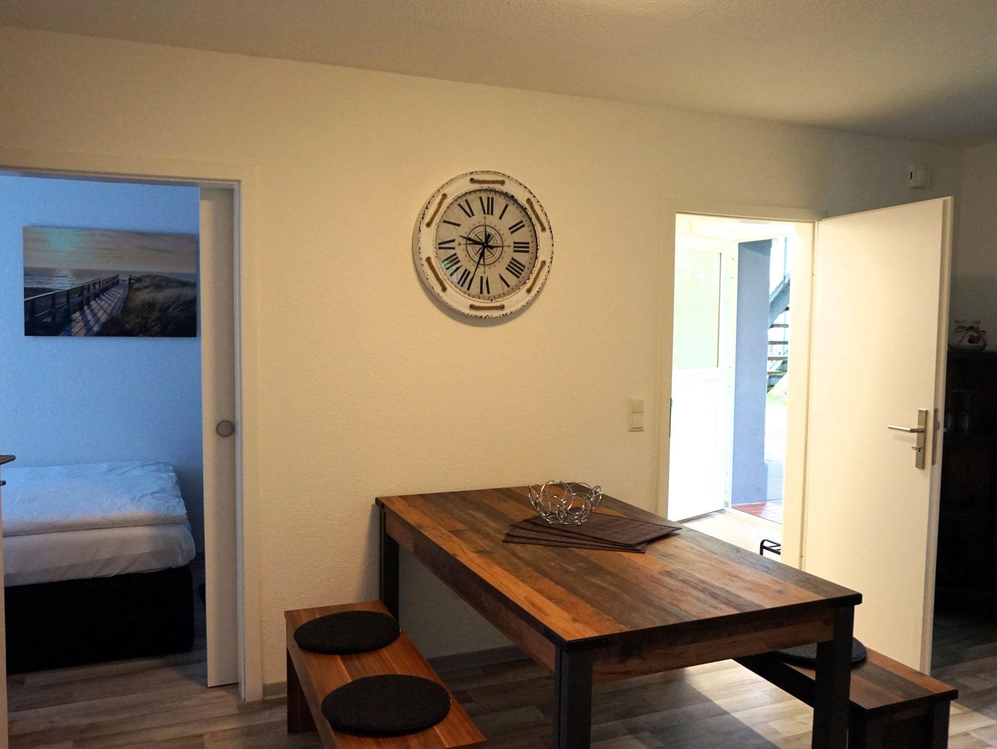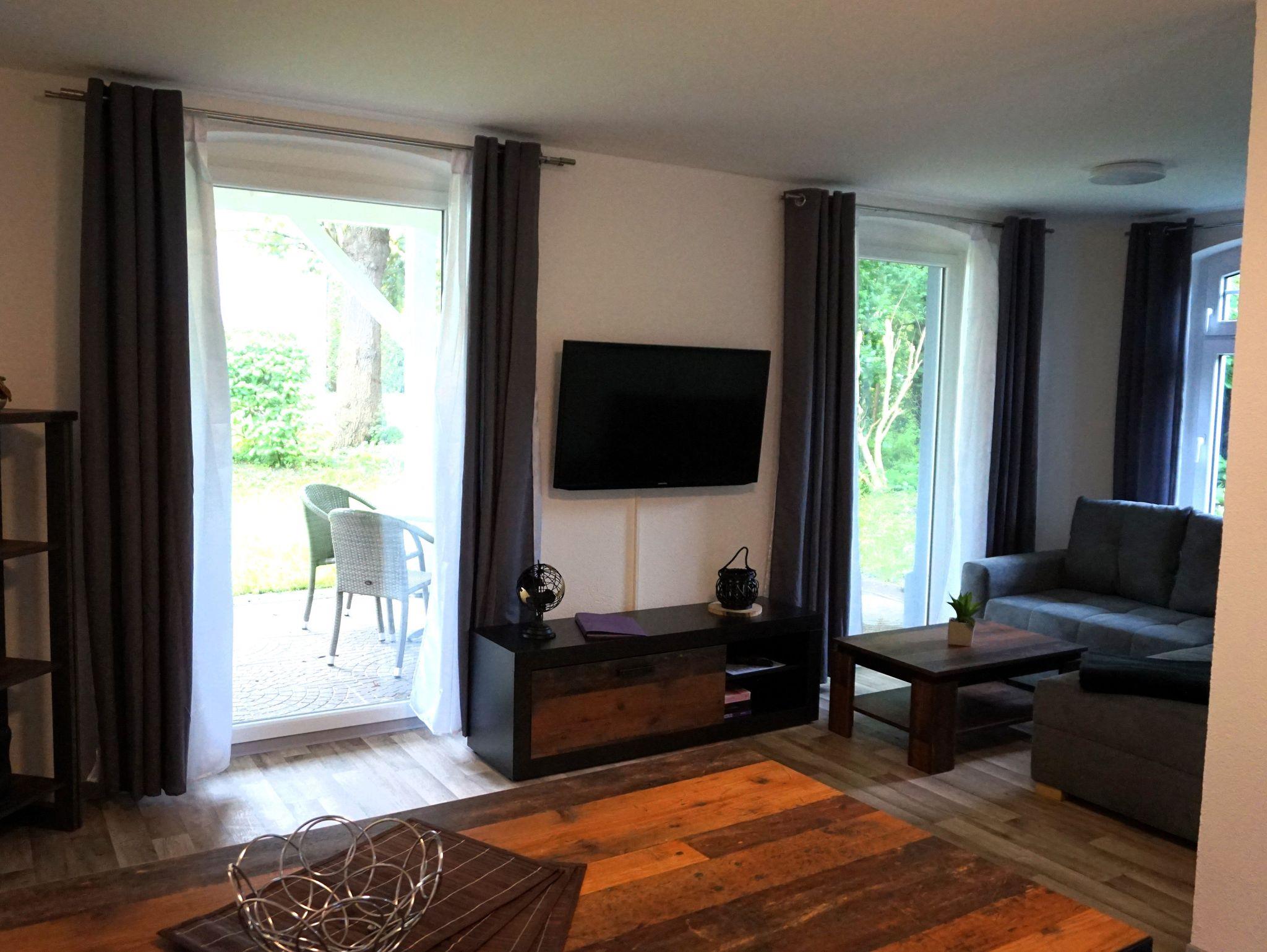 Die funktional gestaltete Ferienwohnung im Erdgeschoss hat ein Wohnzimmer mit Essecke für 4 Personen, eine kleine Küche, ein Schlafzimmer mit Doppelbett, ein Gästezimmer mit Boxspringbett und eine Terrasse. Die kleine Küche ist mit 4-Platten-Ceranfeld, Backofen, Kühlschrank mit Gefrierfach, Mikrowelle, Geschirrspüler, Kaffeemaschine und div. Geschirr ausgestattet. Ein Bad mit Fenster, Dusche, Waschbecken und WC komplettieren den guten Gesamteindruck der Wohnung.