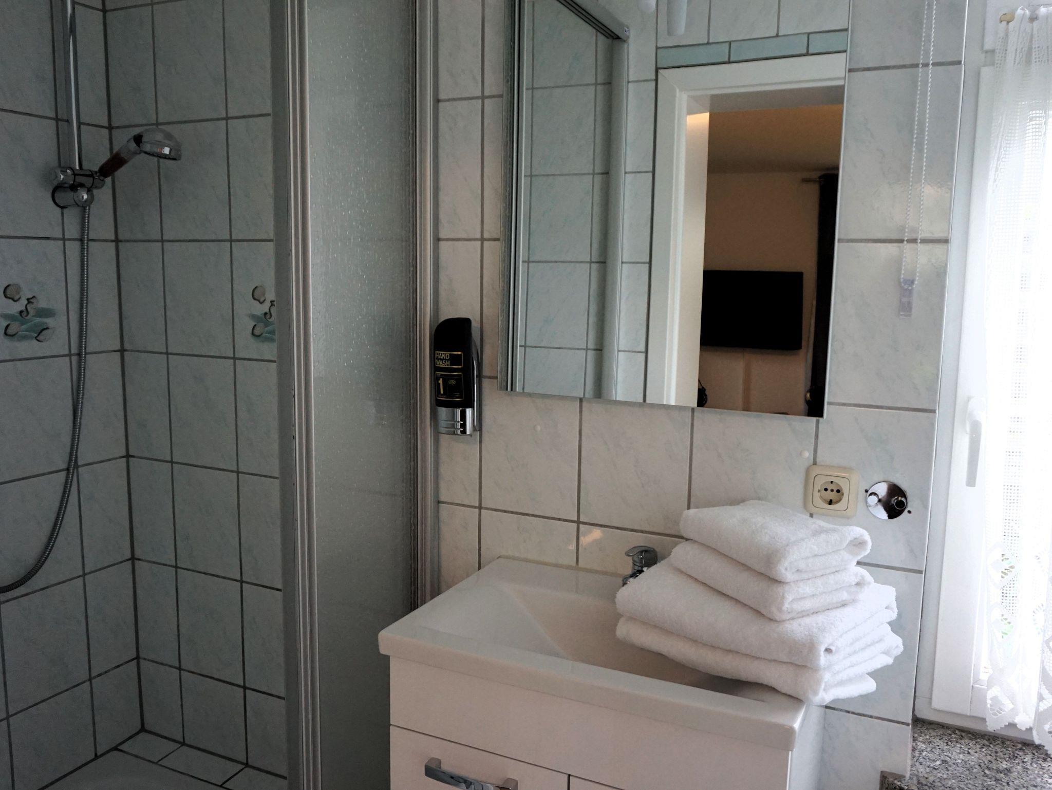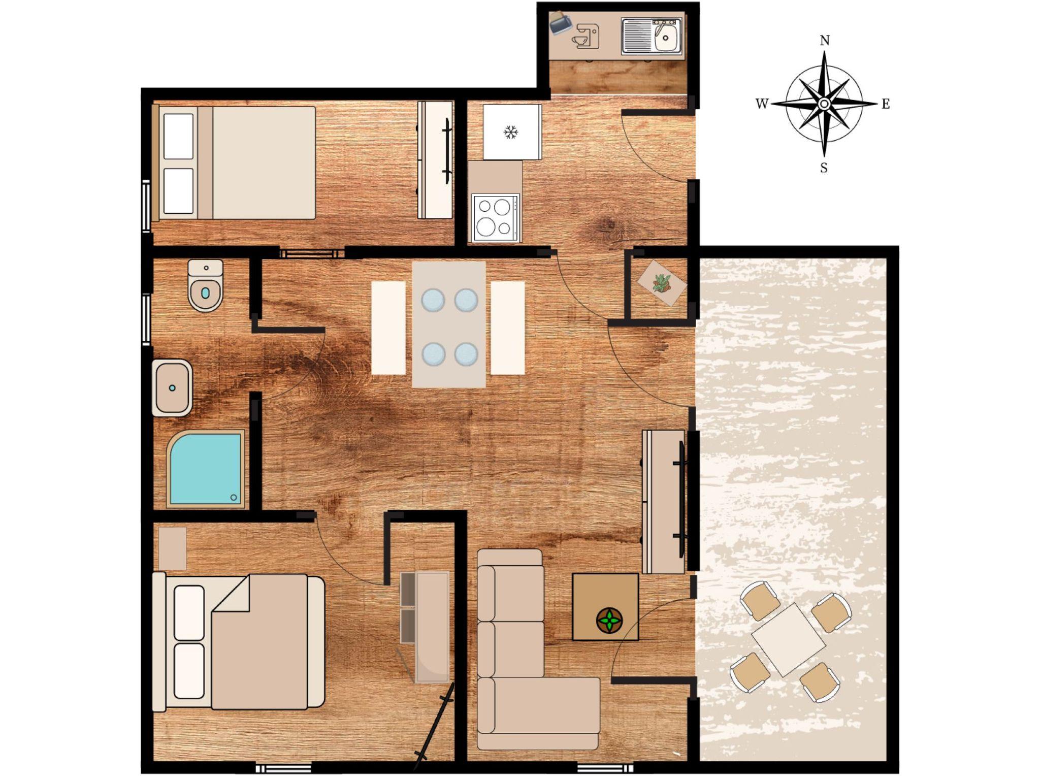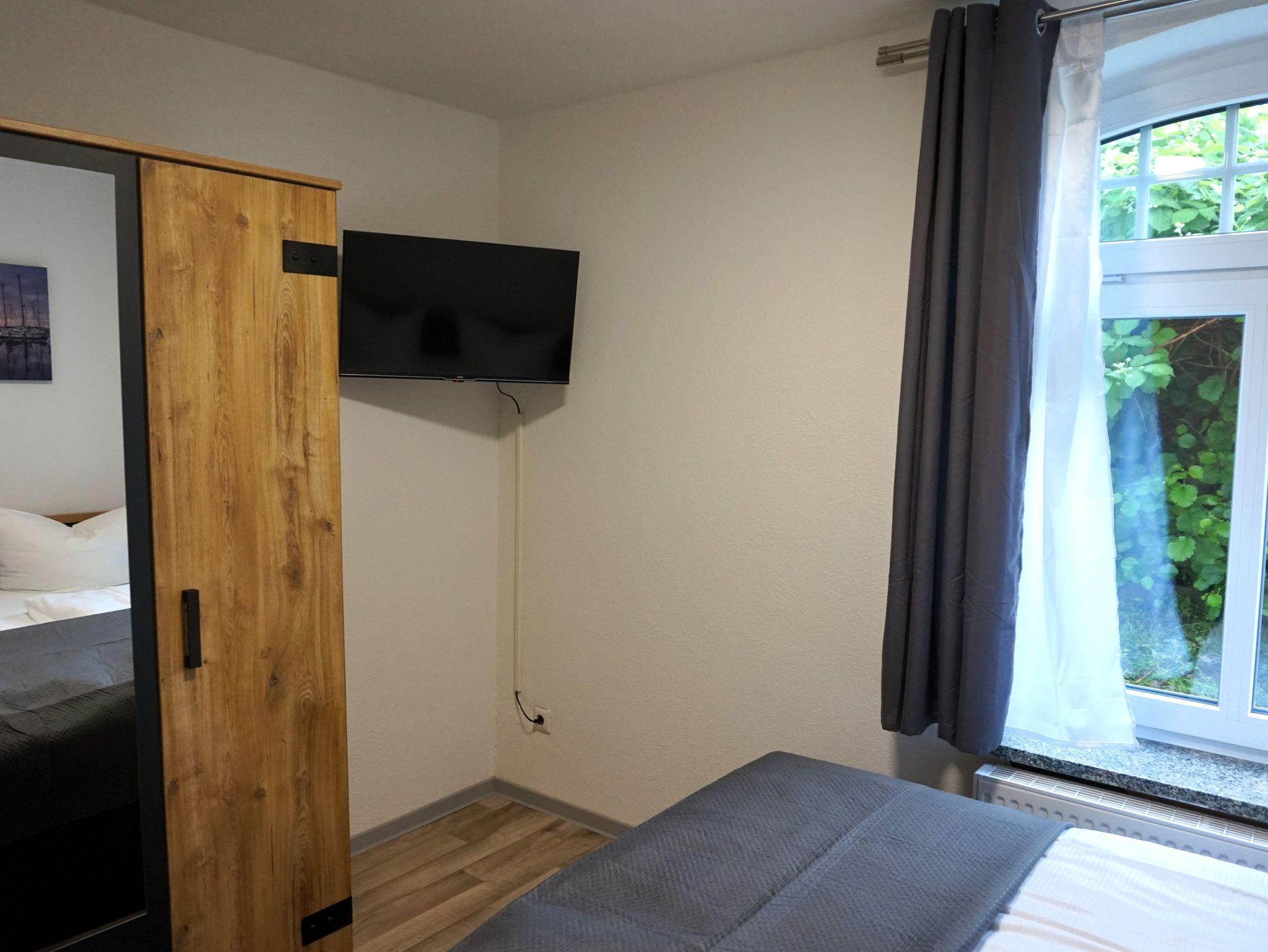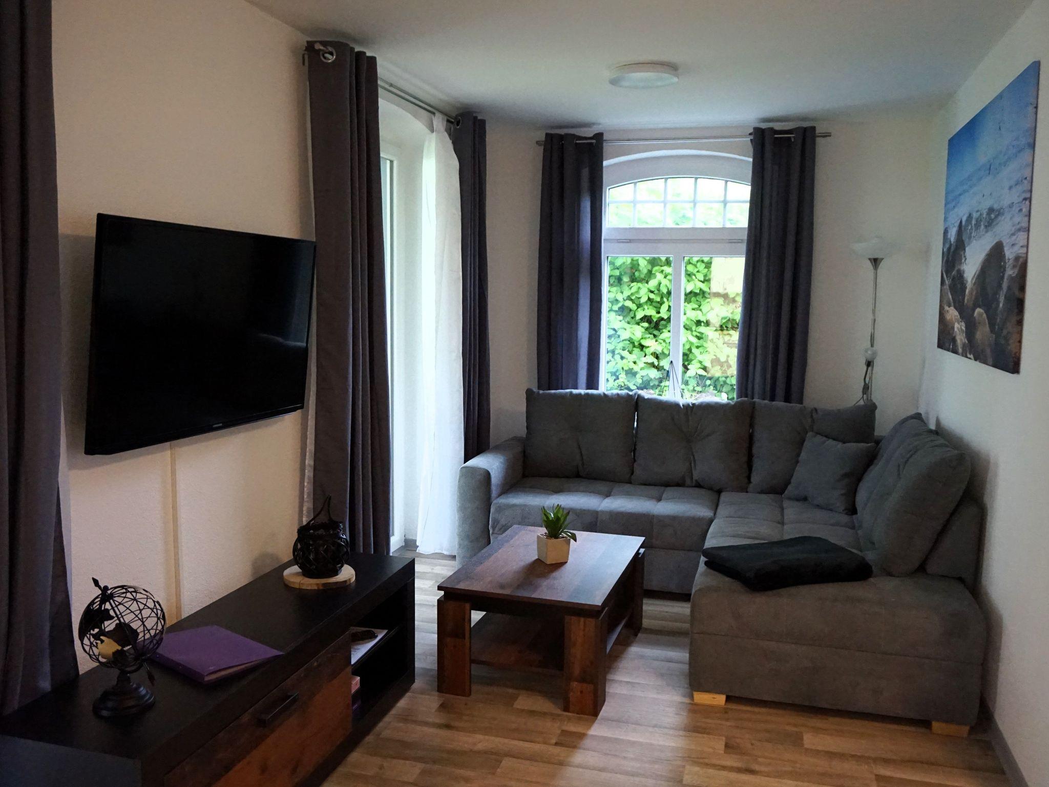 Die funktional gestaltete Ferienwohnung im Erdgeschoss hat ein Wohnzimmer mit Essecke für 4 Personen, eine kleine Küche, ein Schlafzimmer mit Doppelbett, ein Gästezimmer mit Boxspringbett und eine Terrasse. Die kleine Küche ist mit 4-Platten-Ceranfeld, Backofen, Kühlschrank mit Gefrierfach, Mikrowelle, Geschirrspüler, Kaffeemaschine und div. Geschirr ausgestattet. Ein Bad mit Fenster, Dusche, Waschbecken und WC komplettieren den guten Gesamteindruck der Wohnung.