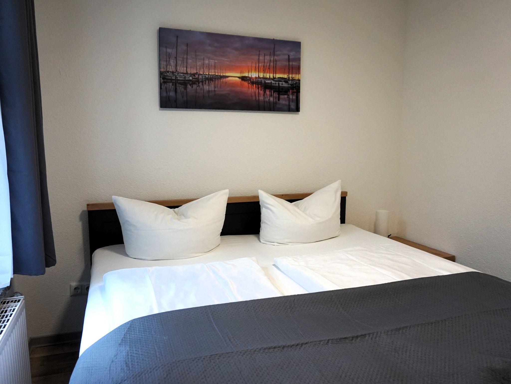Nur 150 m vom Strand wohnen Sie in einer 3-Raum-Ferienwohnung. Die 55 qm große Wohnung liegt im Erdgeschoss. Das Wohnzimmer ist mit einer Couch, Couchtisch, Anrichte, Kabel-TV und Radio und Essbereich mit Tisch und Bänke ausgestattet. Die Terrasse mit Tisch und Stühle geht zur Ostseite. Im Schlafzimmer stehen ein Doppelbett und ein Kleiderschrank. Im Gästezimmer stehen ein Boxspringbett und ein kleine Anrichte. Die Küchenzeile wurde ausgestattet mit Mikrowelle, Kühlschrank mit Gefrierfach, Kaffeemaschine, Ceran-Kochfeld und Backofen, Geschirrspüler, Toaster und Wasserkocher. Das Bad mit Dusche und WC komplettiert die Wohnung.