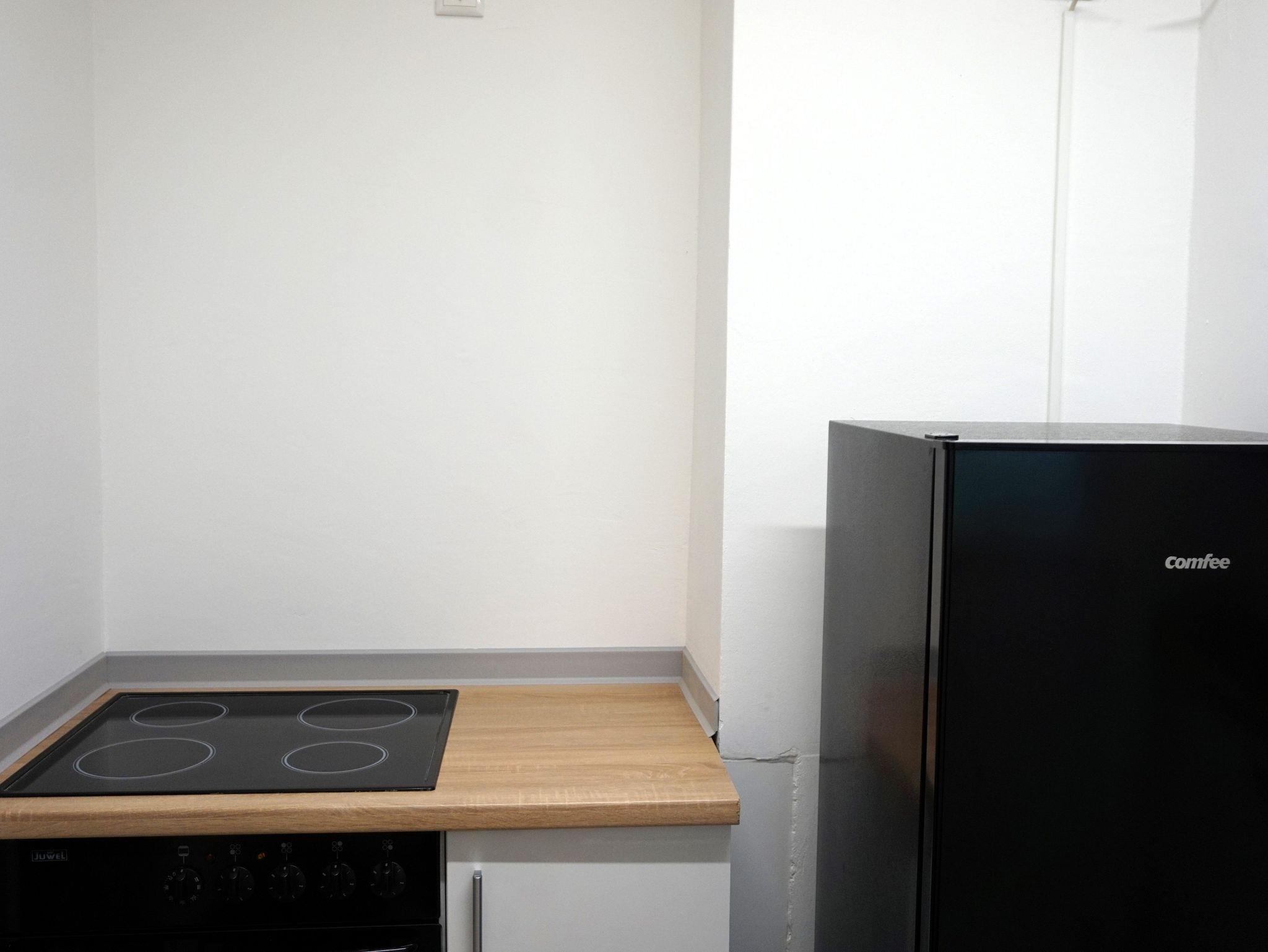 Küchezeile mit Mikrowelle, 4-Platten-Ceran-Herd, Kühlschrank, kleiner Gefrierschrank, Geschirrspüler und Kaffeemaschine