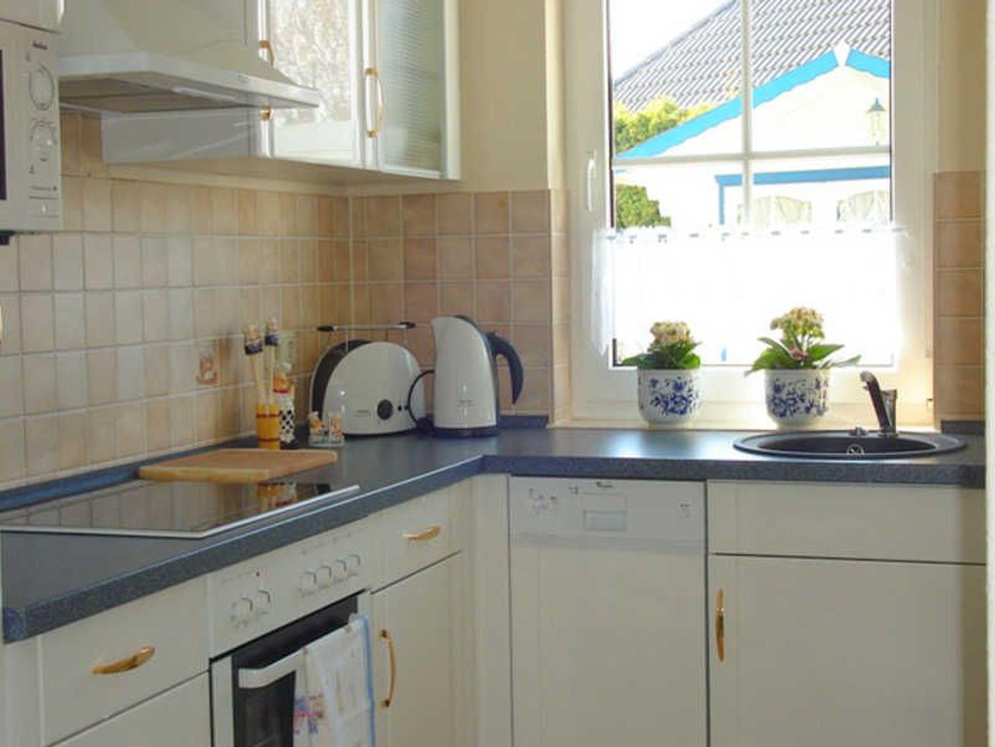 Direkt neben dem Wohnzimmer befindet sich die Essecke sowie eine komplett eingerichtete offene Küche mit Mikrowelle, 4-Zonen-Cerankochfeld, Herd und Geschirrspüler. Ausreichend Geschirr, Töpfe und Pfannen, Wasserkocher, Toaster, Kaffeemaschine usw. sind selbstverständlich vorhanden.