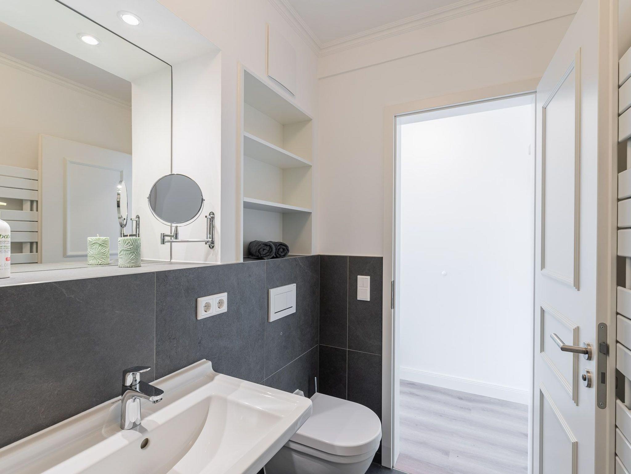 Das Bad verfügt über eine Dusche, einem Haartrockner und einem Handtuchtrockner. Zu Ihrem Apartment gehört ebenfalls ein großer und lichtdurchfluteter Wohn- und Essbereich mit offener Küche.