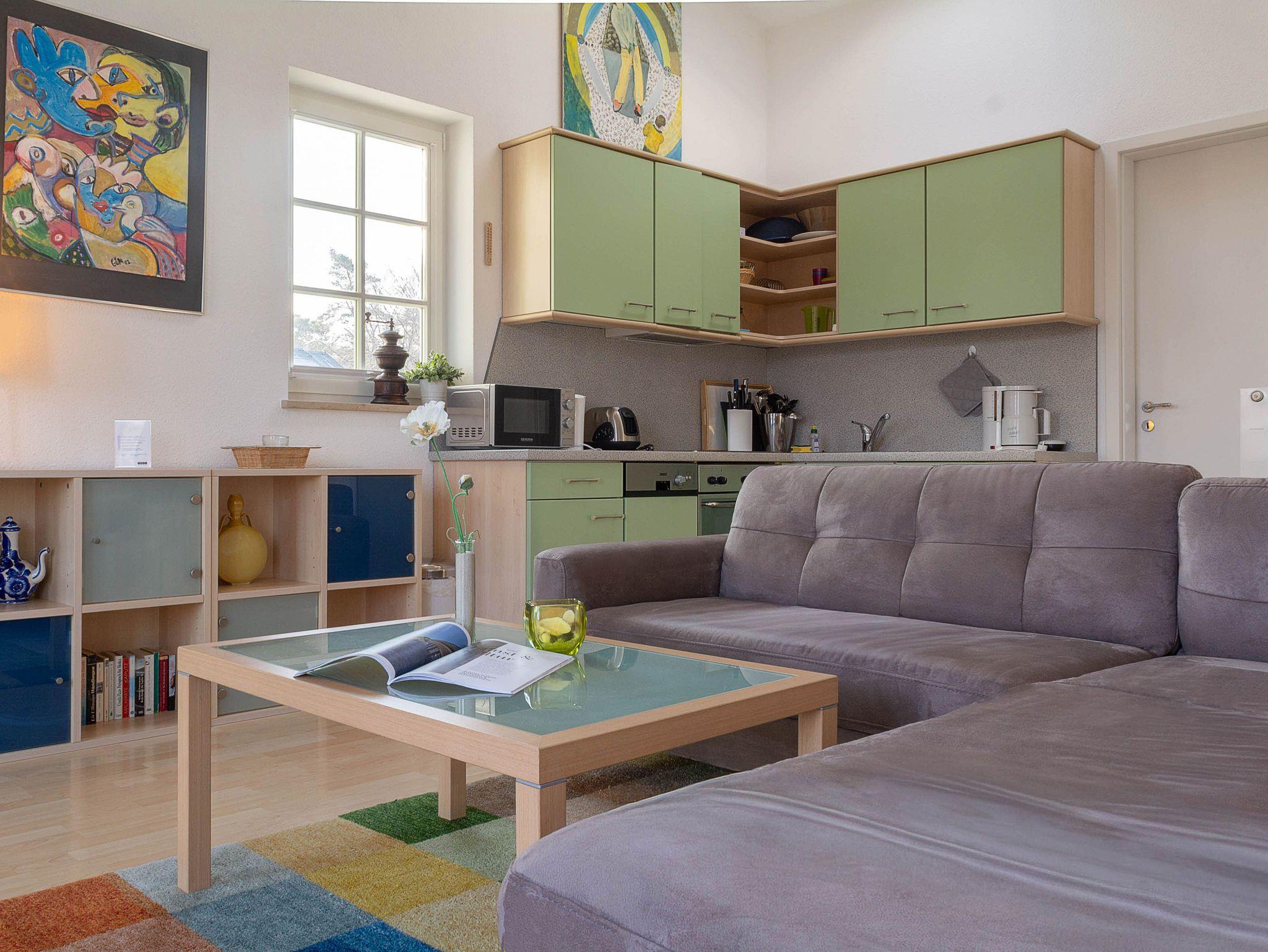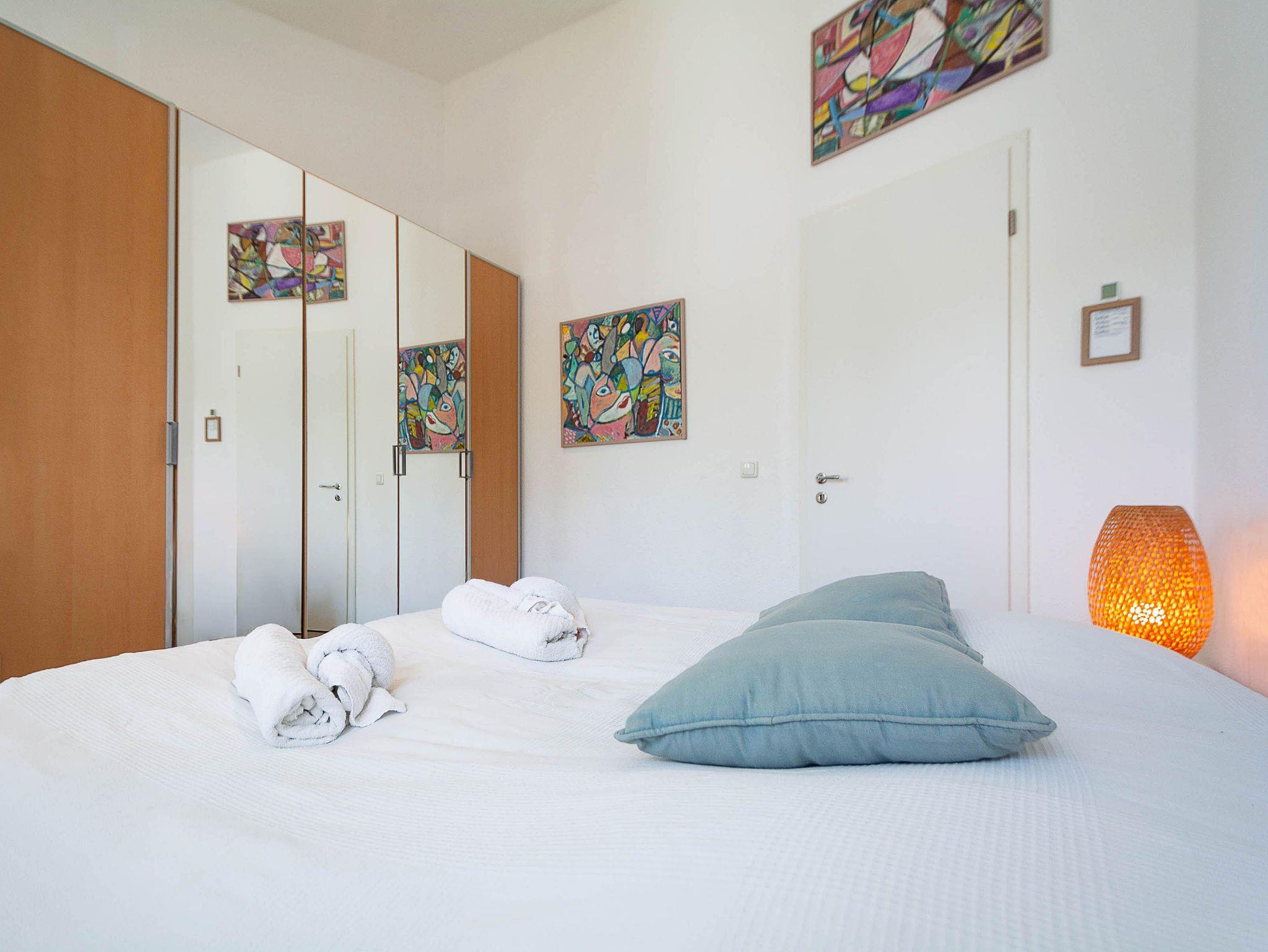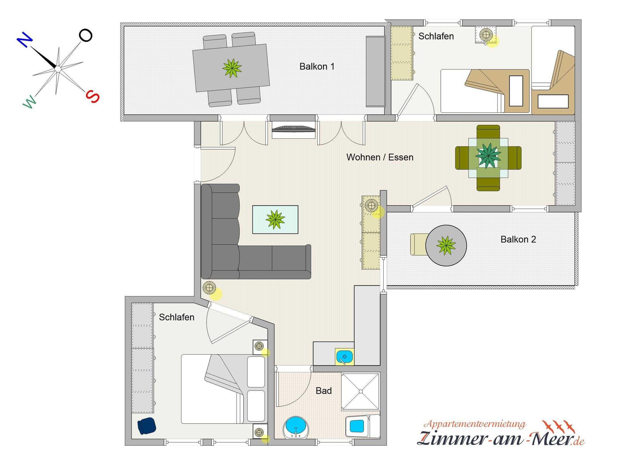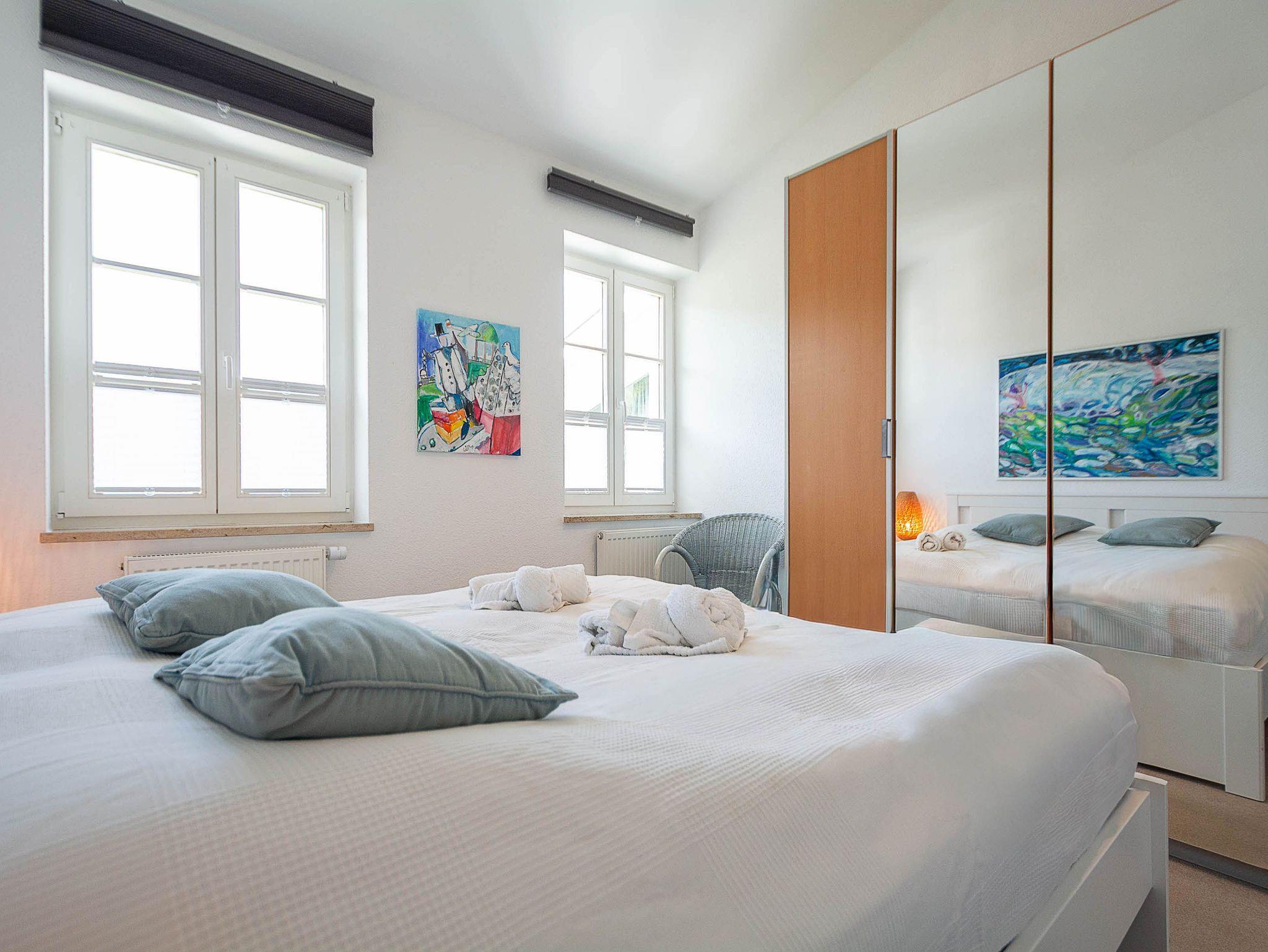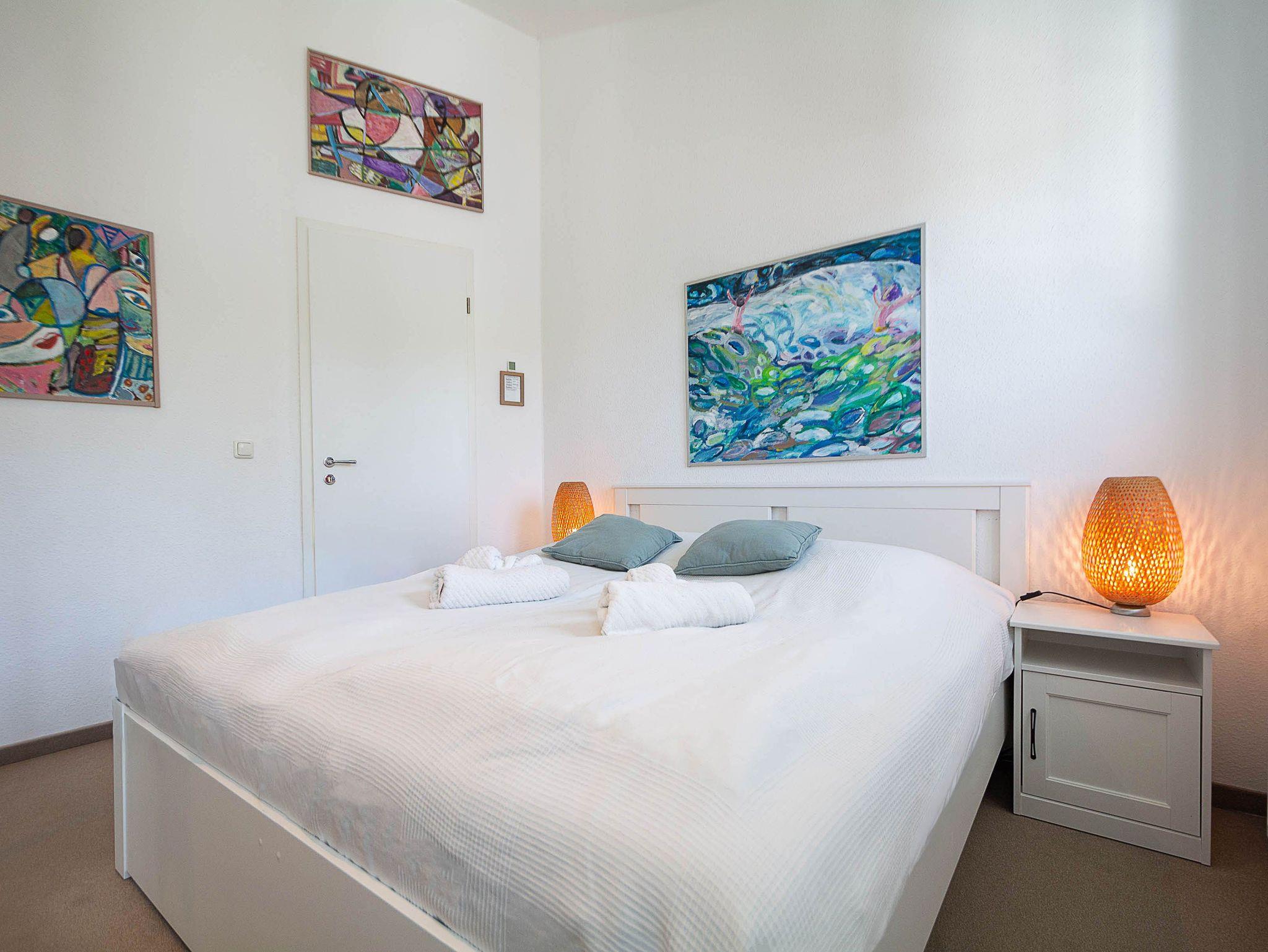 Sie erholen sich in einer wunderschönen 3-Raum-Wohnung von ca. 60 qm Größe, die sich im zweiten Obergeschoss der Villa Seeadler befindet. Der Wohnbereich ist ausgestattet mit Küchenzeile (Herd mit Backofen, Geschirrspüler, Kaffeemaschine, Mikrowelle, Wasserkocher), bequemer Sitzgruppe, Essecke und TV-Gerät. Die Wohnung verfügt über zwei Balkone, die vom Wohnbereich aus betreten werden können. Vom Balkon in Richtung Norden genießen Sie den Blick auf den Lindenpark. Der zweite Balkon zeigt in Richtung Süden und gibt den Blick auf den Stadtwald frei. Ein Schlafzimmer mit Doppelbett (160cm x 200 cm) und ein Schlafzimmer mit 2 Einzelbetten sowie das Bad mit Dusche und WC vervollständigen das Gesamtbild dieser Wohnung.