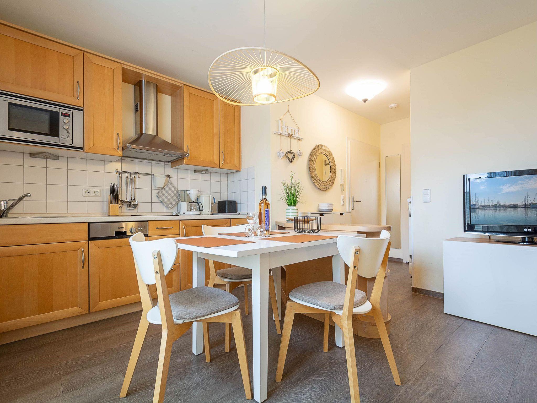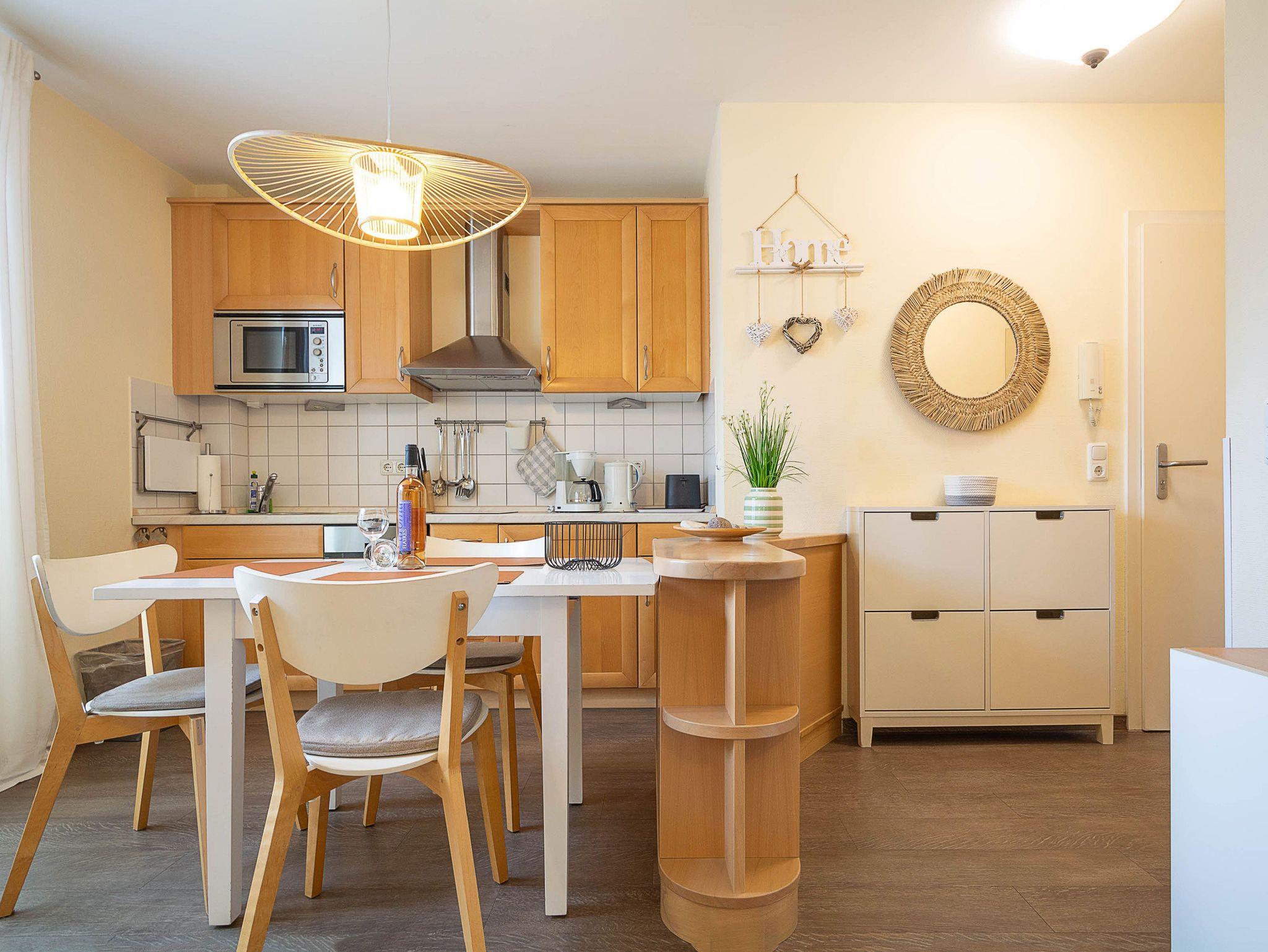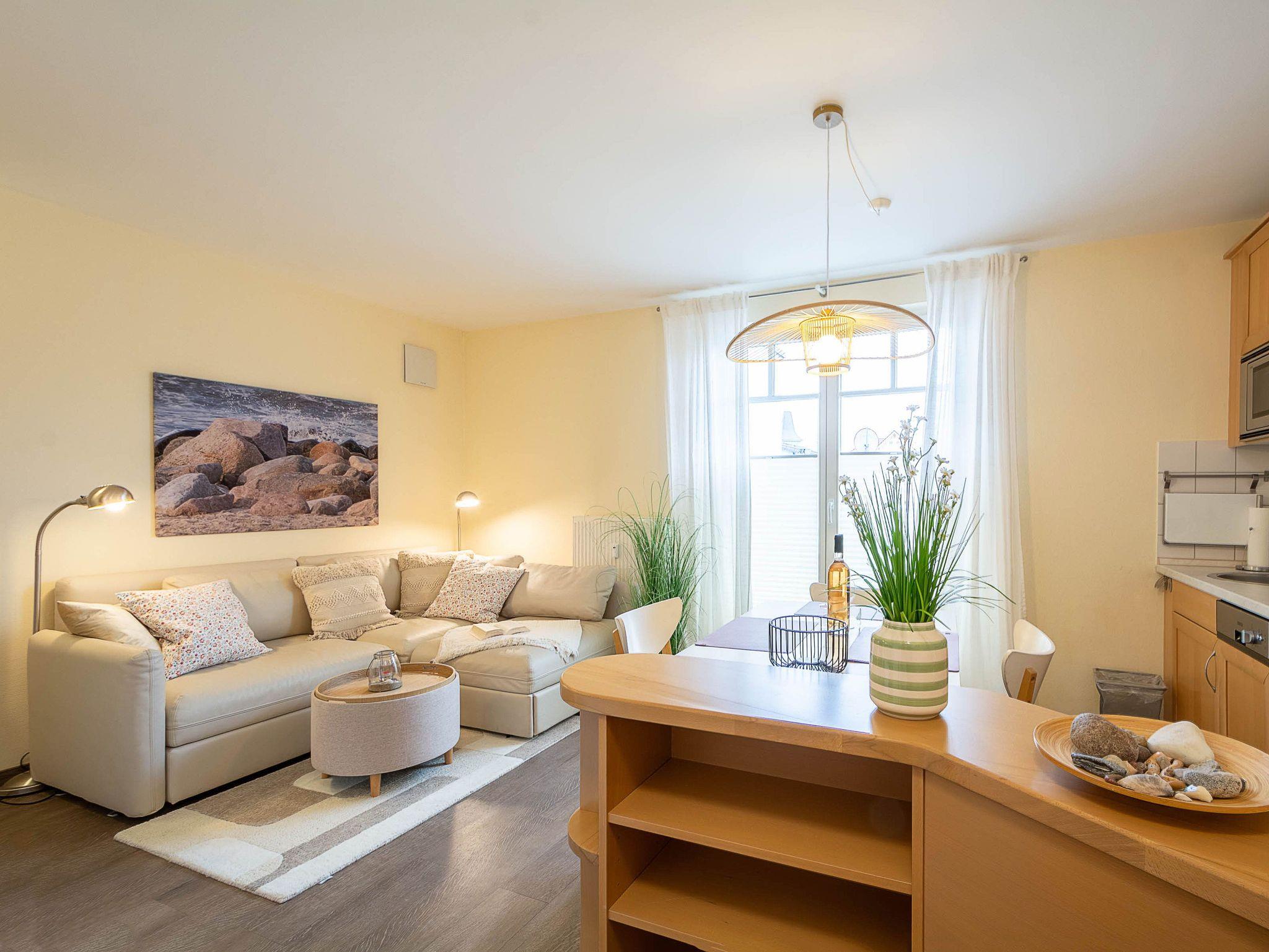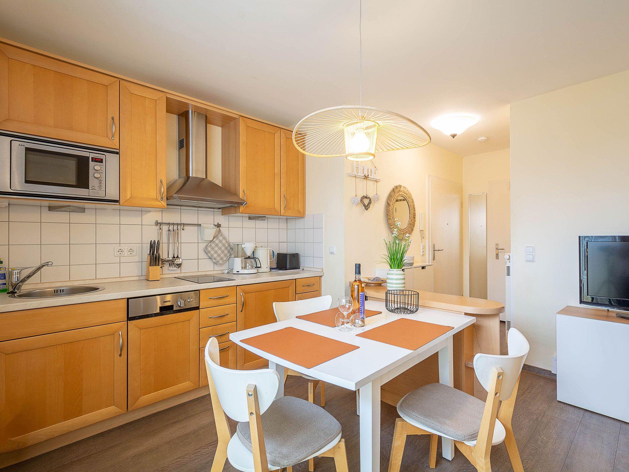 Sie erholen sich in einer 2-Raum-Ferienwohnung von ca. 40 m² Größe, die sich ersten Obergeschoss befindet und für max. zwei Erwachsene und ein Kind geeignet ist. Das helle freundliche Wohnzimmer ist ausgestattet mit einer bequemen Couchgarnitur. Das Sofa lässt sich in einen zusätzlichen Schlafplatz für 1 Person umwandeln (160 x 200 cm). Weiterhin ist der Wohnbereich ausgestattet mit Flachbild-TV, DVD-Player, Radio und CD-Player sowie einem Esstisch mit 4 Stühlen. Die im offenen Wohnbereich integrierte Küchenzeile ist ausgestattet mit allen wichtigen Küchengeräten und -utensilien, die Sie für Ihr perfektes Dinner benötigen (wie z.B. 2-Platten-Cerankochfeld, Dunstabzug, Geschirrspüler, Kühlschrank mit Gefrierfach, Kaffeemaschine, Wasserkocher und Toaster). Vom Wohnraum aus betreten Sie den Balkon in Richtung Süden, der zum Relaxen einlädt. Das Schlafzimmer ist ausgestattet mit einem Doppelbett (1,60 m x 2 m) und einem geräumigen Kleiderschrank, der genügend Platz für Ihre Urlaubsgarderobe bietet. Das geflieste Bad mit großem Spiegel und Kosmetikspiegel sowie mit Dusche, Waschtisch und WC bietet genügend Ablagefläche für Ihre Badutensilien.