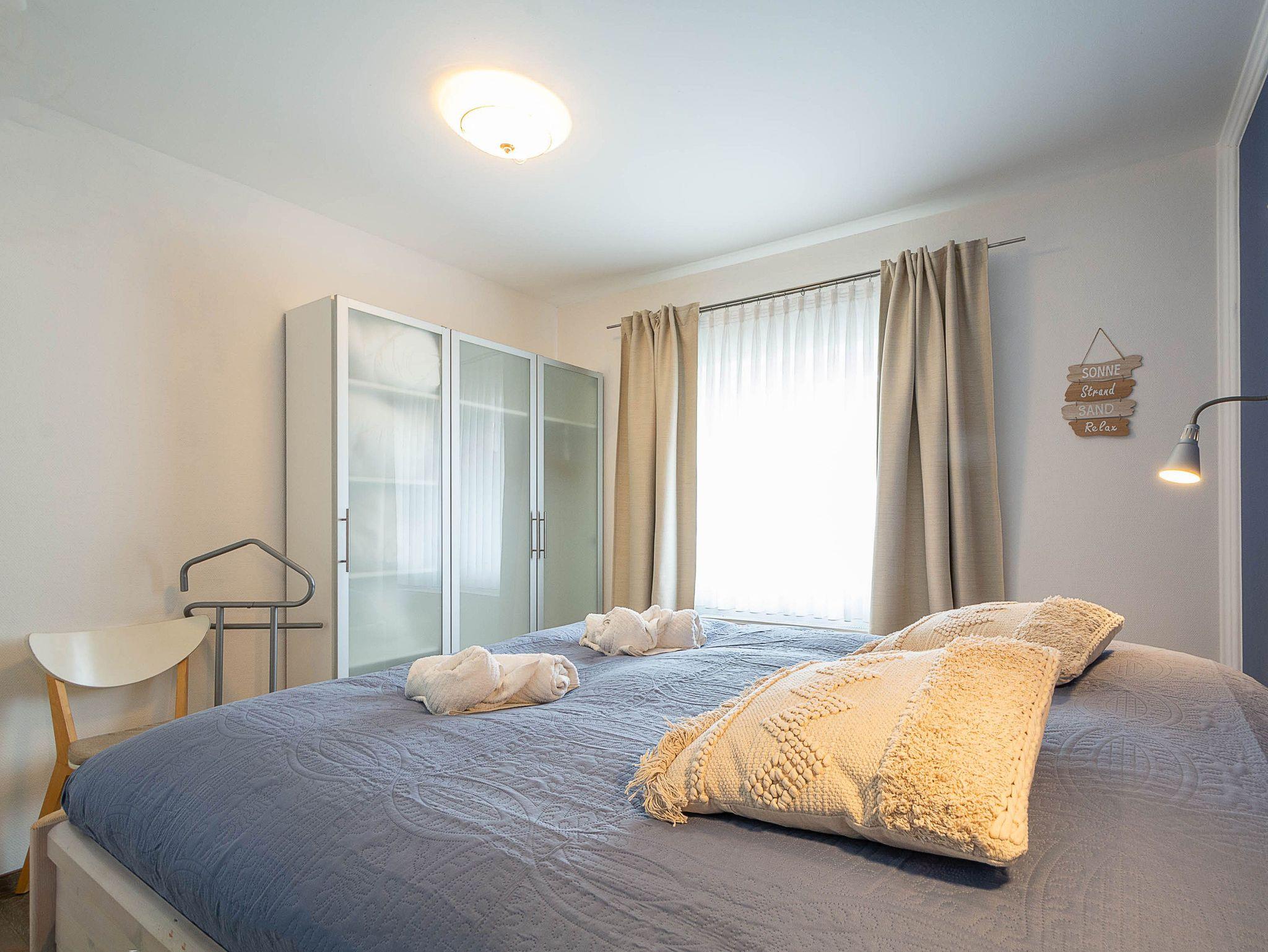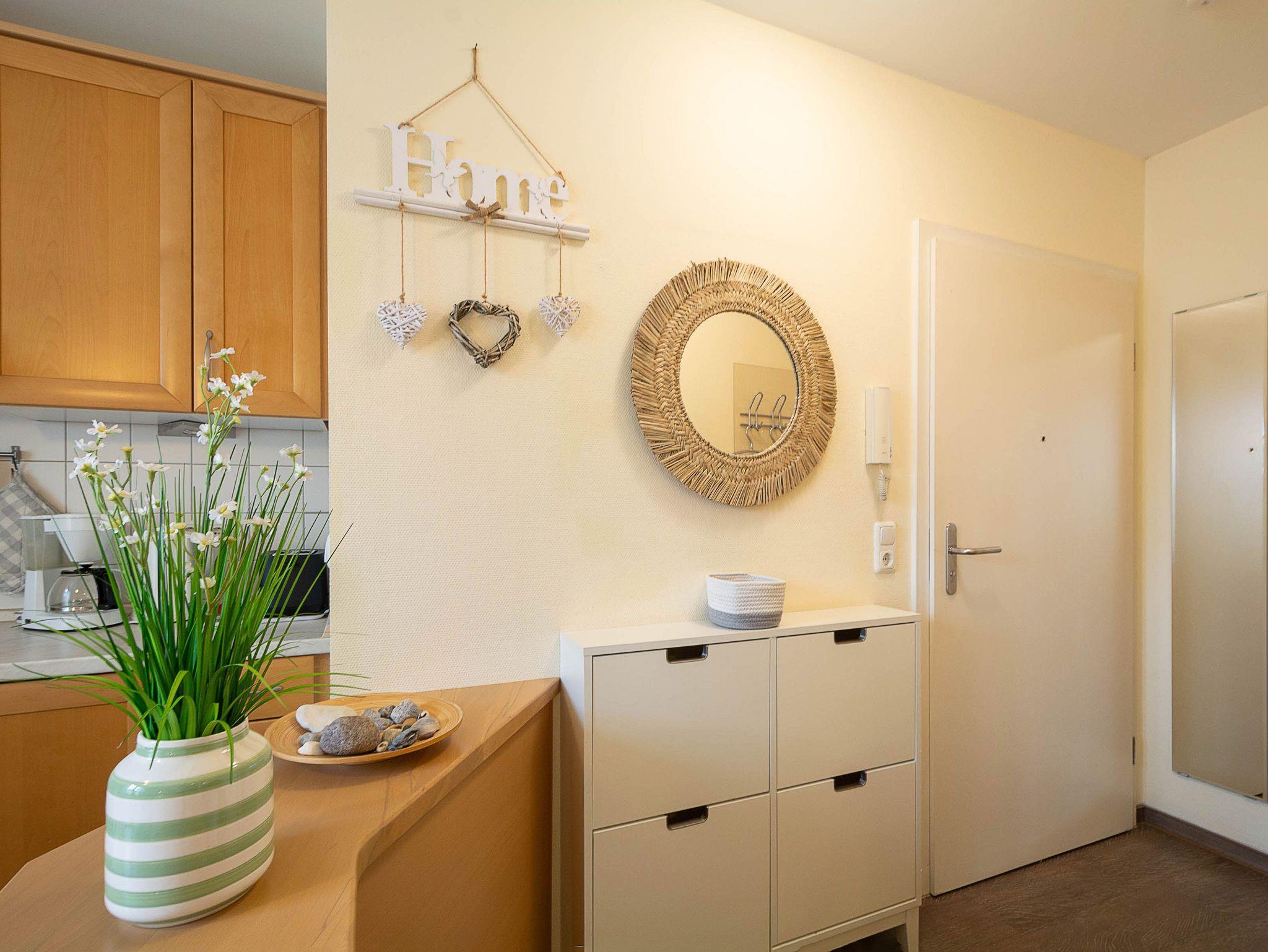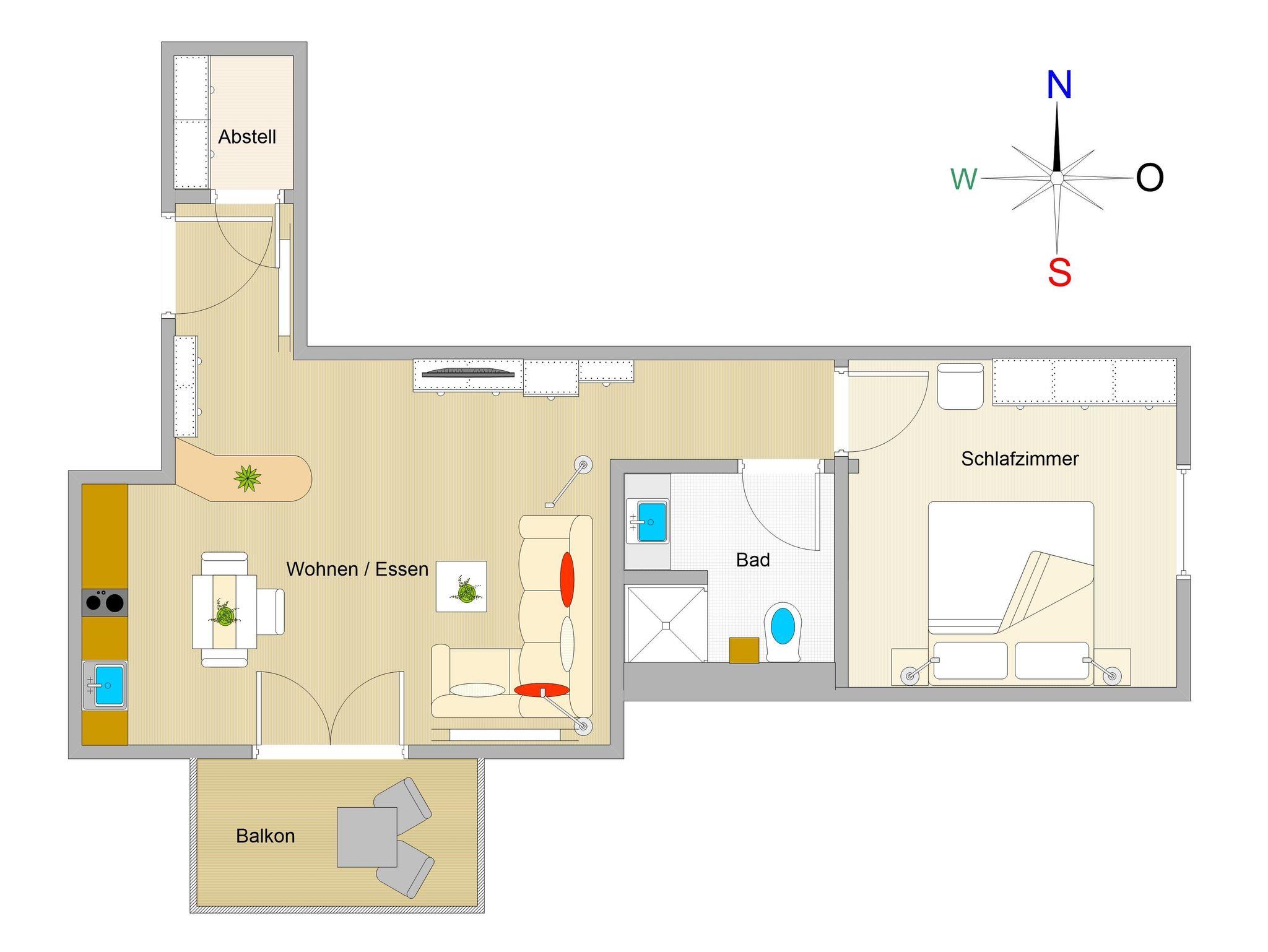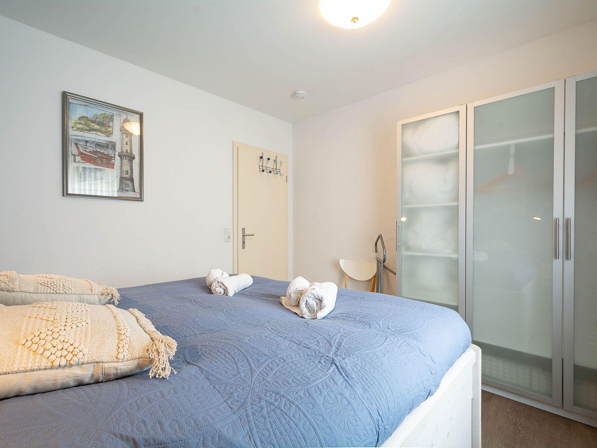 Sie erholen sich in einer 2-Raum-Ferienwohnung von ca. 40 m² Größe, die sich ersten Obergeschoss befindet und für max. zwei Erwachsene und ein Kind geeignet ist. Das helle freundliche Wohnzimmer ist ausgestattet mit einer bequemen Couchgarnitur. Das Sofa lässt sich in einen zusätzlichen Schlafplatz für 1 Person umwandeln (160 x 200 cm). Weiterhin ist der Wohnbereich ausgestattet mit Flachbild-TV, DVD-Player, Radio und CD-Player sowie einem Esstisch mit 4 Stühlen. Die im offenen Wohnbereich integrierte Küchenzeile ist ausgestattet mit allen wichtigen Küchengeräten und -utensilien, die Sie für Ihr perfektes Dinner benötigen (wie z.B. 2-Platten-Cerankochfeld, Dunstabzug, Geschirrspüler, Kühlschrank mit Gefrierfach, Kaffeemaschine, Wasserkocher und Toaster). Vom Wohnraum aus betreten Sie den Balkon in Richtung Süden, der zum Relaxen einlädt. Das Schlafzimmer ist ausgestattet mit einem Doppelbett (1,60 m x 2 m) und einem geräumigen Kleiderschrank, der genügend Platz für Ihre Urlaubsgarderobe bietet. Das geflieste Bad mit großem Spiegel und Kosmetikspiegel sowie mit Dusche, Waschtisch und WC bietet genügend Ablagefläche für Ihre Badutensilien.