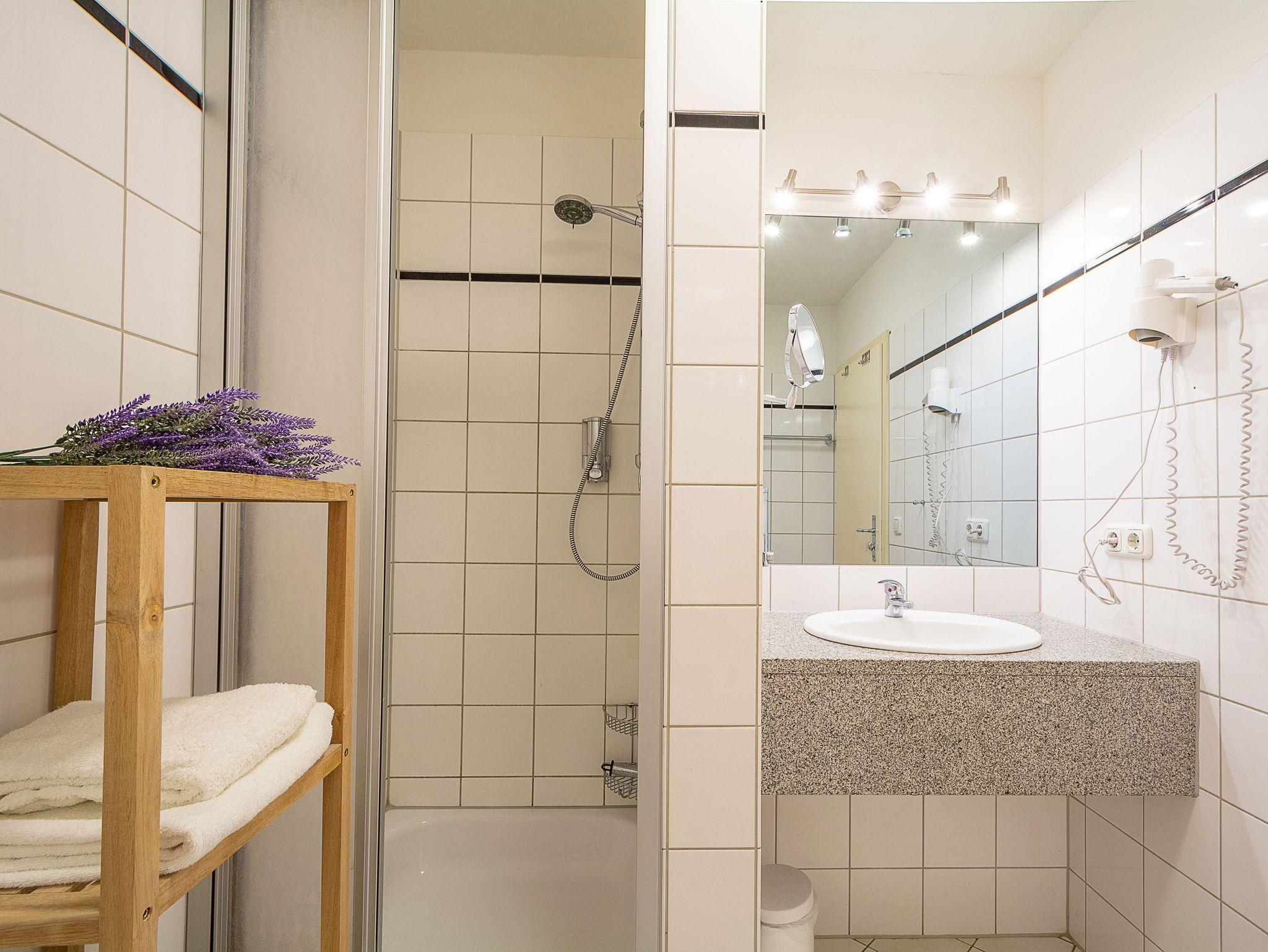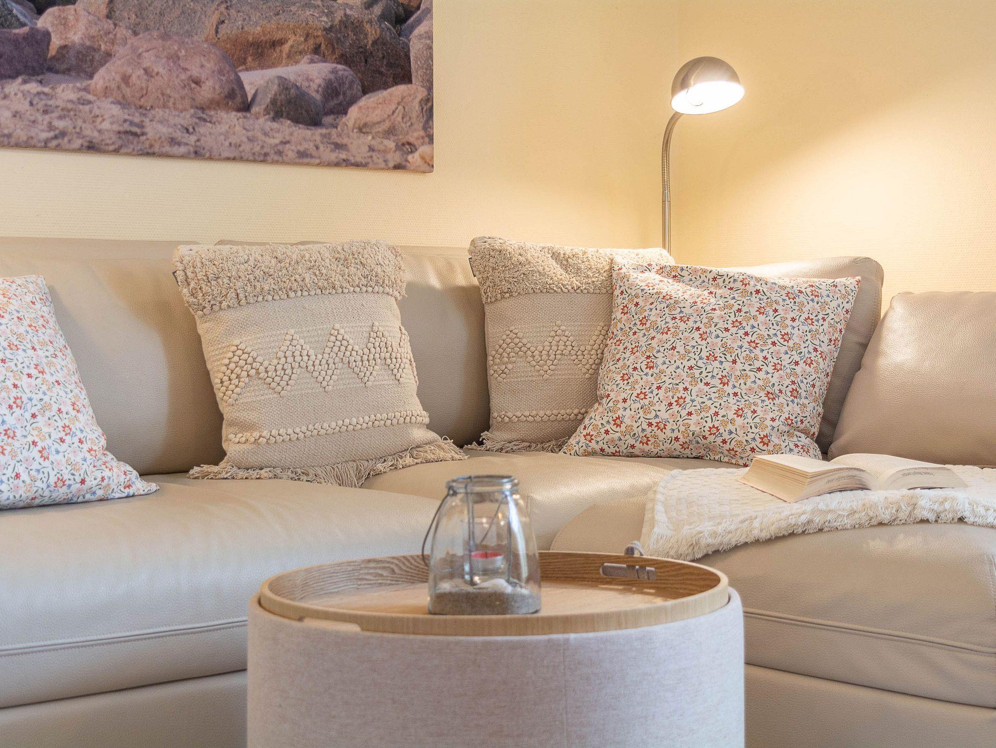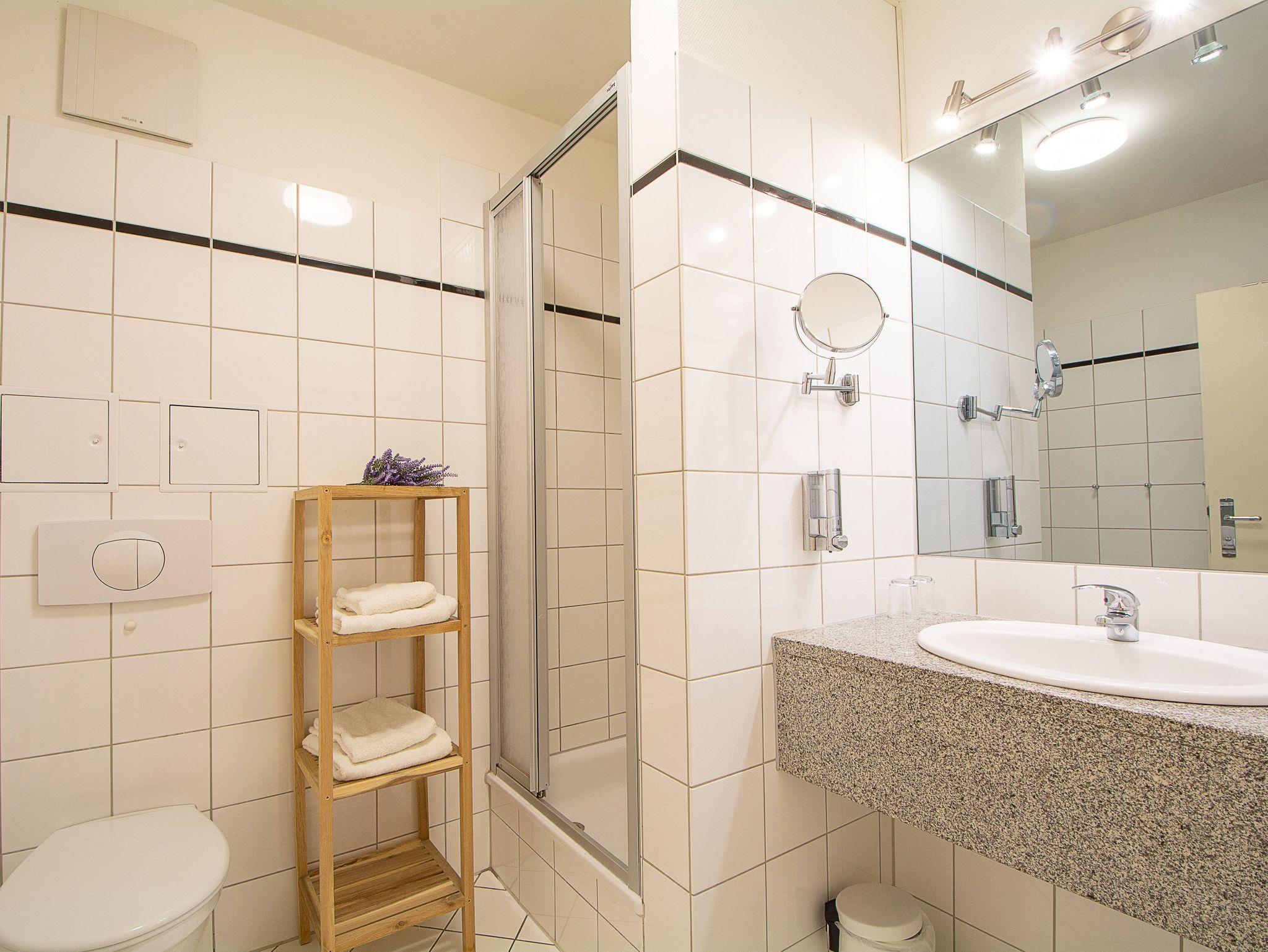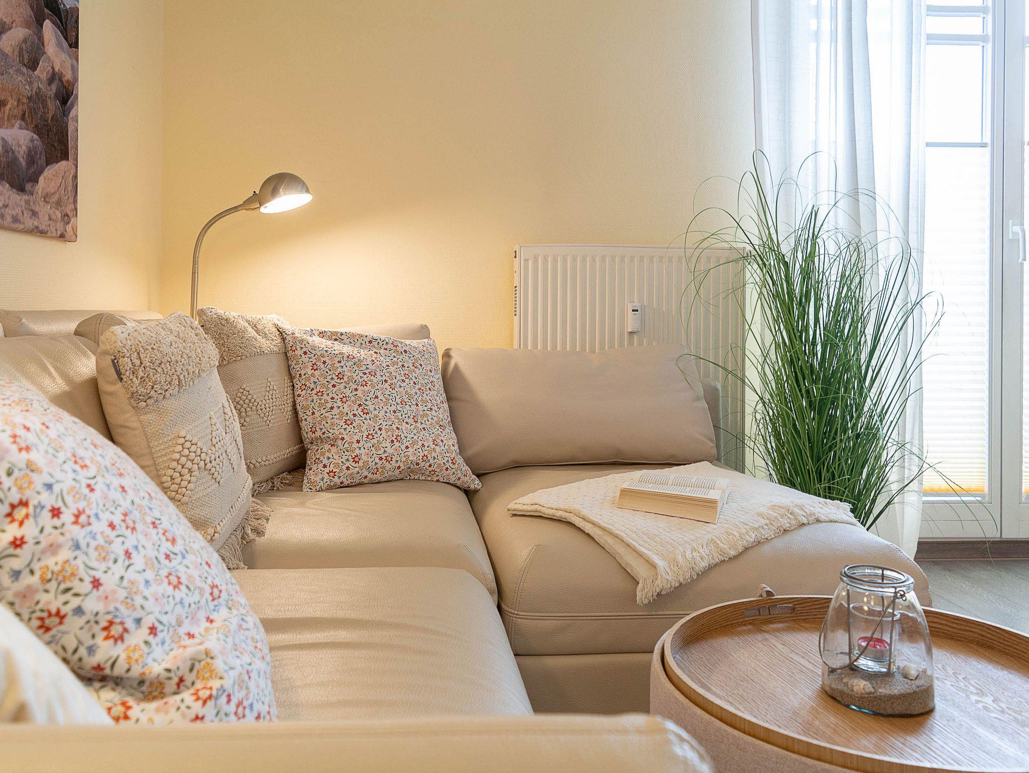 Sie erholen sich in einer 2-Raum-Ferienwohnung von ca. 40 m² Größe, die sich ersten Obergeschoss befindet und für max. zwei Erwachsene und ein Kind geeignet ist. Das helle freundliche Wohnzimmer ist ausgestattet mit einer bequemen Couchgarnitur. Das Sofa lässt sich in einen zusätzlichen Schlafplatz für 1 Person umwandeln (160 x 200 cm). Weiterhin ist der Wohnbereich ausgestattet mit Flachbild-TV, DVD-Player, Radio und CD-Player sowie einem Esstisch mit 4 Stühlen. Die im offenen Wohnbereich integrierte Küchenzeile ist ausgestattet mit allen wichtigen Küchengeräten und -utensilien, die Sie für Ihr perfektes Dinner benötigen (wie z.B. 2-Platten-Cerankochfeld, Dunstabzug, Geschirrspüler, Kühlschrank mit Gefrierfach, Kaffeemaschine, Wasserkocher und Toaster). Vom Wohnraum aus betreten Sie den Balkon in Richtung Süden, der zum Relaxen einlädt. Das Schlafzimmer ist ausgestattet mit einem Doppelbett (1,60 m x 2 m) und einem geräumigen Kleiderschrank, der genügend Platz für Ihre Urlaubsgarderobe bietet. Das geflieste Bad mit großem Spiegel und Kosmetikspiegel sowie mit Dusche, Waschtisch und WC bietet genügend Ablagefläche für Ihre Badutensilien.